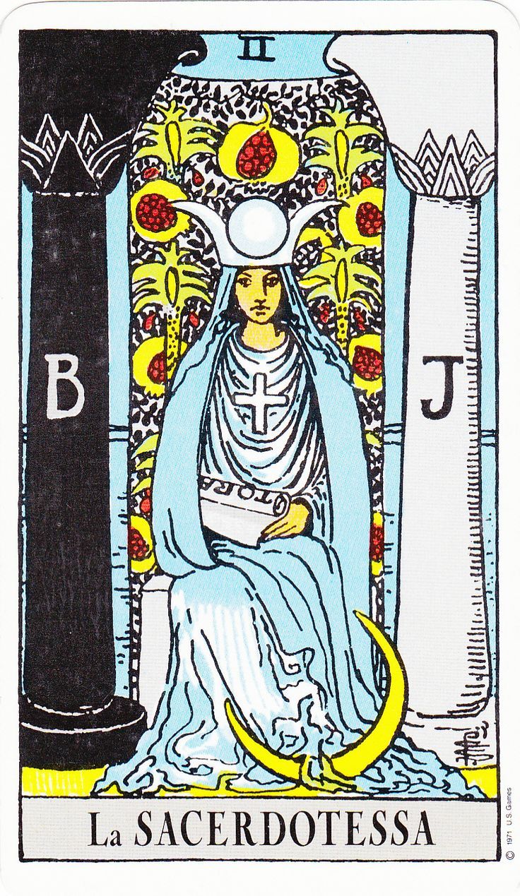 As a symbol of absolute purity, the popes is the first woman we meet in the Major Arcana. She represents the feminine principle from which consciousness is born. She is a majestic, calm-looking woman and holds an open book in her hand, the symbol of her knowledge. Her face is extremely pale; often this card alludes to the presence of a female figure in the life of the counsellor who has imparted an ideal of purity or dogmatic austerity: she is a cold woman, incapable of gentleness, but at the same time of immense spiritual greatness. If the Pope could speak in her seclusion, she would tell us to detach ourselves from events and observe her as a passer-by would observe her. She would invite us to wait, to isolate, to be alone and to choose. To cultivate ourselves and who we are apart from everyone. To study. To train our intuition and then act, yes, but always more inwardly than outwardly.