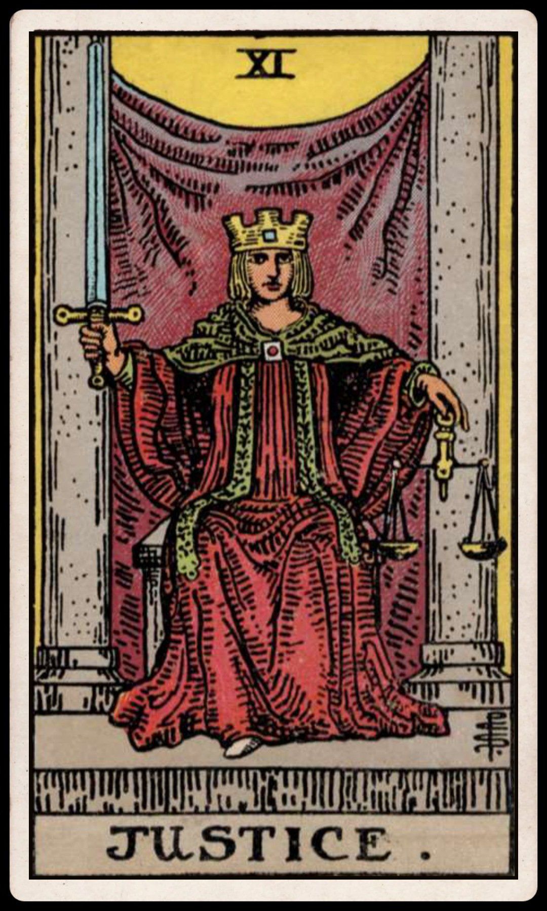Justice symbolises perfection, fulfilment and balance. Says Jodorowsky in "The Way of the Tarot", our favourite handbook par excellence: "It reveals such a strong need for perfection that it conditions the counsellor when he tries to realise any work". But beware: we know very well that perfection and the desire for perfection are not human and that anything that is perfect is also somehow immovable, unchanging and therefore somewhat lifeless. Instead, this woman we are watching is very human: this is revealed to us by the tone of her hair, which is perfectly flesh-pink, and her dress, which sinks to the floor as if tying her to an earthly dimension. If justice could speak, it would tell us to give ourselves what we deserve and immediately distance ourselves from what we do not want. It would teach us when to say yes and when to say no. That we should think about the consequences of our actions, but pay attention! Long before we act. To evaluate situations rationally. To judge and criticise constructively without hurting others. To be fair.