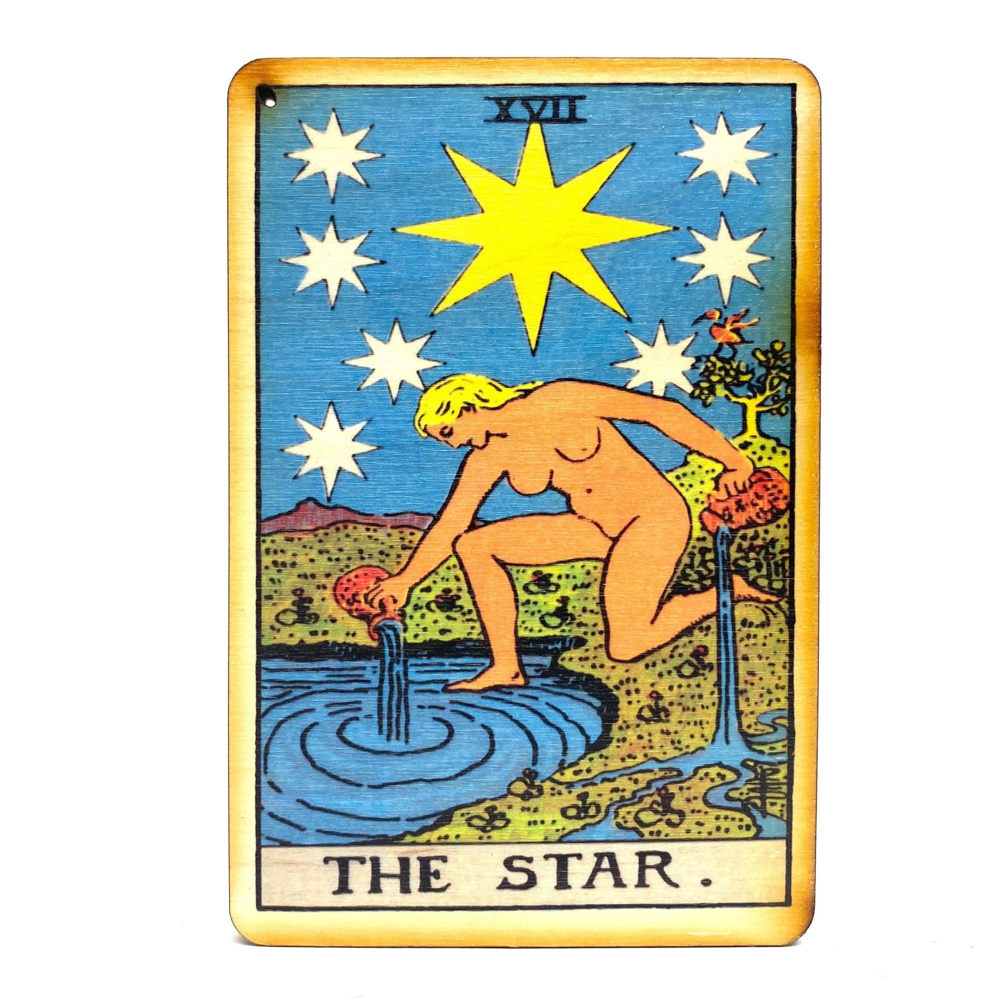 The Star represents a naked woman under a starry sky: among the stars, a star. It is the first Arcanum to present itself in its nakedness, as if to tell us that it has nothing to hide, but only to find its place on earth. The woman's posture, kneeling and with her head bowed, suggests piety and submission, as if she is somehow devoted to the place where she settles; the same knee on the ground could suggest the fact that she is anchored somewhere, but also, I remember reading this interpretation, that she is completely in tune with the world. It is an arcana indicating that one has found one's place in this world to act, to beautify and to nourish it; it is a sign of happiness, prosperity and the fulfilment that is due to those who find their place. The water in the figure suggests the idea of purification and renewal. If the star could speak, it would tell us to relax: Everything is going well. Devote yourself to the care of body and soul. Cleanse yourself.