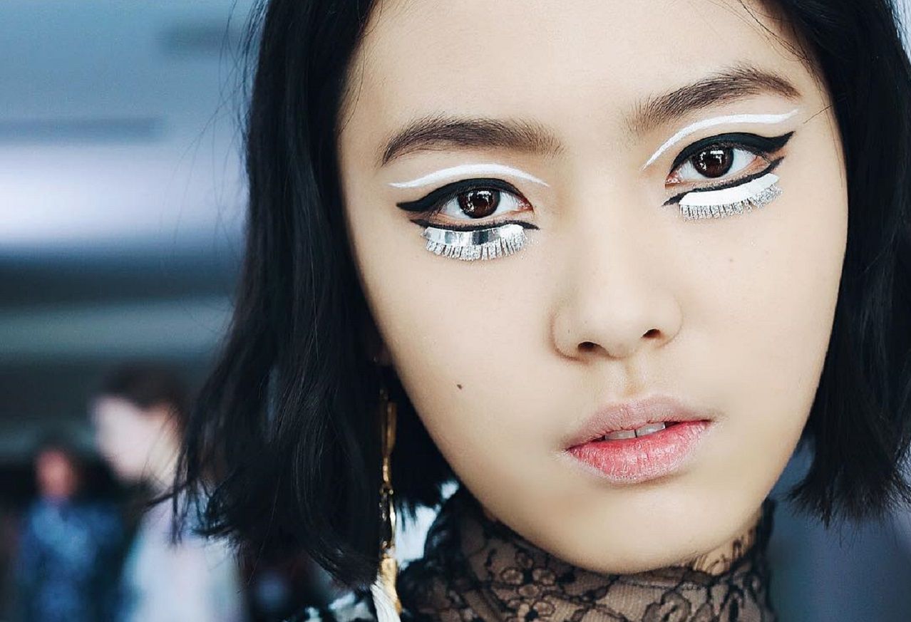 The podium definitely goes to Marine Serre, or rather, to Janeen Witherspoon, the make-up artist behind this incredible beauty look easy to propose and perfect for a party. With the support of MAC Cosmetics, Janeen has created an eye makeup using simply the black eyeliner and mini LEDs applied on the cheekbone. The secret of this make-up is to leave a space between the two thin lines that stretch and decorate the eye, very easy to reproduce.