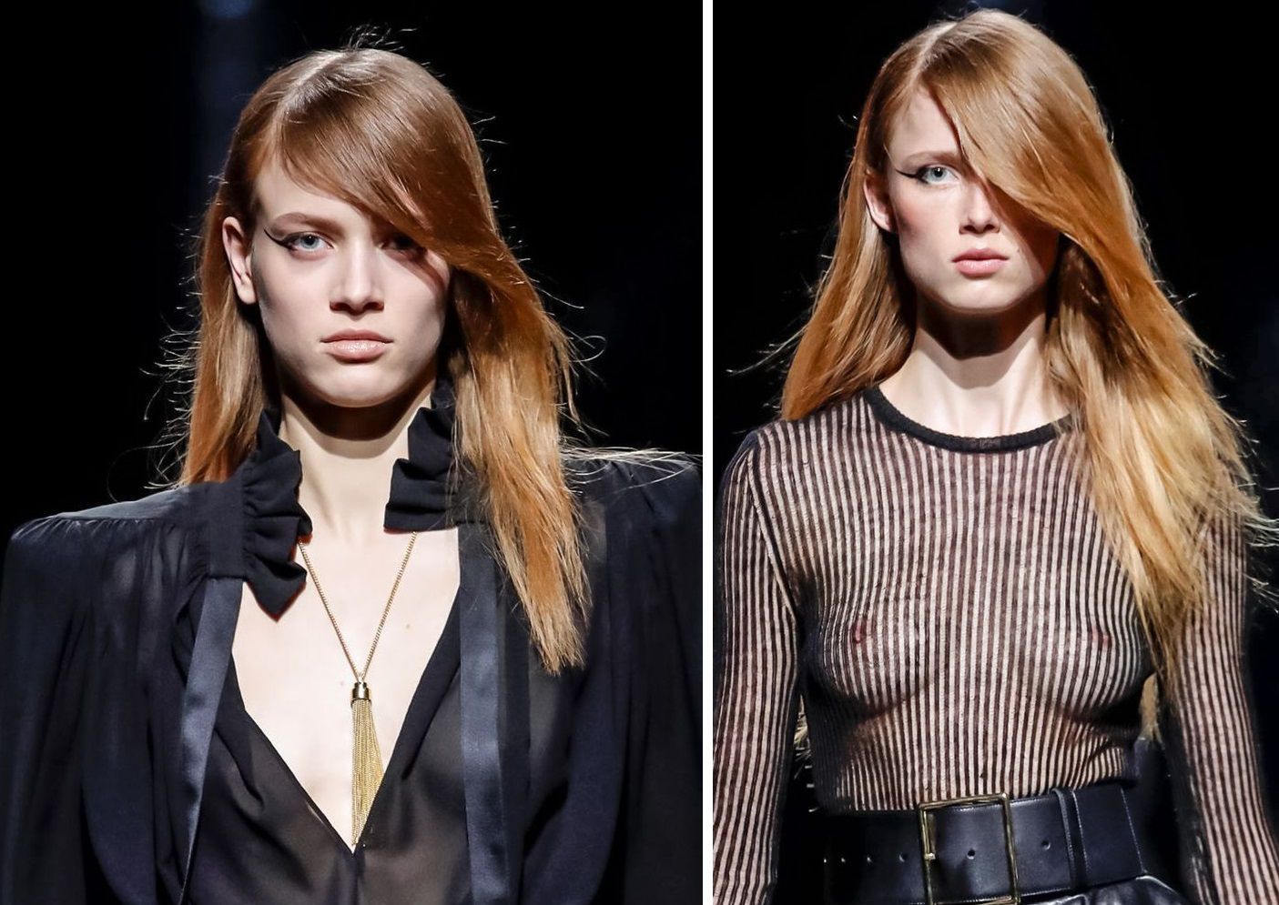 The tuft is coming back, word of Saint Laurent. During the show, in fact, the models showed off the catwalk rock 80s tuft: half face covered by the cut while on the other side you can see a hint, simple and casual make-up made with black pencil and peach blush on the cheeks.