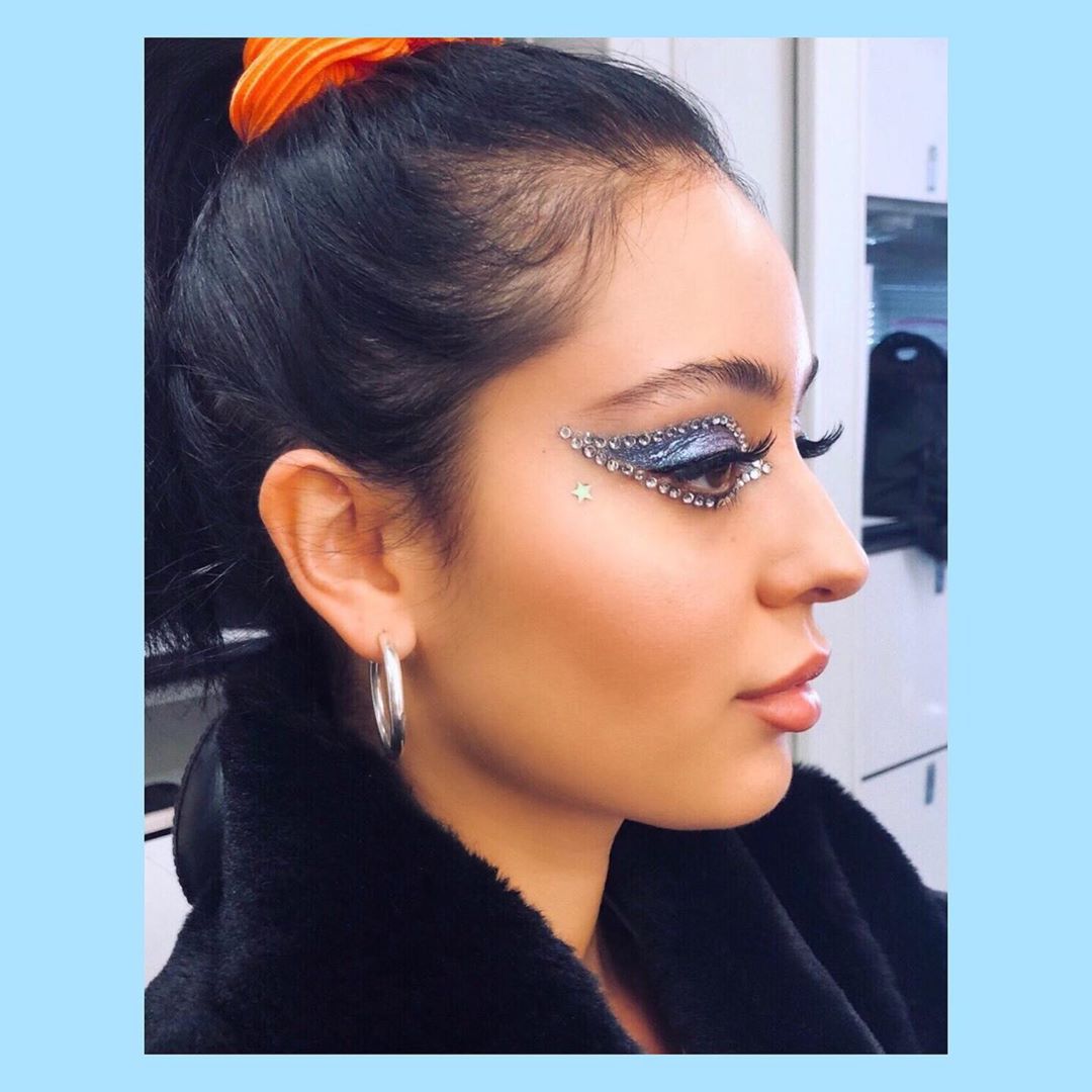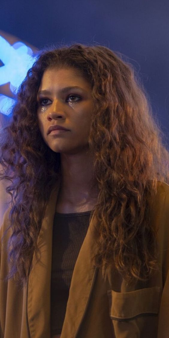 While at school the face of Rue (Zendaya) remains almost bare, when the character goes out she always wears a rhinestone-rich make-up at the bottom of her eyes. This last detail should be seen in a dramatic way since the use of these glitters represents the tears resulting from a painful crying. Just like Rue's head, her looks are also made to look messy and unkempt.