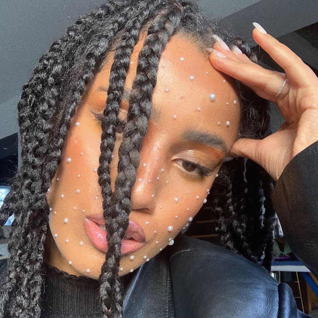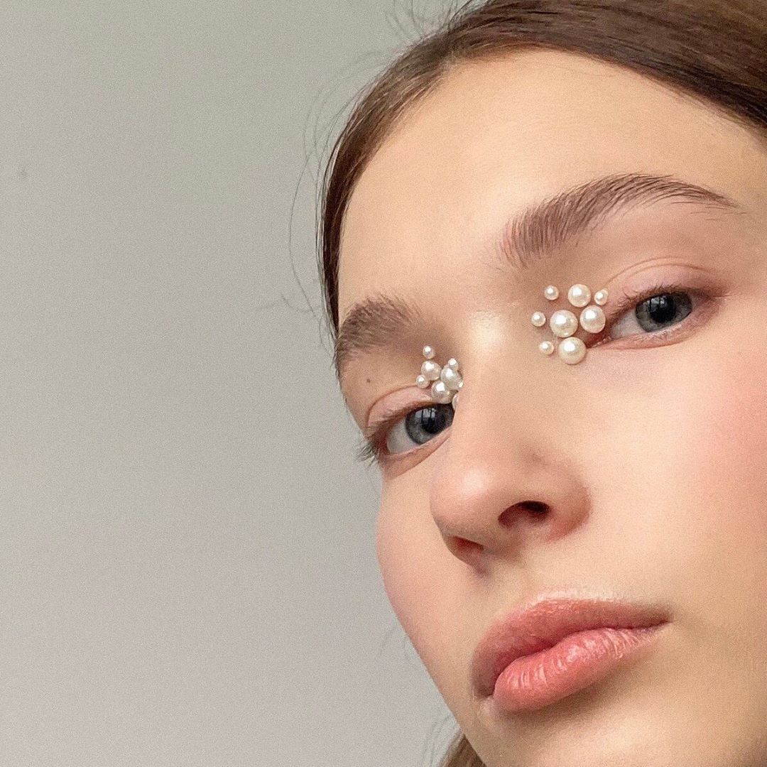 The size and the colour of the pearls is up to you, it depends on personal taste and type of makeup you want to recreate. In some beauty looks, pearls are all the same size and are lined up to create a graphic and linear design, in other cases pearls vary in sizes, disposition on the face, colour, free from patterns for a more personalized result.