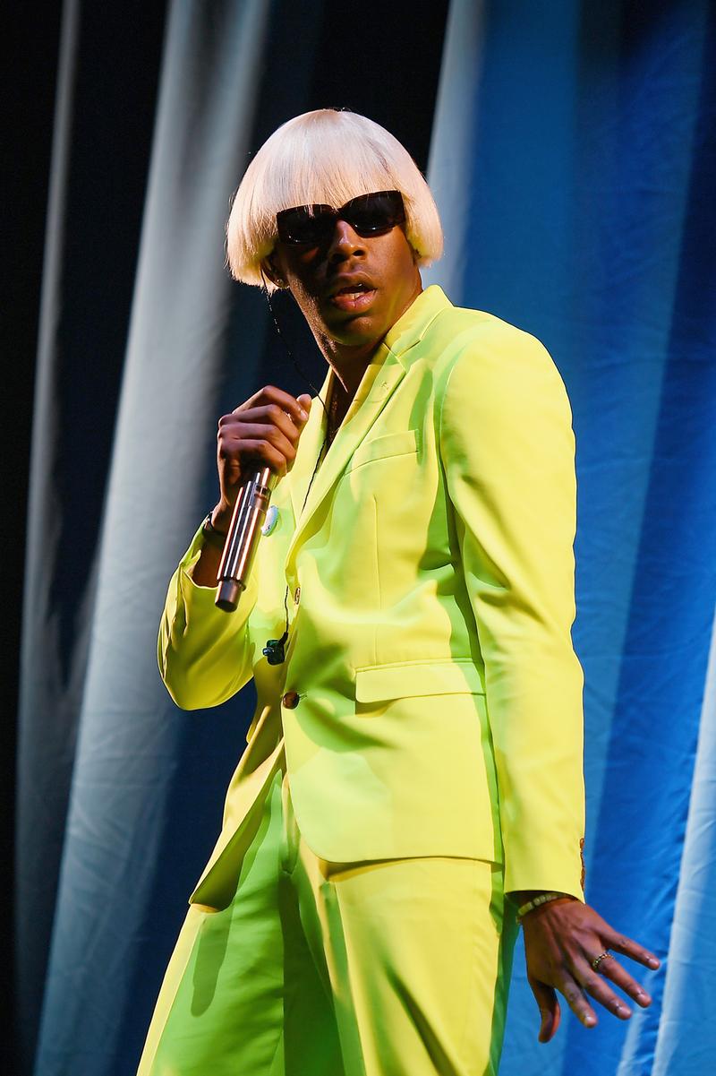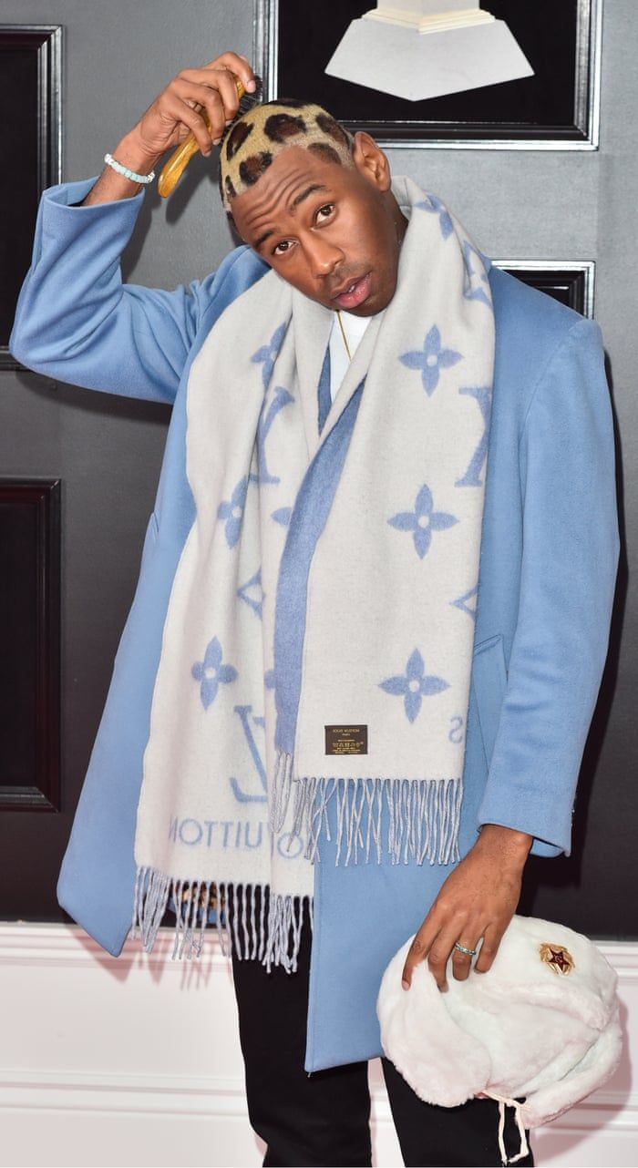 Tyler's looks are the most colourful of the rap scene, pastel and neon colours alternate on the star's outfits. Hair is the most important part of his beauty looks: the platinum blonde bob wig has become the symbol of the rapper's image, but also the animal shaved cut combined with a pastel blue LV outfit, shown during the 2018 Grammy Awards.