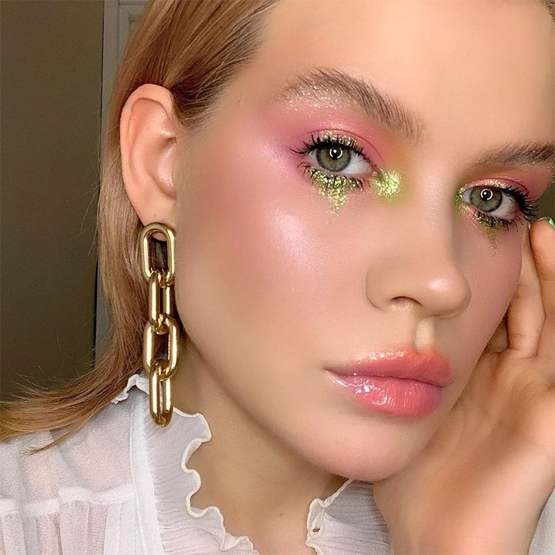 An ultra-wet and bright version of wet, the glossy make up wants glossy, extremely shiny and mirrored textures. The real essential product to make this make-up is not only the gloss, but also the primer, which should be applied to the entire upper eyelid, from the attachment of the eyelashes to the eyebrow arch.