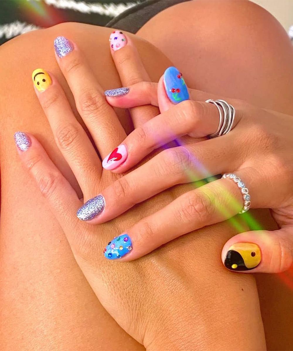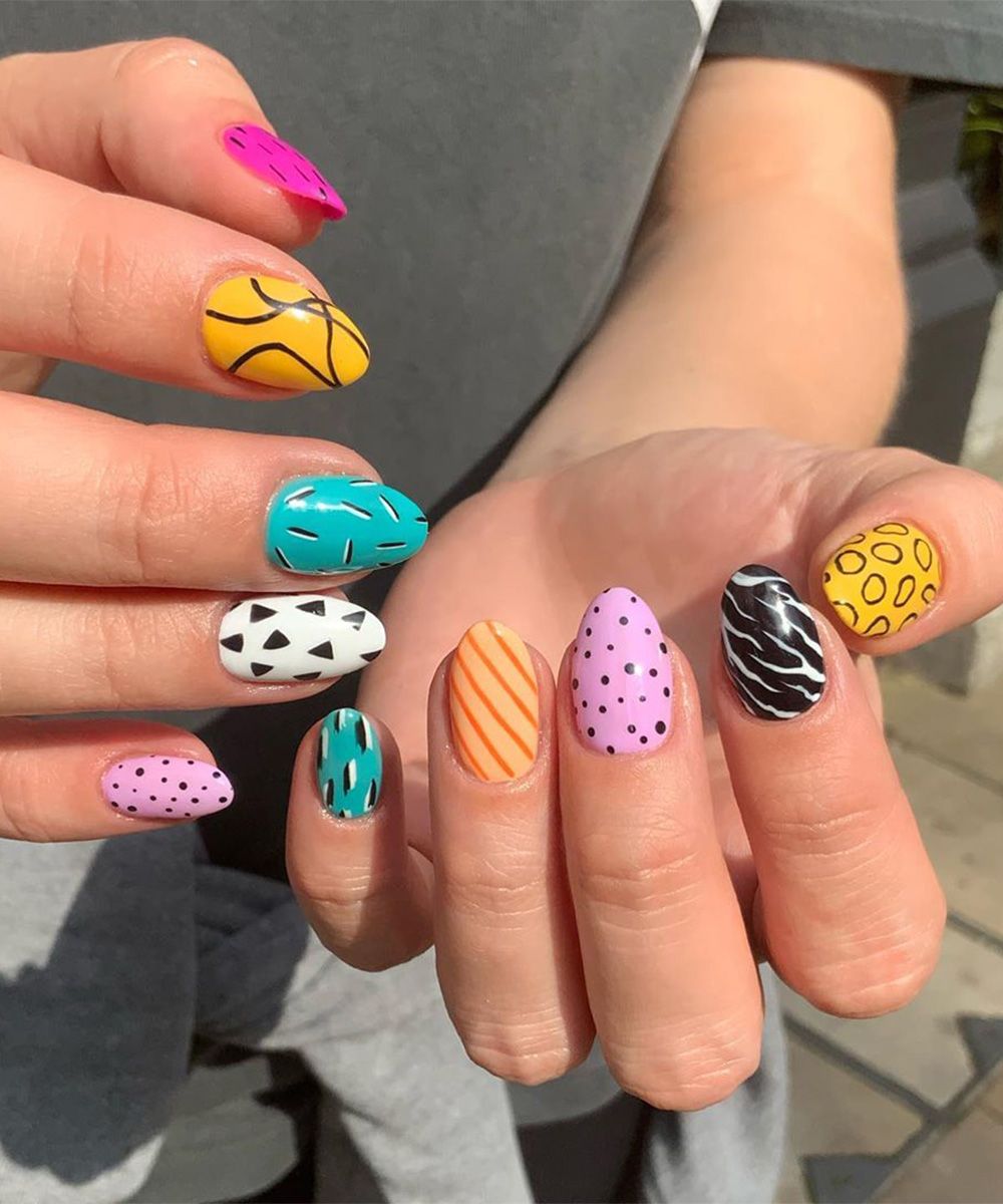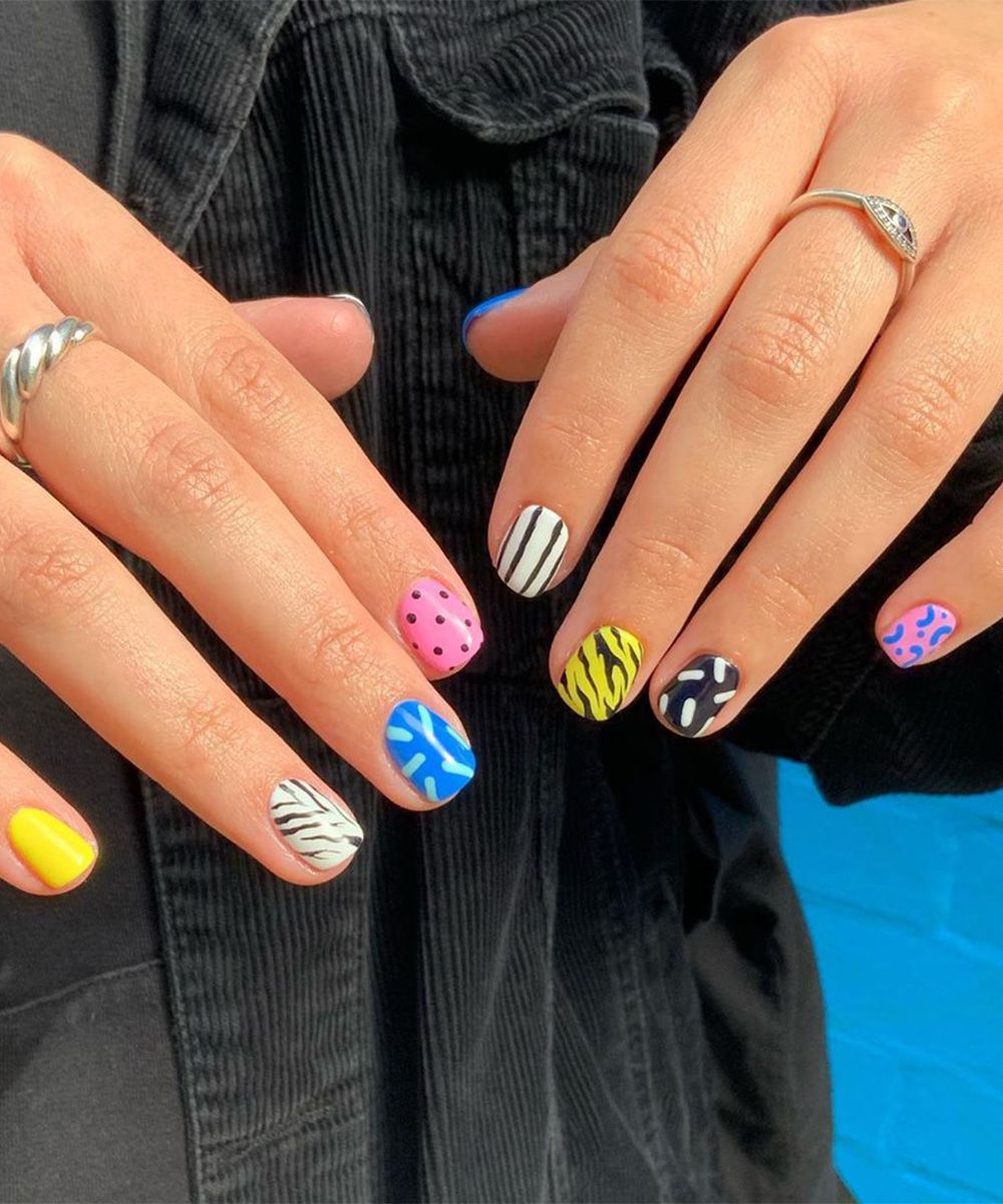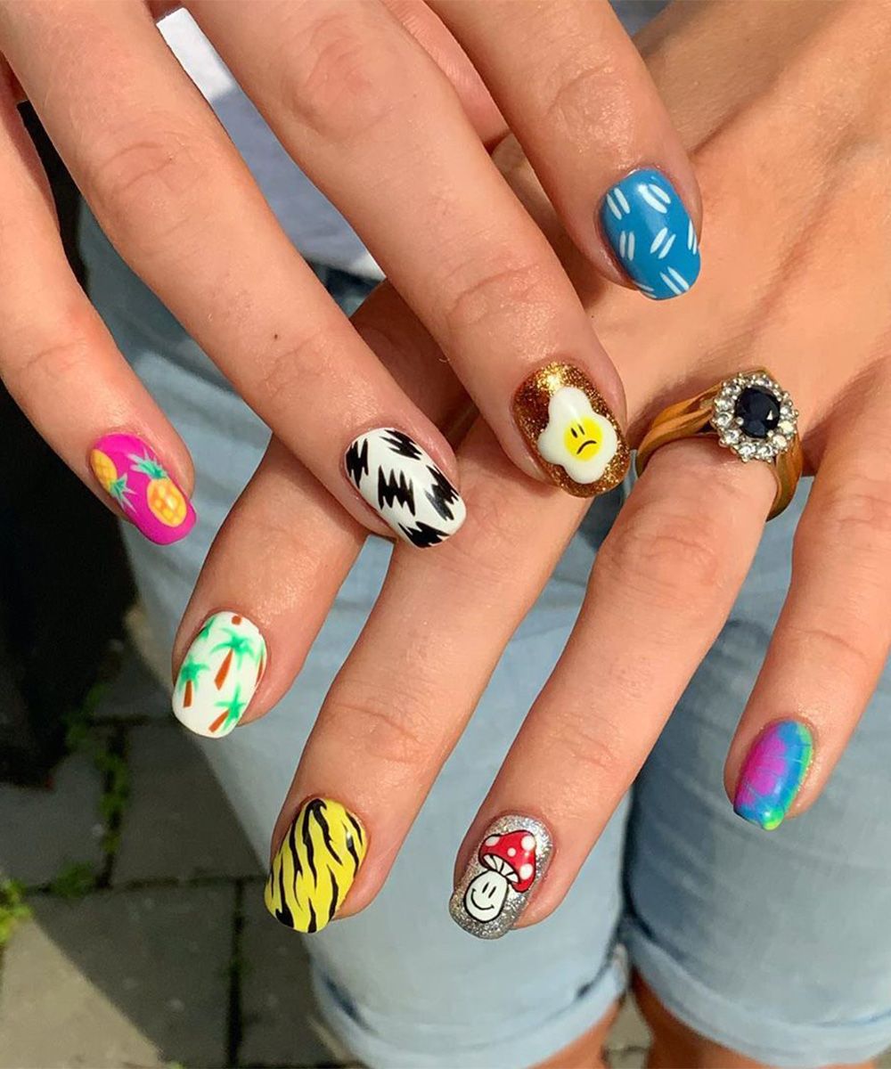Probably the most popular nail art on our Instagram feeds during the summer and still very present on the profiles of nail artists and beauty addicts: the best way to express yourself 100%, nail after nail, is to choose a mix of patterns, decorations, designs and themes for each nail, for a super fun and colorful result.