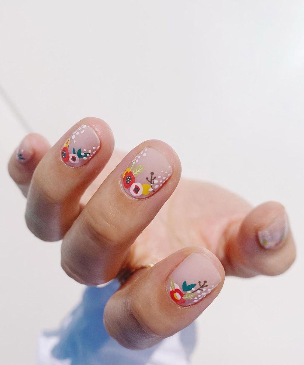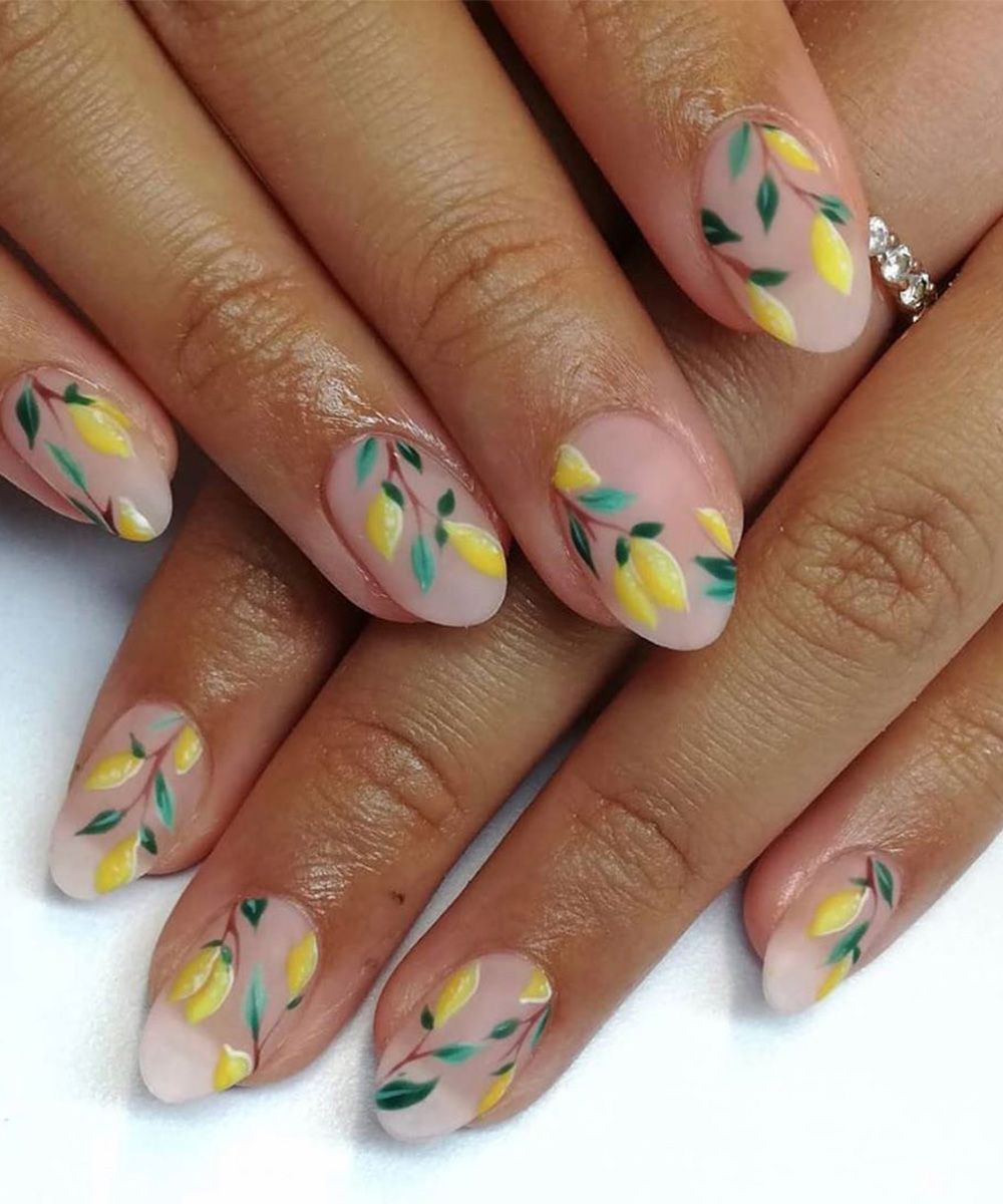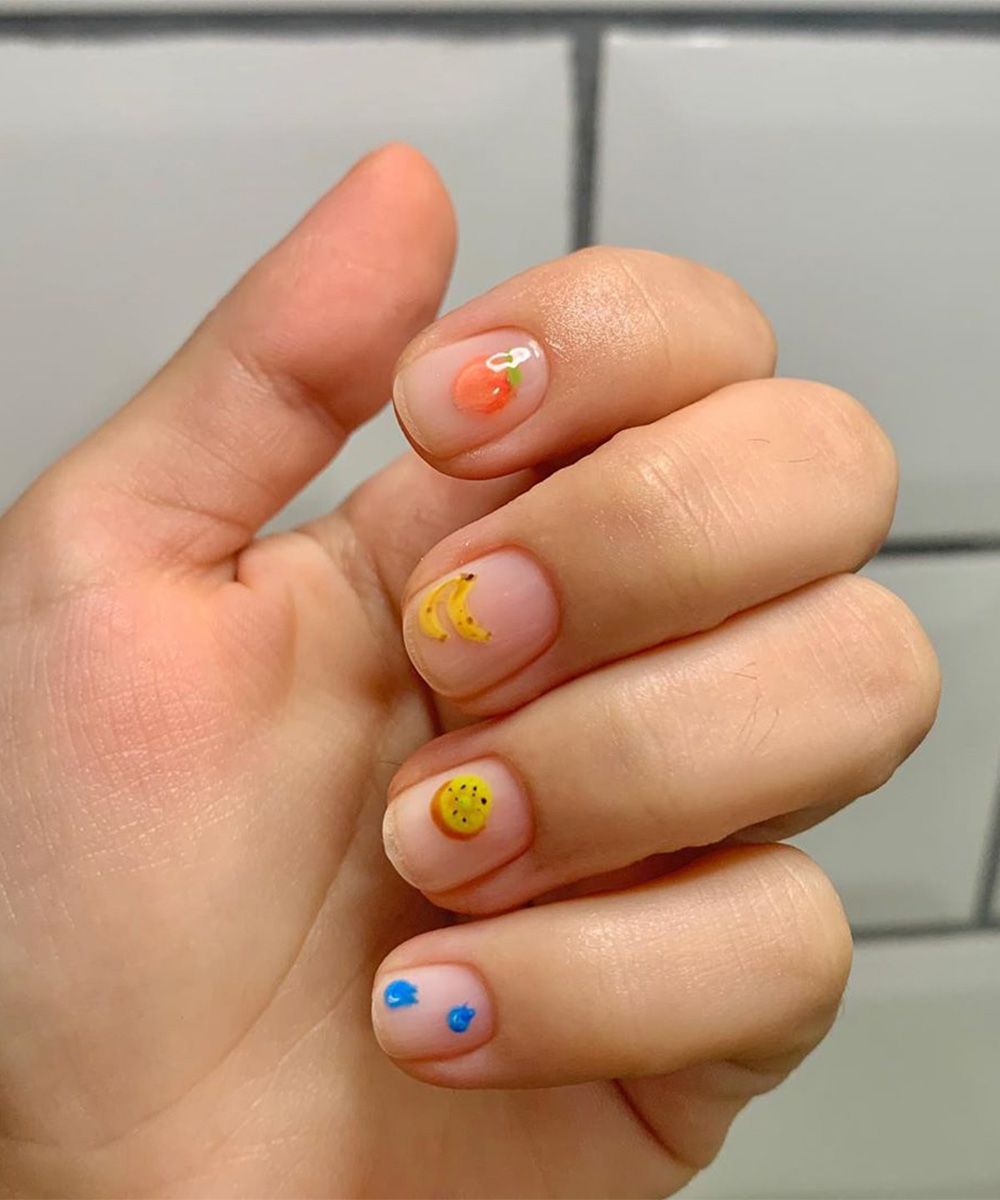 A nostalgic nail art, for those who don't want to give up summer vibes and the feeling of freedom yet. For those who have already returned to the city, a nail art based on fruit and small hand-painted flowers can only bring a little good mood.