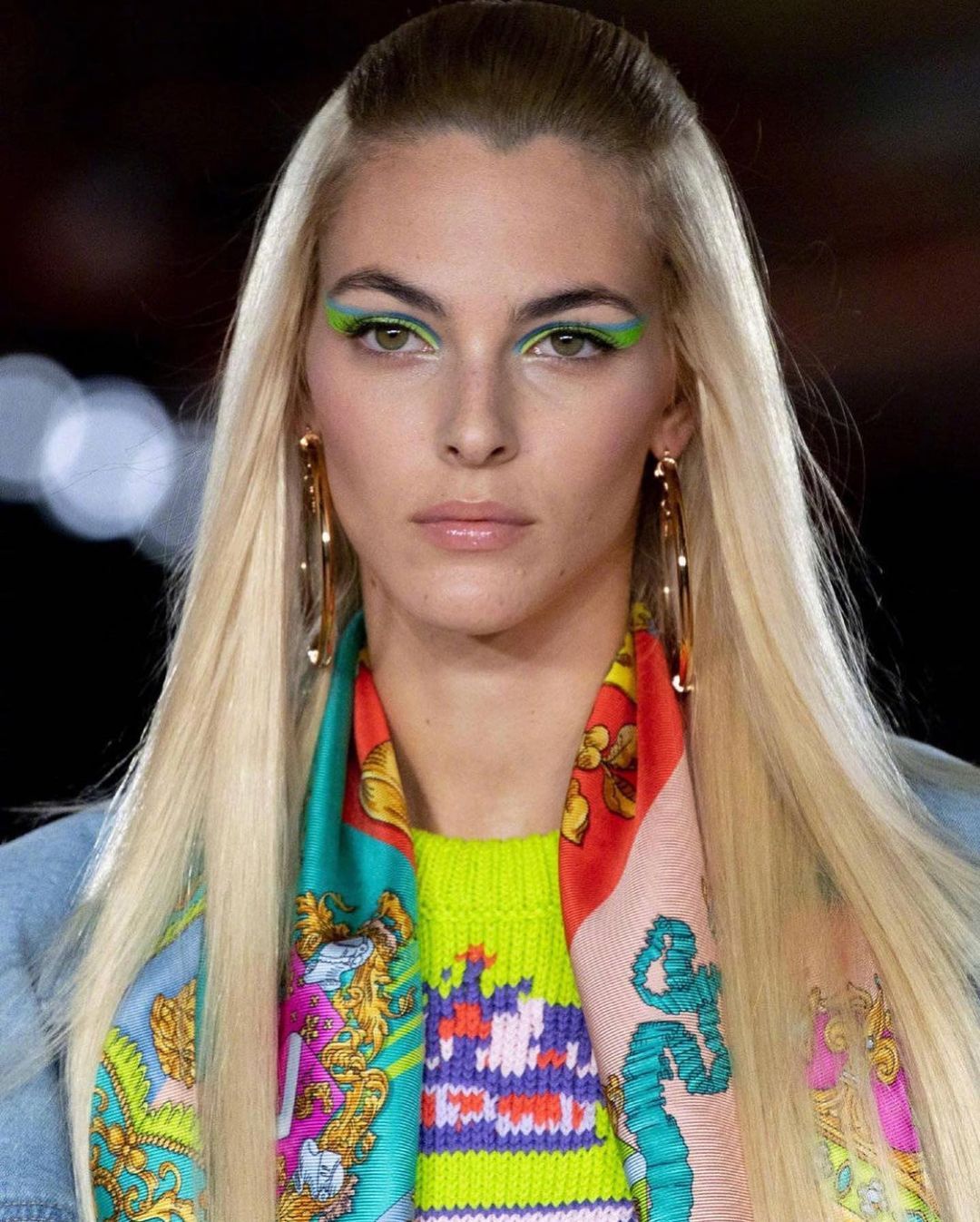 Vibrant eye shadows, sexy eyeliner, daring layering, all to replicate already this season. And to think that this color was always less used in our palettes, leaving the pod practically intact. Green lends itself well to warm or icy pinkish undertones, it is good to red haired but especially to brunettes, while blondes will have to play with some shock nuances, turning to the tones of sage and mint to make the most of their looks. For this, see the entry "Vittoria Ceretti". A cool idea surely comes from Versace's the catwalk, which used fluo green paired with vibrant aquamarine, giving rise to a very graphic and elongated cat-eye.