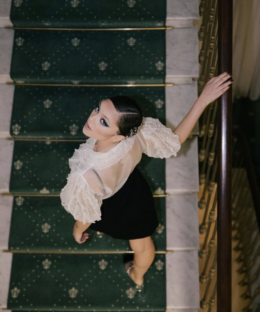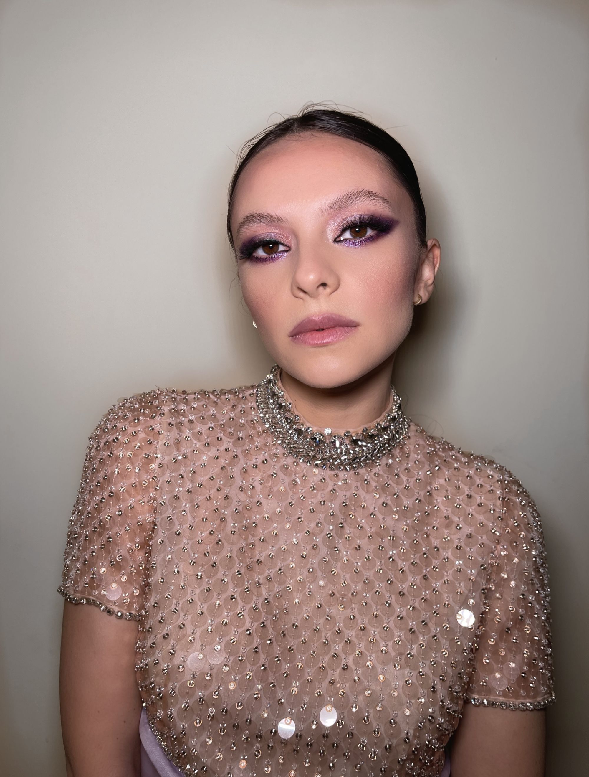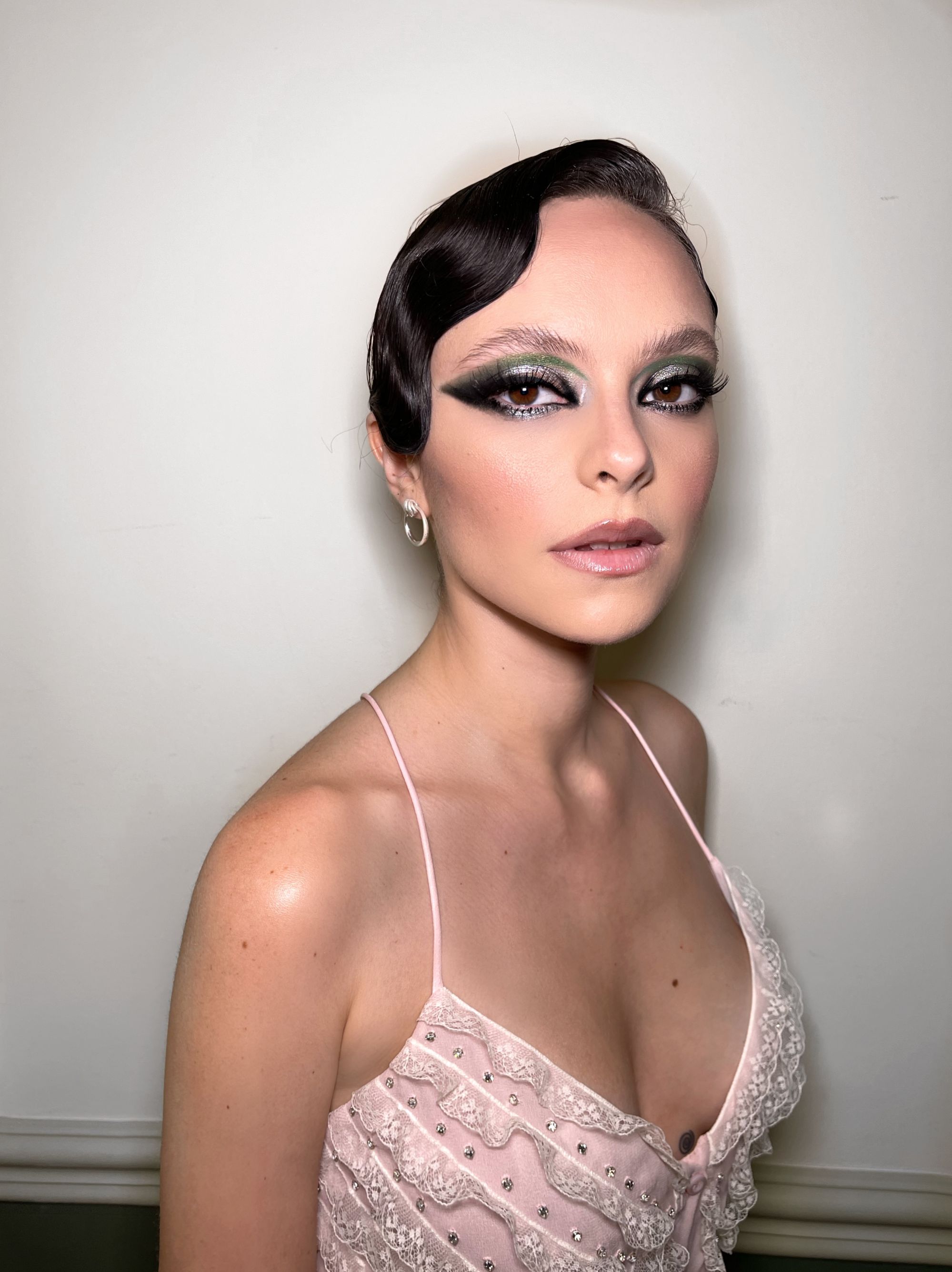 Veronica Lucchesi is the atomic blonde in the race. Her ice blonde is interpreted with mermaid waves, elegant chignon contrasted by black locks and crystal tiara, and always completed by a rock, black and very smoky look. Make-up was curated by MAC Cosmetics.