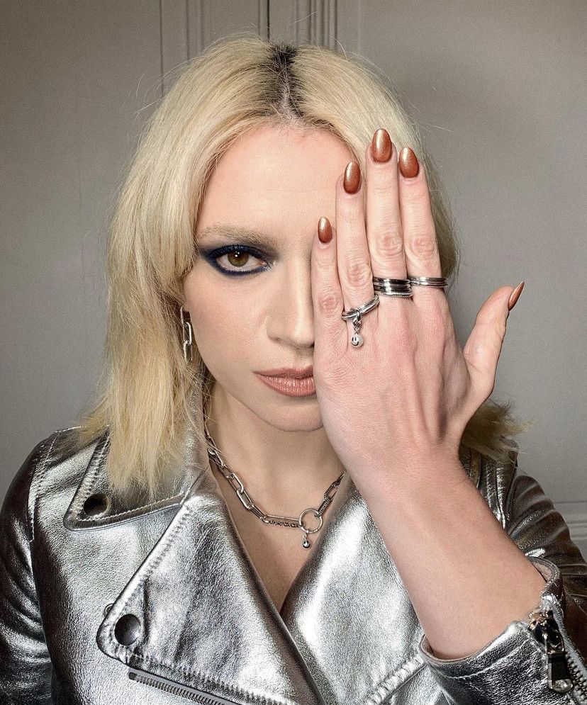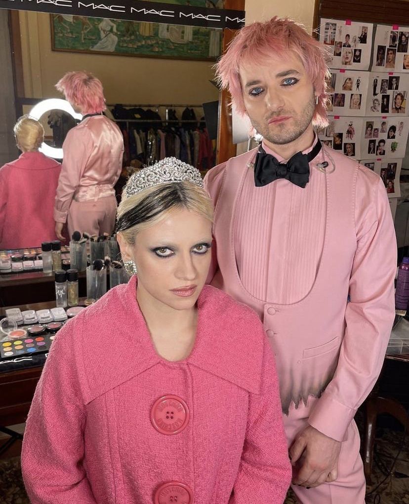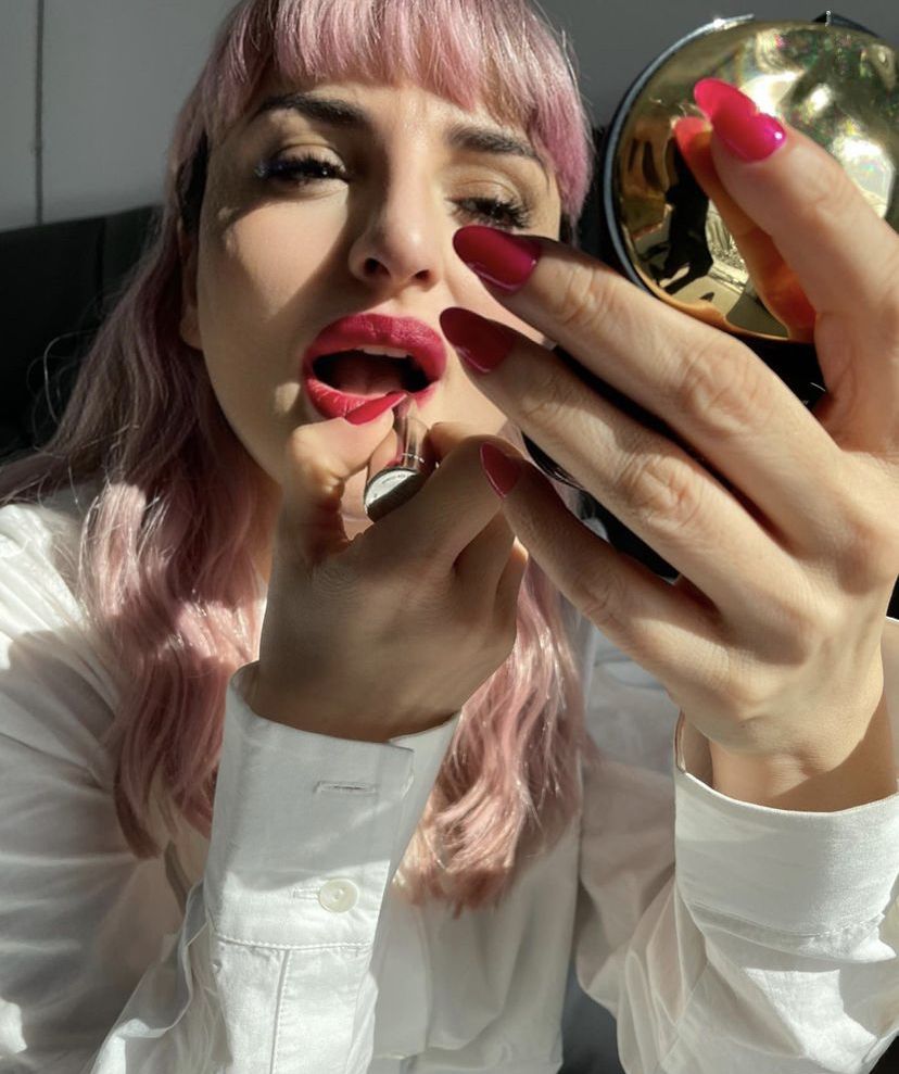 Pink hair and nails lacquered red, contrasted by a graphic and black makeup, with a sprinkling of glitter, made by make-up artist Anna Maria Negri for Byredo. A contemporary rock princess, a bit of a cat, to imitate instantly.