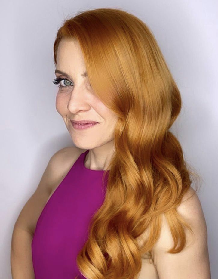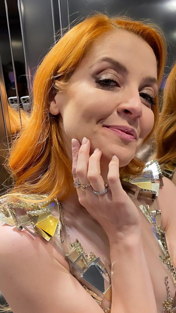 She catches the attention with an orange hair with soft waves, made by Salvo Filetti, the hair designer of Compagnia della Bellezza in partnership with L'Oréal Professionnel who imagines a contemporary and very sophisticated Jessica Rabbit. To match this diva hair is the make-up, created by Martina Sciortino for Lancôme, very natural and bright thanks to games of bronze and nude, characterized by eyelashes xxl, fan, and eyebrows defined. Nice combination of blush coral lips slightly pink.