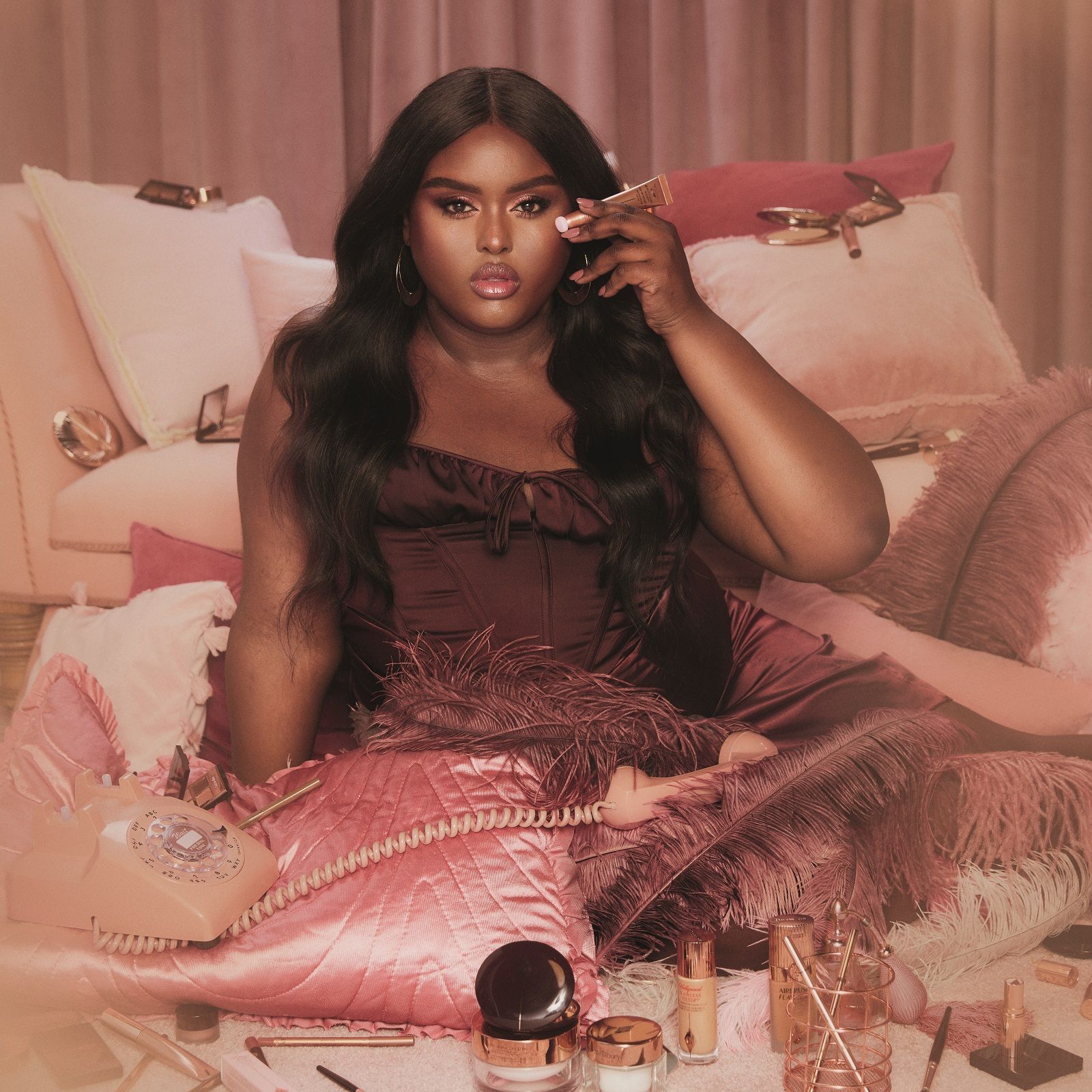For the Pillow Talk collection's release, Charlotte Tilbury has created a special Day to Disco themed campaign where everything from the music (the dance hit Yes Sir, I Can Boogie) to the boudoir beauty with velvet furniture, sequins and disco ball on the ceiling, recreates the atmosphere of a retro and ultra glam party. "Darling, are you ready* to discover Pillow Talk Party?" asks Tilbury. She is met by a cool crew of guests ready to rock the dancefloor and celebrate beauty in all its forms, including part of the make-up artist's family, in particular her mother Patsy and granddaughters Sofia and Bella, along with a group of up-and-coming young talents like the model, Brazilian-American model, artist and performer Fernando Casablancas, British model and singer-songwriter Meg Rutherford (her debut album is entitled Sinner) and Ceval Omar, Somali-Norwegian activist and the first black, trans and curvy model to appear in British Vogue.
