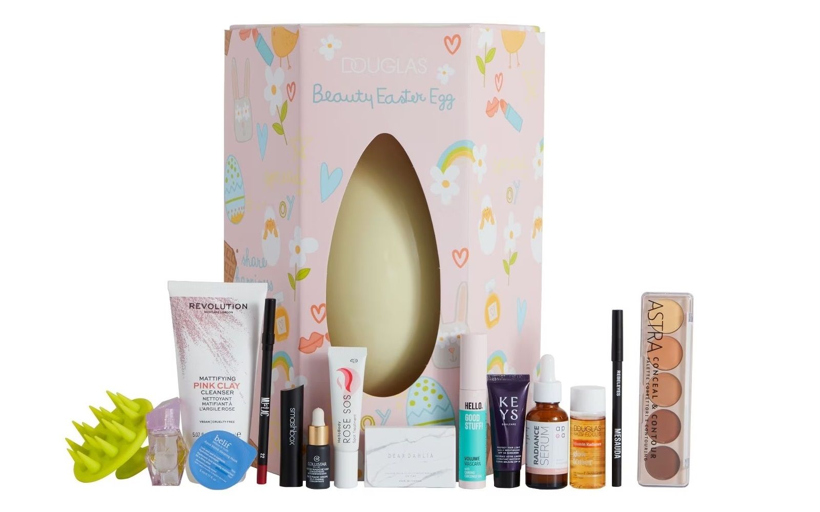 Douglas' Beauty Easter Egg is a pastel yellow egg (housed in packaging exclusively designed by @titta_designer) with 15 surprises inside, containing a mix of make-up products, skincare, fragrances and tools from brands available in Douglas perfumeries - perfect for gifting or treating yourself to for your spring beauty routine. Curious to know more? Here are the contents of the box: a long-lasting lipstick by Smashbox, a face palette by Astra, a vegan lipstick by Mulac, Magic Face Drops by Collistar, Paradise Dream Velvet Lip Mousse, a tinted lip balm by Dear Dahlia, an eye pencil by Mesauda, a mascara by Essence, a mini size of Ariana Grande's perfume REM and a massage brush by Pomelo. The selection dedicated to skincare features: a mud-to-foam cleanser with pink clay by Revolution Skincare; a vitamin C-enriched glow toner by Douglas Collection; a brightening serum by Synergye Therm; a moisturising night mask by Belif; a day cream with spf 30 by Keys Soulcare; SOS Spot Treatment, an anti-blemish gel by Hello Body.