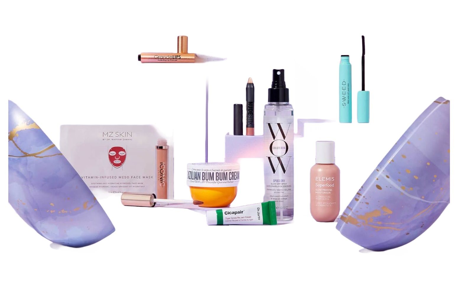 An elegant digital lavender box conceals a precious egg in the same pastel shades and with golden veins, which when opened offers a selection of 7 skincare and make-up products: a quick-drying spray by Colour Wow, a Bum Bum cream by Sol De Janeiro, a vitamin-enriched mask by MZ Skin, a Superfood Glow Priming moisturiser by Elemis, a Cicapair cream by Dr Jart, a mascara by Sweed, an eye pencil by Nudestix, a matte liquid eyeshadow by Iconic and a Lip Plump gloss by Grande Cosmetics.
