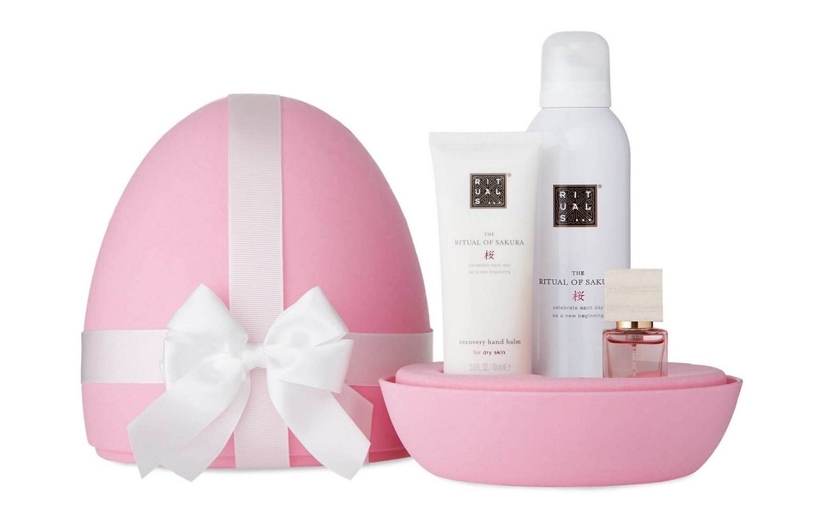 Three colours for as many different scents and eggs. The yellow one and contains a range of body cosmetics with sweet orange and energising cedar: a gel shower gel from The Ritual of Mehr, a hand balm from The Ritual of Sakura, a travel-size L'Éclat perfume and a Fortune repairing lip balm. The pink variant, The Ritual of Sakura, is inspired by the blossoming cherry trees of Japan and includes a hand cream, shower mousse, lip balm and Rêve de Hanami mini perfume. The grey variant, The Ritual of Sport, features a shower gel and an anti-dryness body lotion, as well as a travel-size L'essentielin perfume.