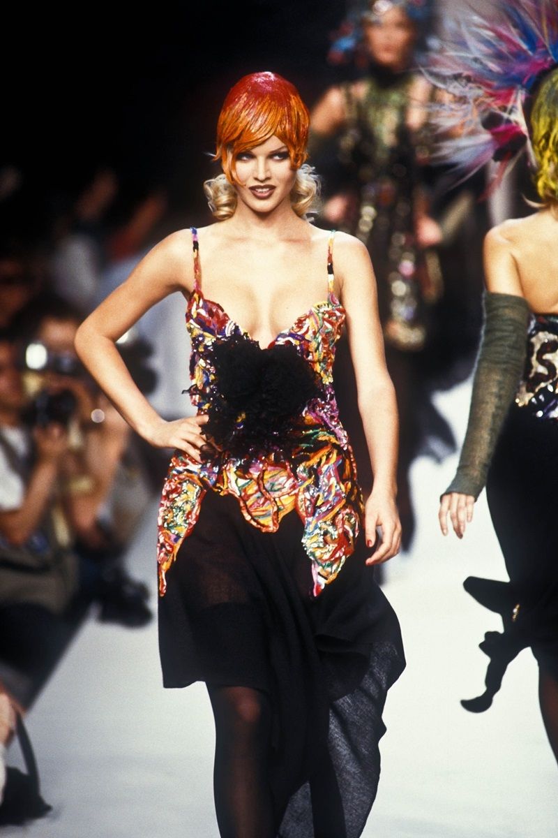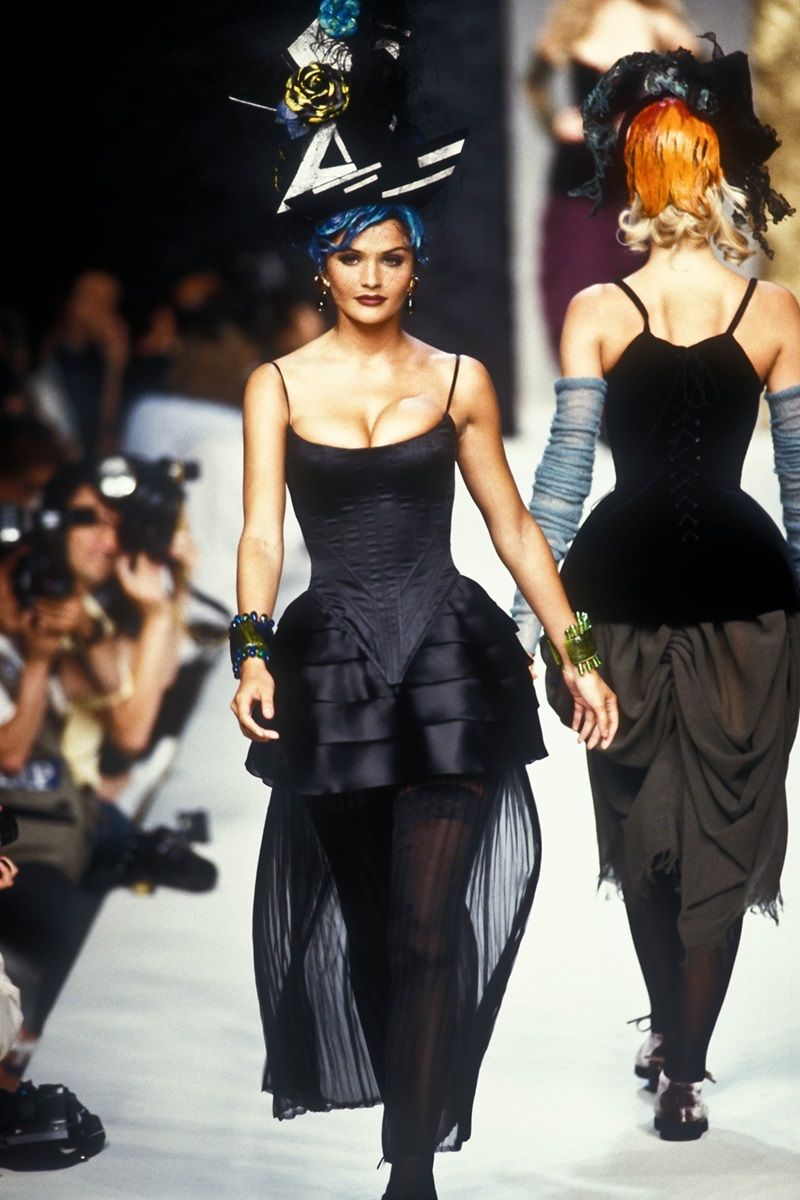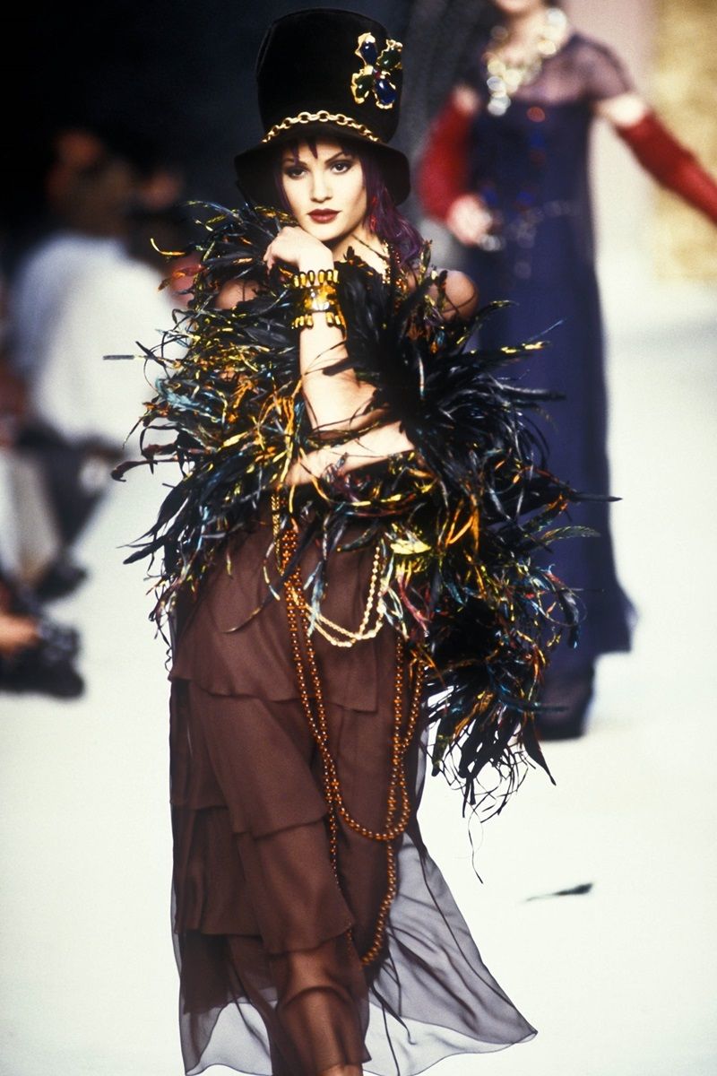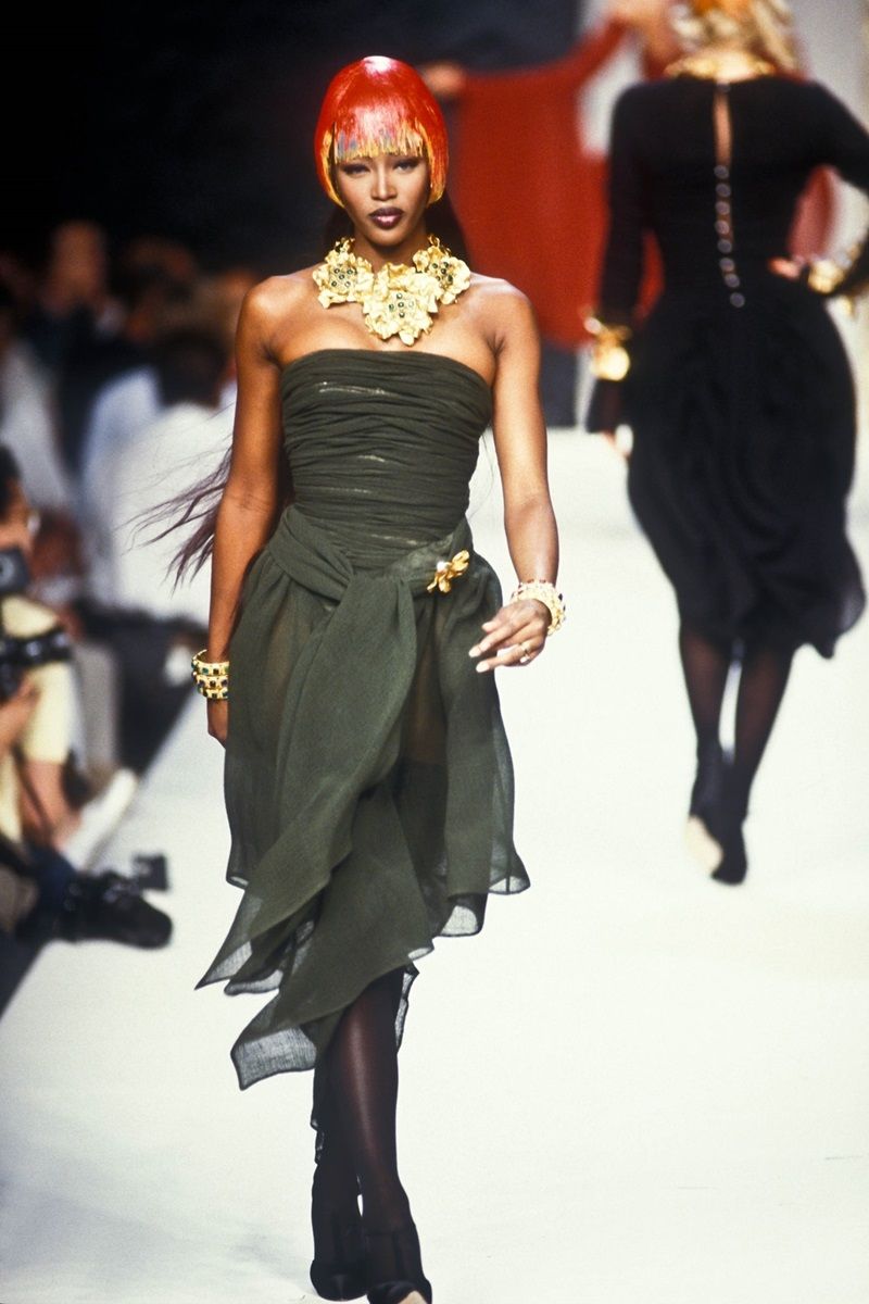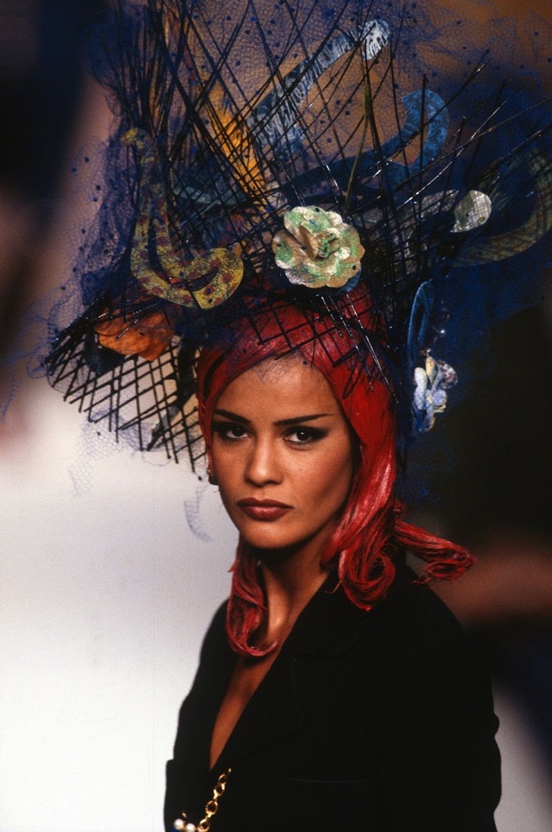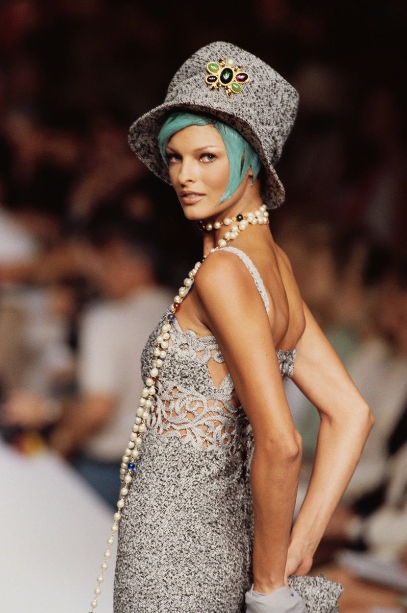 The Chanel FW 1992 Couture collection may not have gone down in history as the most interesting and innovative designed by Karl Lagerfeld, but the makeup, on the other hand, deserves to be remembered. Linda Evangelista, Naomi Campbell, and other models showcased daring, almost plastic hairstyles in bright colors like red, sky blue, and purple, coordinated with eyeshadows and lipsticks. '90s lips, cheeks and cheekbones sculpted with blush, thin but well-defined eyebrows, and smokey eyes are the winning details, all worth copying from this look. In subsequent shows, Lagerfeld continued to play with pastel-colored makeup and hair.