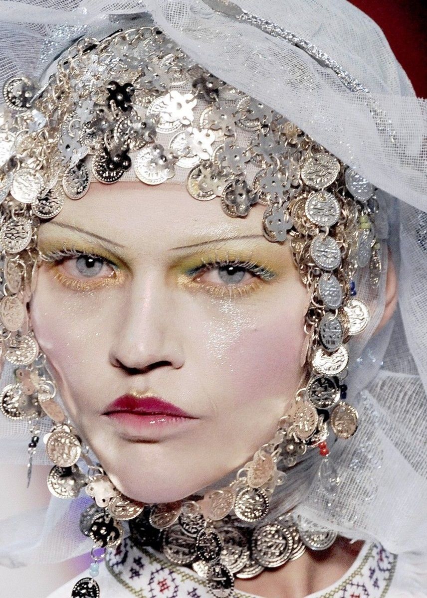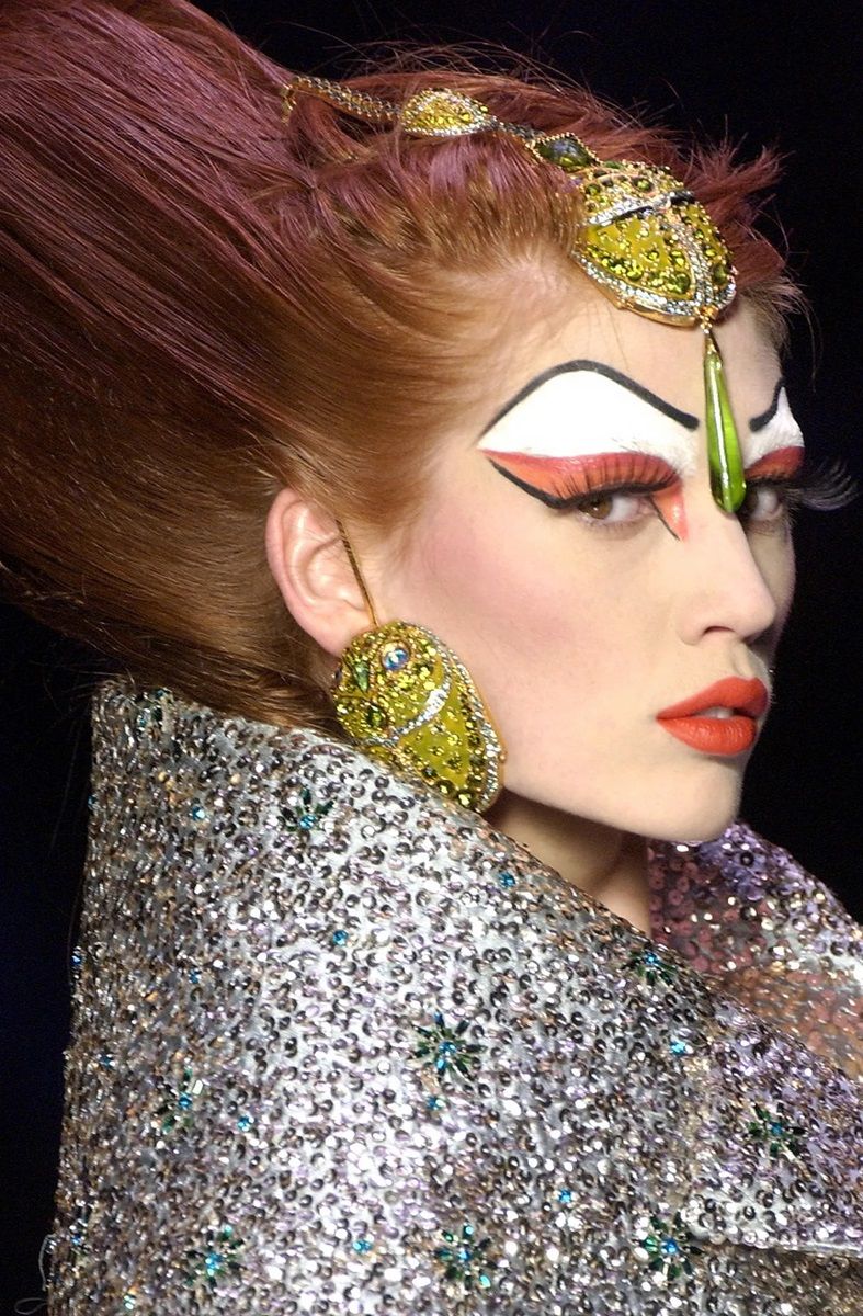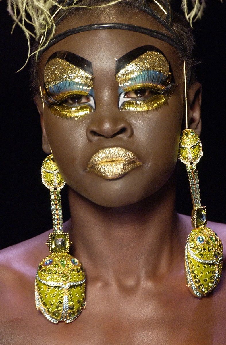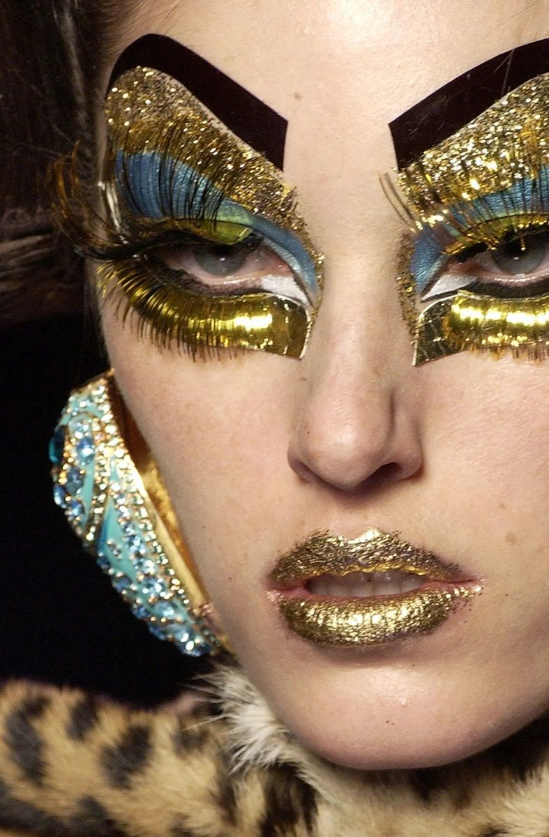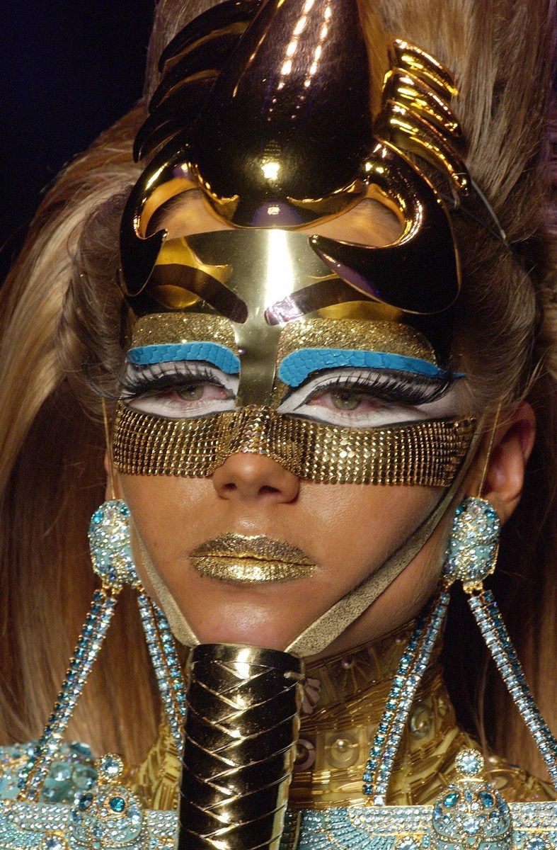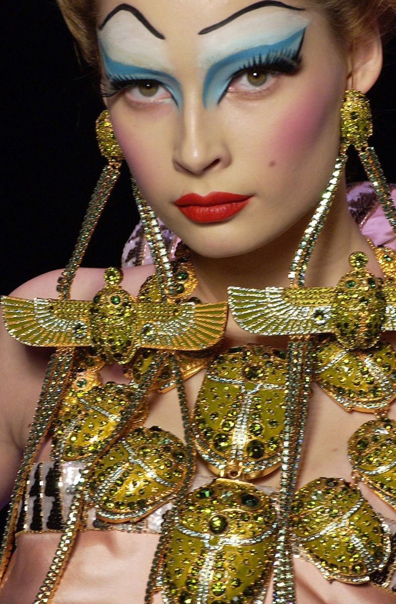 Perhaps not overshadowing the popularity of the collection, but the makeup created by Pat McGrath for the Christian Dior Spring 2004 Couture has entered history. In line with John Galliano's inspiration from ancient Egypt, the makeup artist played with opulence, crystals, metallic shades for a maximalist bling-bling effect. Models in Cleopatra, Ramses II, and Tutankhamun versions flaunted eyes studded with gold or silver glitter, matching their lips, turquoise, lavender, and coral eyeshadows, alternated with a layer of white pigment paired with an orange lipstick, XXL lashes, graphic eyeliner, and finely drawn eyebrow arches. All enhanced by Victoire de Castellane's jewelry adorning the ears, hair, and sometimes the chin or the lower part of the models' eyes. Talking about the beauty looks, Pat mentioned: "One of those chainmail looks under the eyes took about 12 hours to do. It was really fun when the look was accepted because I thought, 'Ah, I'm so happy!' And then I thought, 'How am I going to do 10 in three hours?' I didn't do the math, and I panicked." While Robin Givhan, senior critic at The Washington Post, emphasized how McGrath's work for this show changed everything, equaling, if not surpassing, the garments: "Makeup has always been a secondary element to the big story, but it seemed like Pat was really creating this dialogue between the clothes and the beauty."