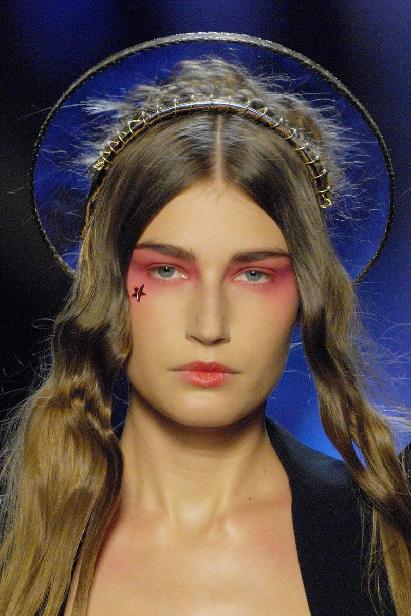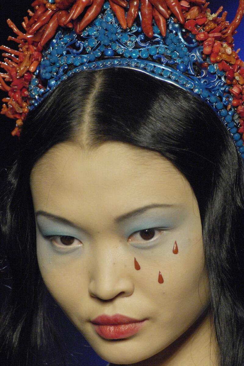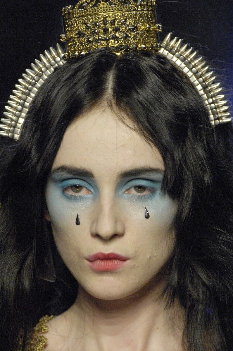 The SS 2007 Couture show by Jean Paul Gaultier would have had the same impact without that makeup? No, as the images of the faces of Jessica Stam, Lily Cole, and other models continue to be the beauty obsession of many on Pinterest, TikTok, and Instagram. Les vierges by JPG were inspired by the Virgen de la Macarena, the wooden image of the Virgin Mary from the 17th century in the Basilica de la Macarena, Seville, and the vernacular devotional art of Catholic churches. From a makeup perspective, this translated into pearlescent skin, blue, yellow, and red eyeshadows surrounding the eye and degrading to the lower part, tears, hearts, and stars embellishing the cheeks, giving the models the appearance of weeping statues. In one word: iconic.