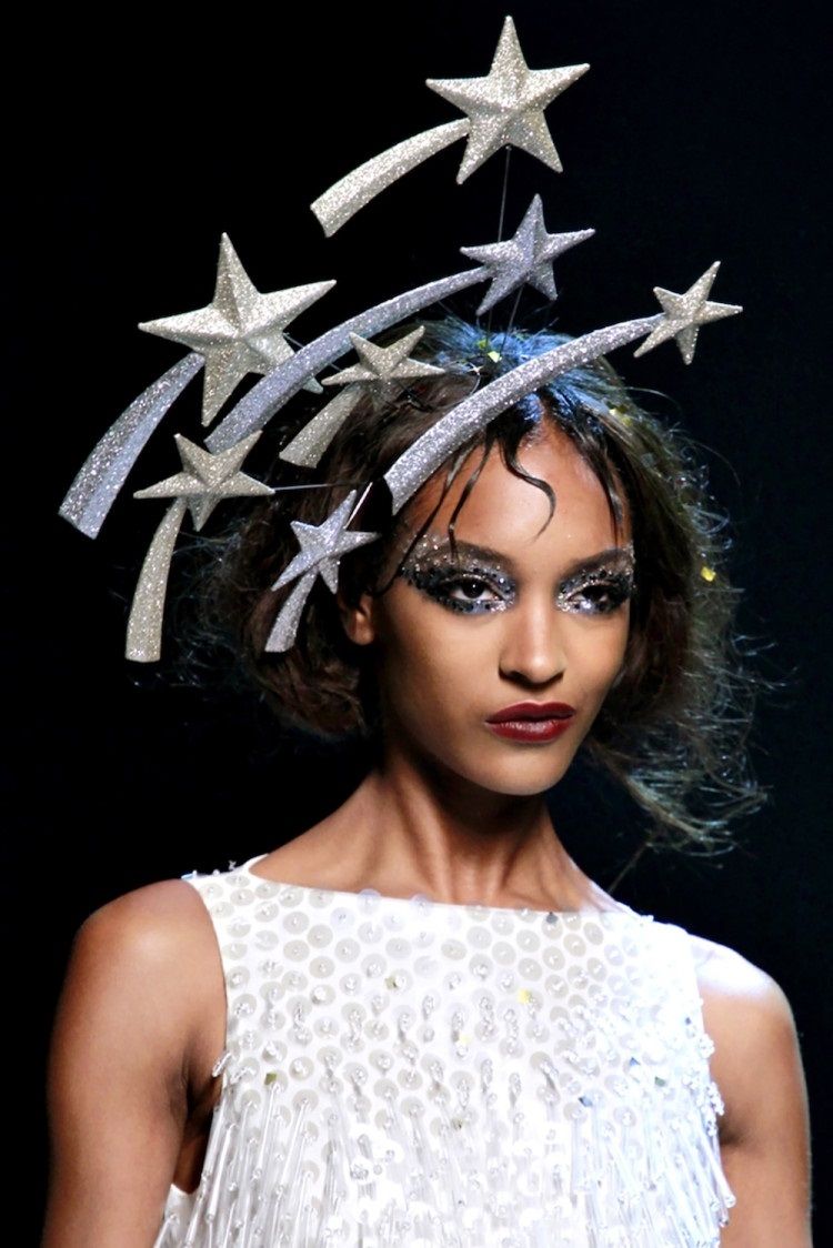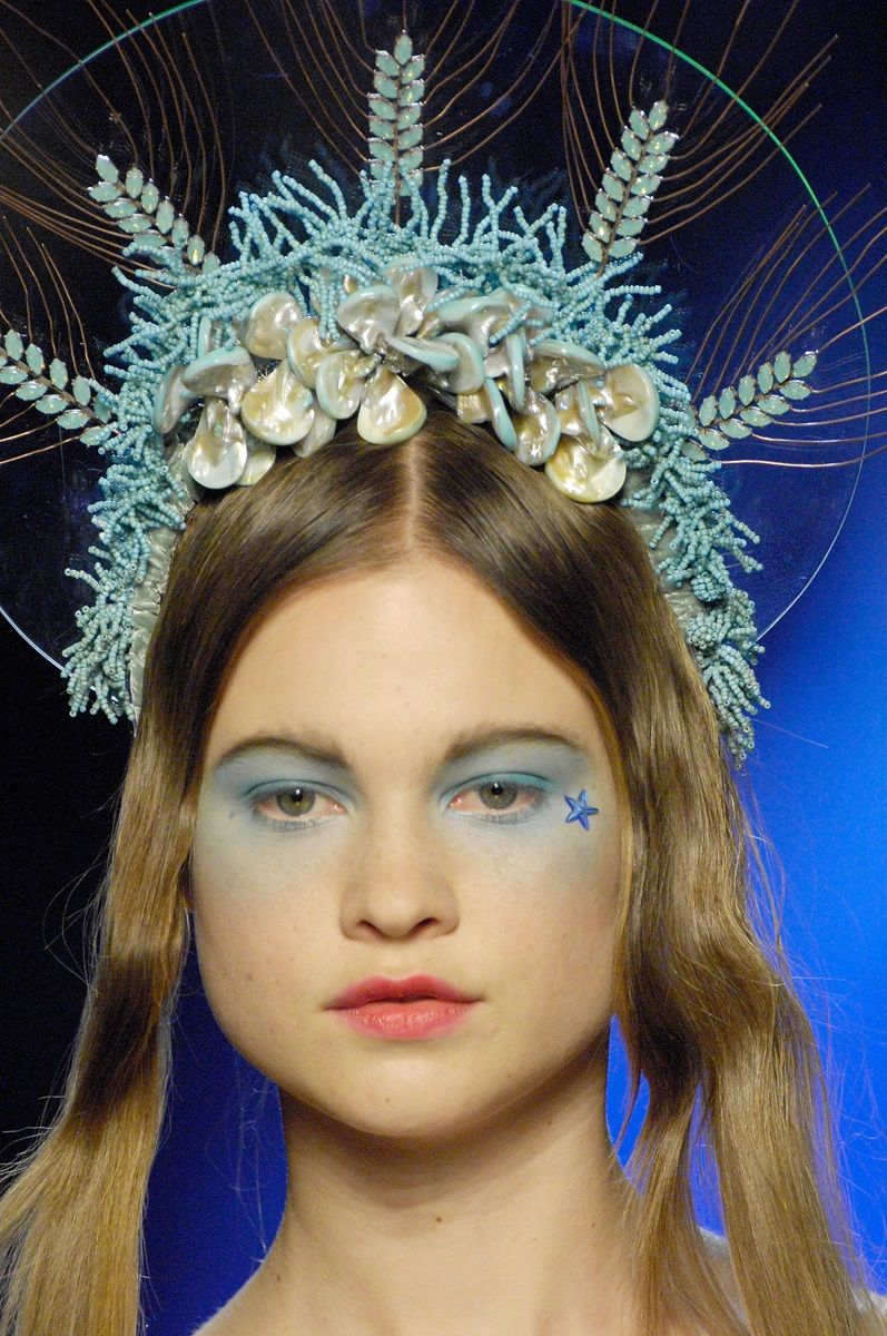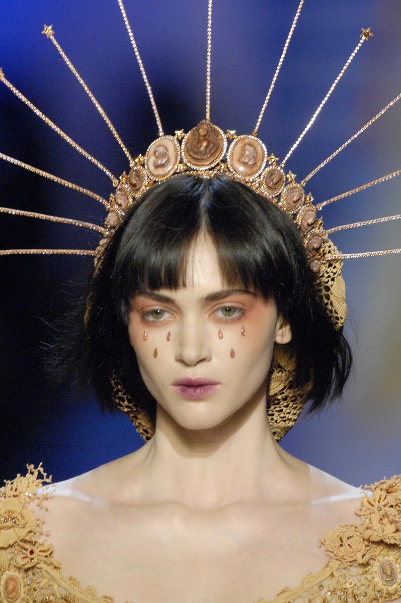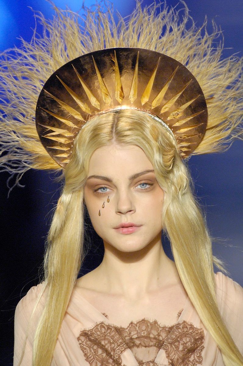 The SS 2007 Couture show by Jean Paul Gaultier would have had the same impact without that makeup? No, as the images of the faces of Jessica Stam, Lily Cole, and other models continue to be the beauty obsession of many on Pinterest, TikTok, and Instagram. Les vierges by JPG were inspired by the Virgen de la Macarena, the wooden image of the Virgin Mary from the 17th century in the Basilica de la Macarena, Seville, and the vernacular devotional art of Catholic churches. From a makeup perspective, this translated into pearlescent skin, blue, yellow, and red eyeshadows surrounding the eye and degrading to the lower part, tears, hearts, and stars embellishing the cheeks, giving the models the appearance of weeping statues. In one word: iconic.