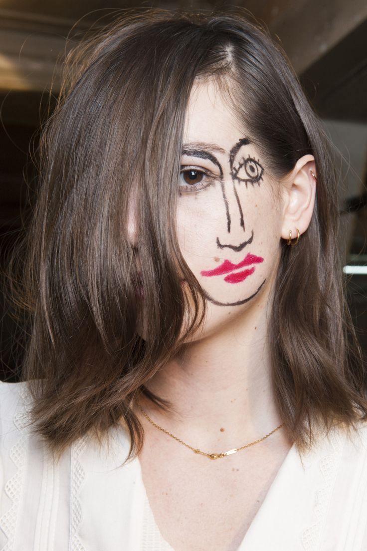 For L'enfant du soleil, Simon Porte brought childlike naiveté to the runway, an assorted child who plays carefree, loves Michel Gondry films, and wears rough-edged collages, cropped coats, asymmetrical lines, oversized cartoonish garments, and hands that looked like they were cut out in kindergarten arts and crafts classes. On the face, not normal make-up, but drawn faces, the result of a collaboration with Berlin-based artist Sebastian Bieniek (known for his 2013 Doublefaced series), reminiscent of surrealist works and Willy Vanderperre's famous 1999 image of model Robbie Snelders with Mickey Mouse drawn on his face by Peter Philips.