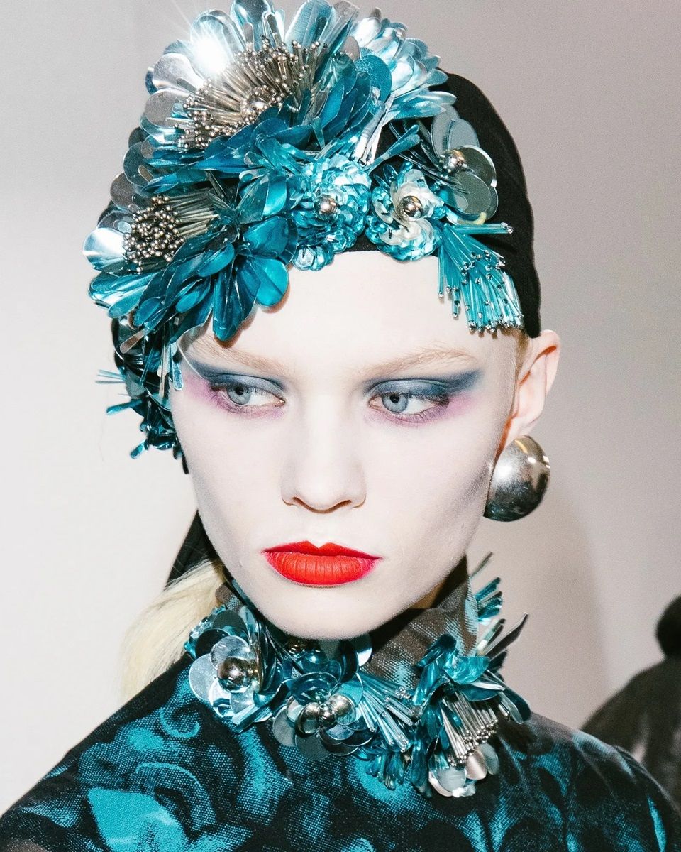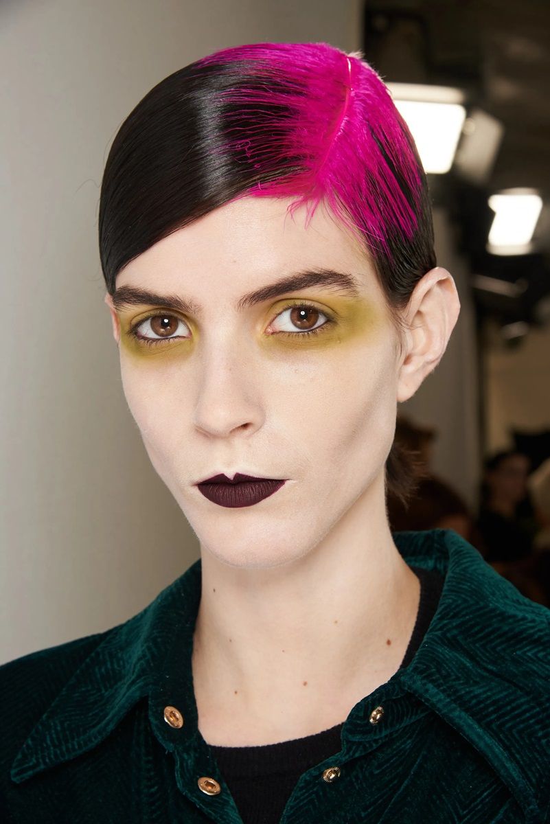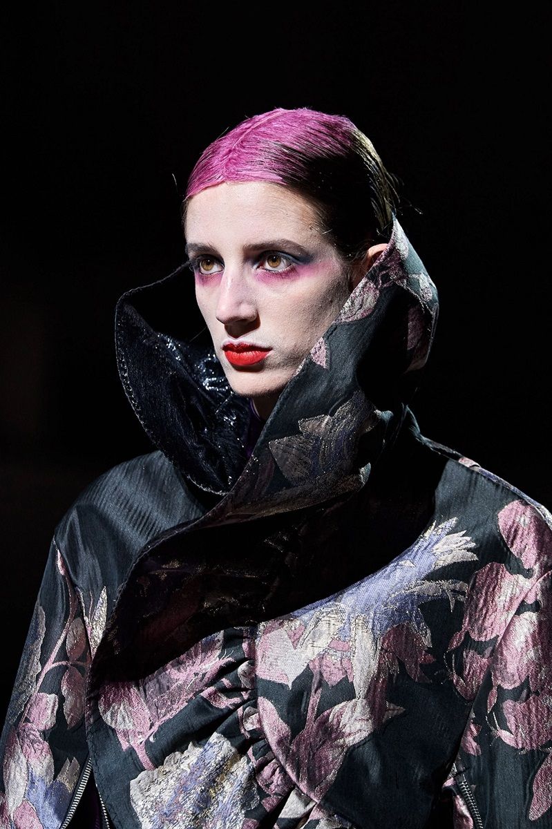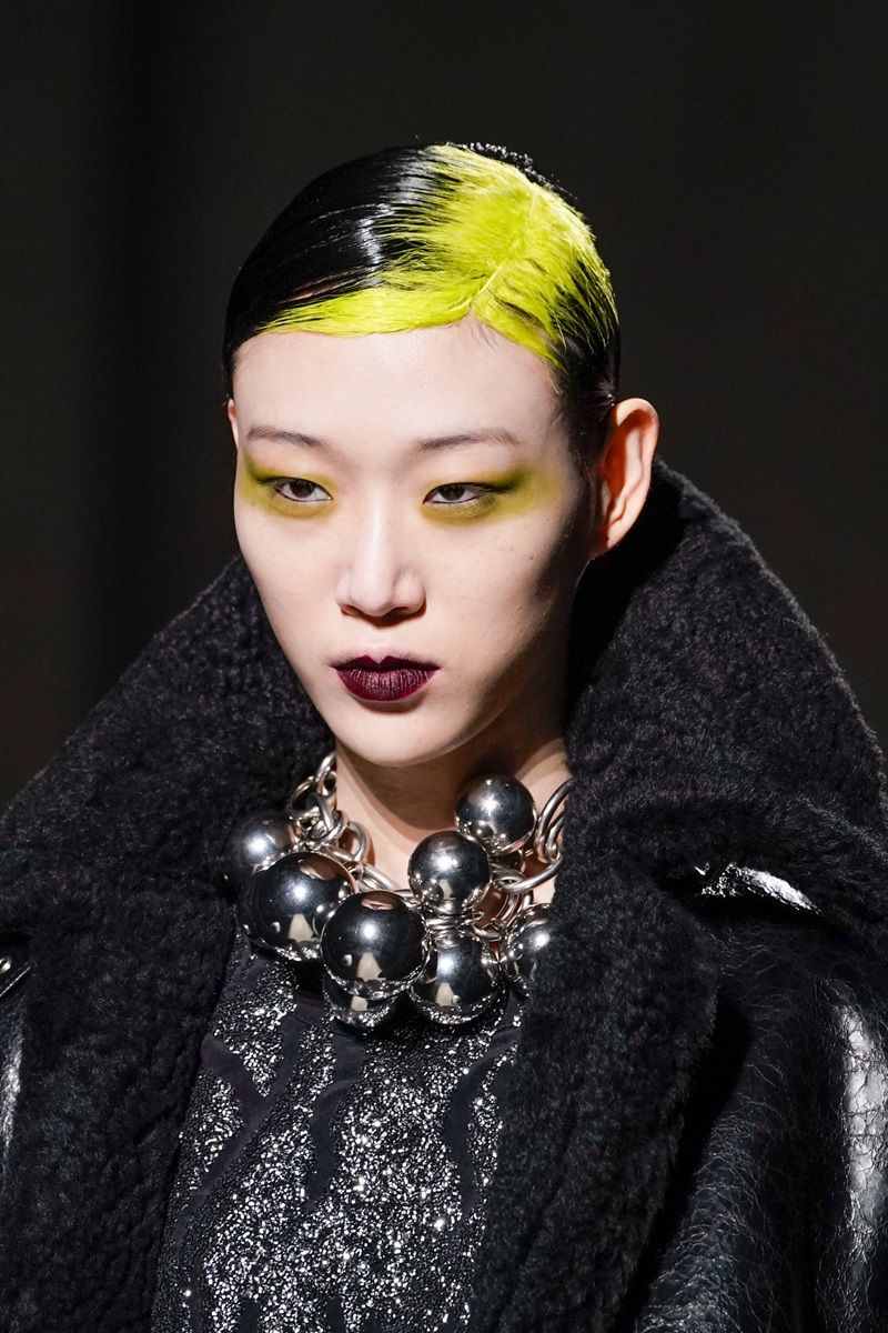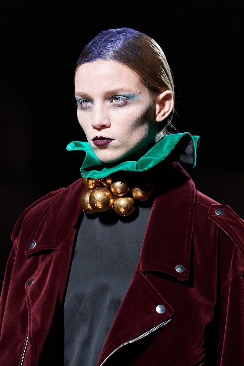 The one chosen by Dries Van Noten for FW 2020 is undoubtedly one of the most striking beauty looks of the last fashion weeks. The makeup and hair inspiration came from the campaigns created in the 1980s for Japanese cosmetic company Shiseido by make-up artist and photographer Serge Lutens, but updated to contemporary. Inge Grognard, who did the makeup, played with saturated pigments on the eyes, declined gray, pink, light blue, gray, mustard. All blended outward in the upper eyelid and under the eye. The touch that emphasizes Grognard's work? Sam McKnight, the show's hair stylist, who recreated a kind of regrowth, dyeing the roots of the hair lime green, crimson red, blue and purple. Actually, it wasn't a dye job: the hair was side parted, and a marabou feather was applied to the root root, then dyed and fixed with sprays of hairspray. The result? Mysterious iconoclastic glam vamps.