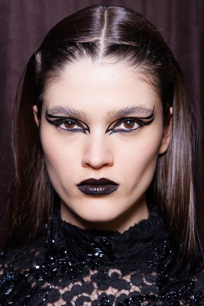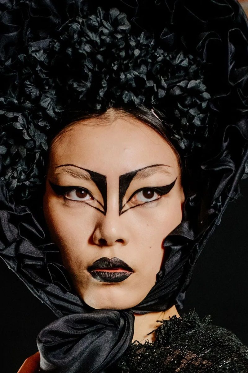 For Rodarte's FW 2023 fashion show, the Mulleavy sisters thought of a gothic fairy tale, inspired by Anjelica Huston's Morticia Addams, especially in the make-up. James Kaliardos focused on graphic looks of black eyeliner for a strong, bold effect. Kaliardos and the NARS team gave the models' skin a radiant glow by using NARS' Radiant Creamy Concealer and Orgasm Four Play Palette for blush, then focused on the eyes. They used tape and an eyebrow pencil to create the shapes, then applied NARS Climax liquid eyeliner to fill in the color. Finally, they added several coats of Nars Climax Mascara. On the lips a matte black or blue rosette, while the stiletto nails were glossy black. The end result was stunning and achieved more resonance than the fashion show itself.