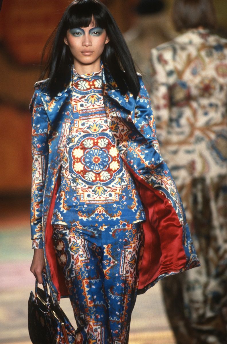 Perhaps the name Todd Oldham may not be recognizable to many today, but in the '90s, the designer was popular. Thanks in part to the makeup for his shows, which was done by Kevyn Aucoin, the legendary makeup artist behind Revlon The New Nakeds, a palette of browns and beiges designed to adapt to the skin tones of women worldwide, marking the first inclusive makeup line in history. For Oldham's FW 1997, he focused on the eyes, covering everything, including eyebrows, with pigment—blue on the upper lid, acid green all around the upper and lower eye rims. To finish, nude lips and blush to sculpt the cheeks.