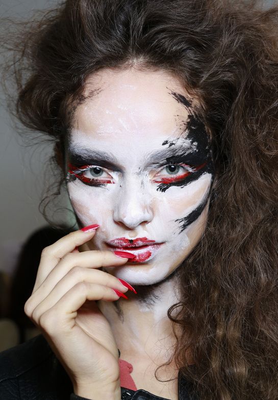 Val Garland became a makeup artist because it "seemed easier than doing hair", managing to make a name for herself in the industry for her eclectic style ranging from 1980s New Romantics makeup to Lady Gaga's alien looks. In her career, she has collaborated with many artists, creatives, and brands, but most notably with Vivienne Westwood. The Vivienne Westwood Red Label SS 2014 runway show was an event, a theatrical show inspired by the Ballets Russes and German choreographer Pina Bausch, remembered more for Garland's work than the garments. Val Garland applied white makeup as a base and then drew wild stripes of black and red on the models' faces, paired with cherry red claw nails (she reportedly used a Nails Inc nail polish).