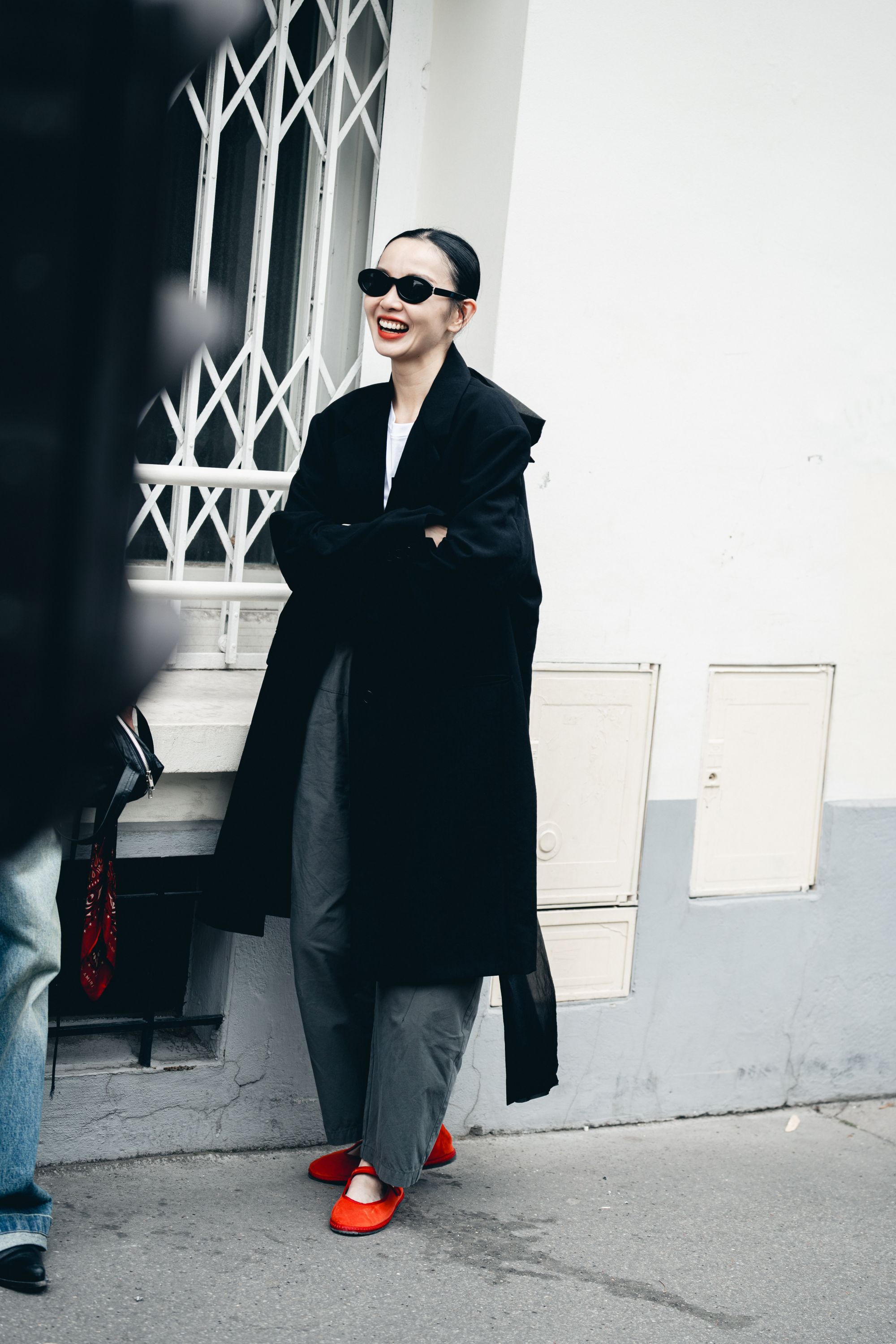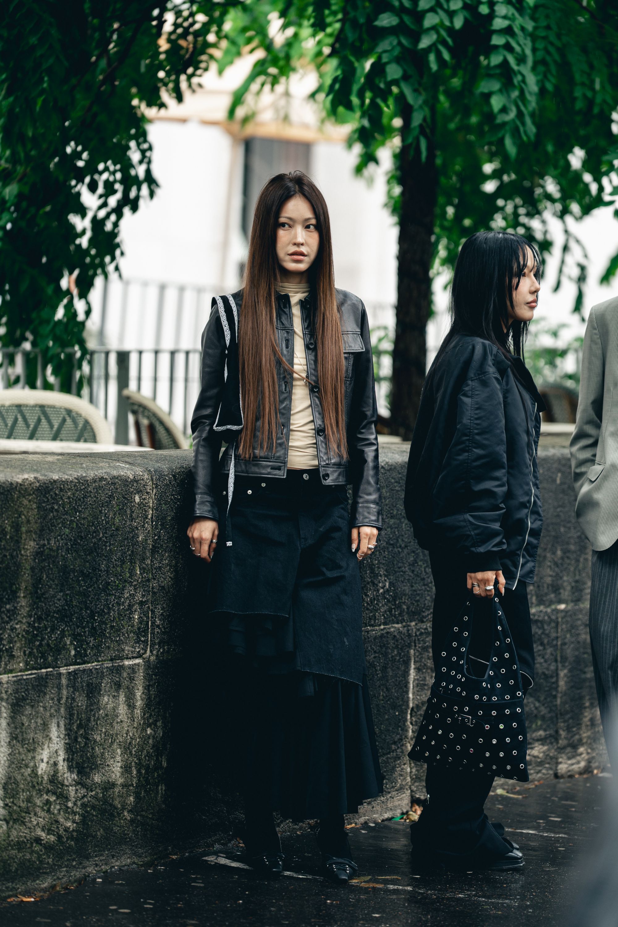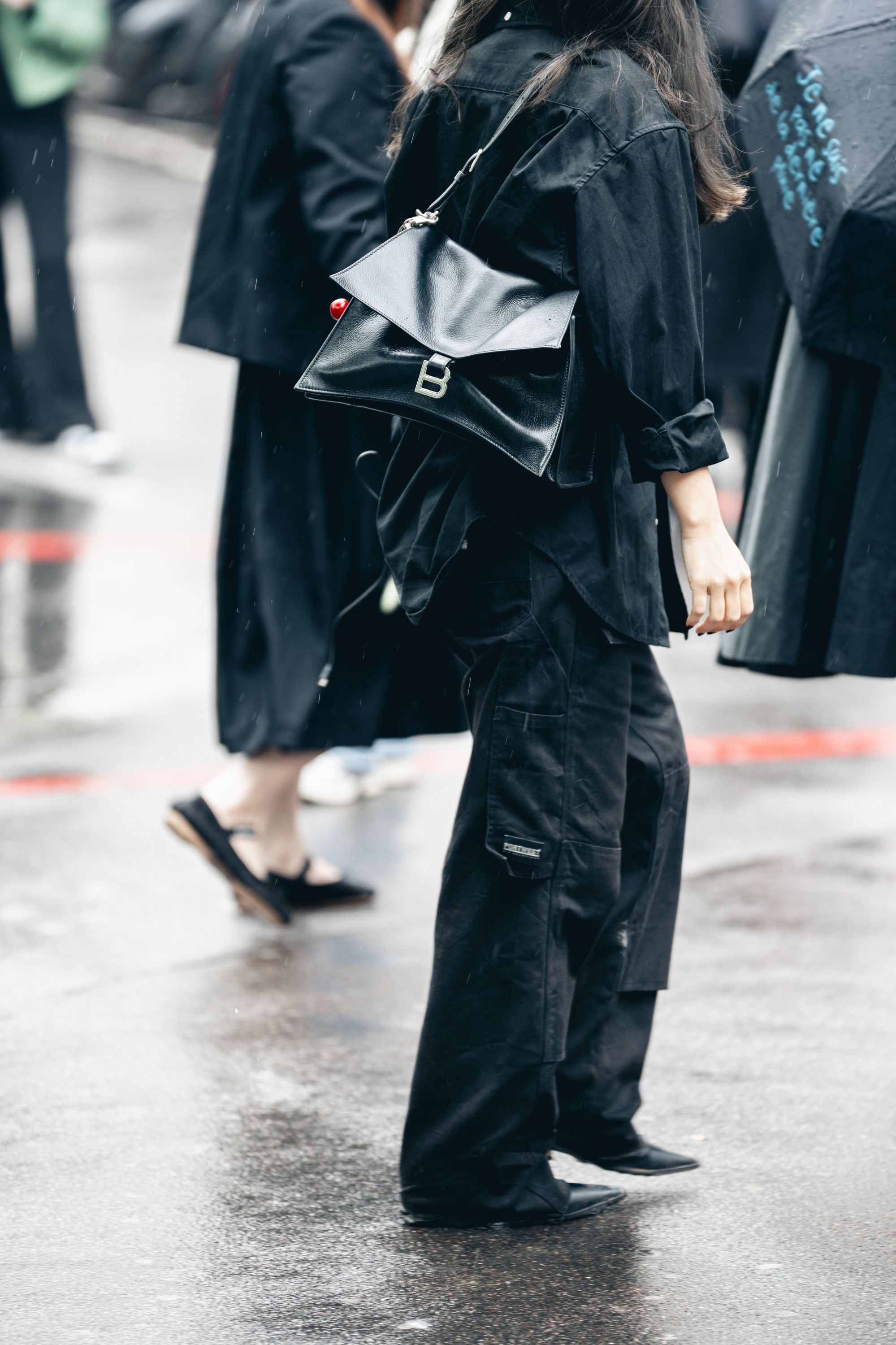 The keyword is control. In a rainy Paris, beauty looks that seem minimal and understated but are highly curated dominate, with slicked-back hair, bobs, and large sunglasses despite the clouds. The prevailing color is black, followed by earth tones. The makeup is matte, with natural lipsticks.