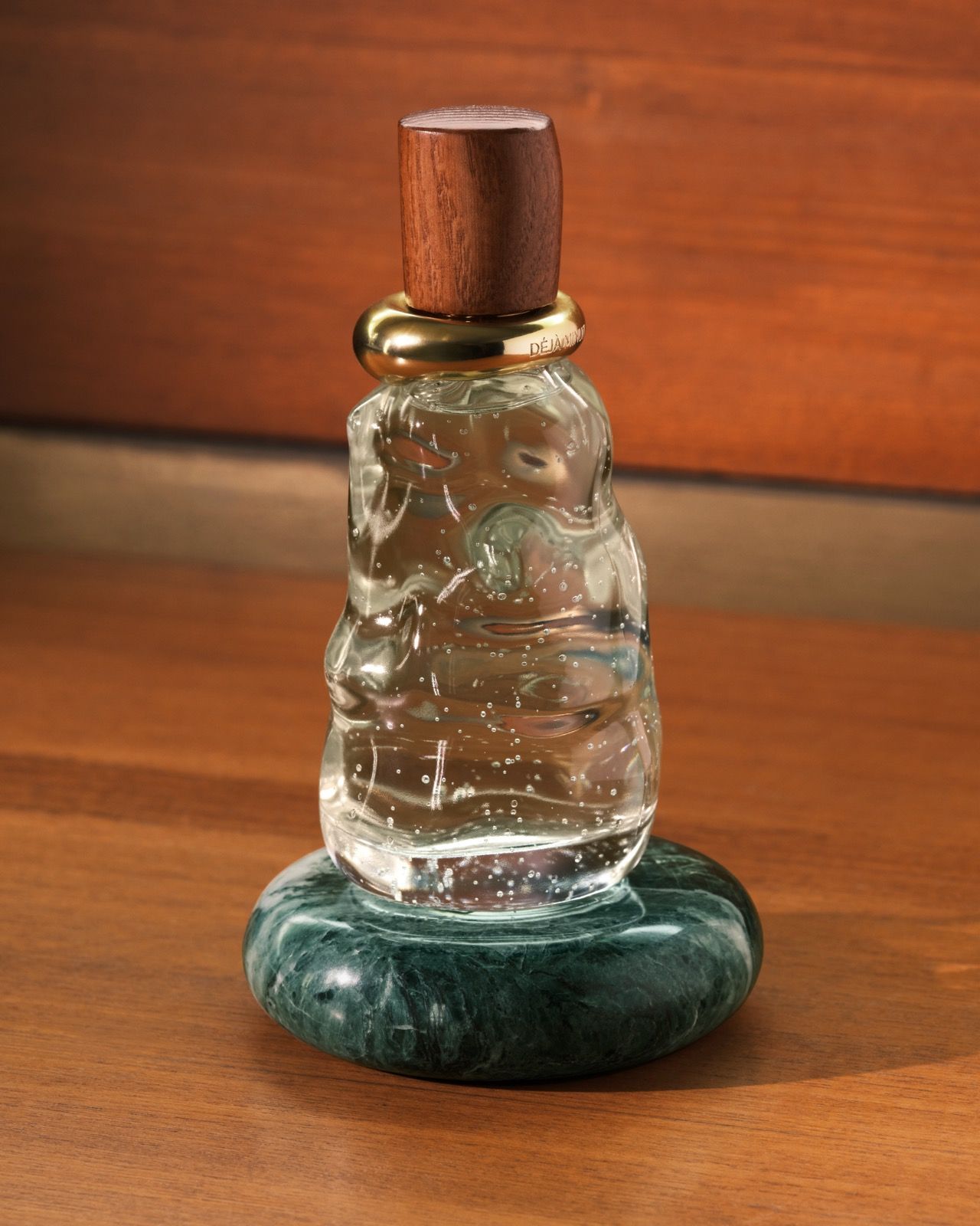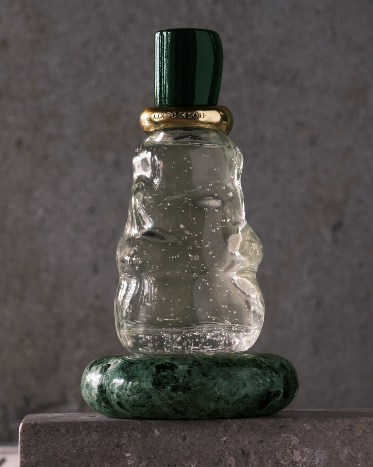 Blazy’s fragrance collection elevates the bottle to an exceptional level of craftsmanship and tactile pleasure. It is an object that not only contains the perfume but also embodies the Veneto region and the artisanal heritage of the Maison. The translucent glass bottle, with its fluid and sinuous shape, evokes the lagoon environment of Venice. Through an innovative process developed specifically for this project, the bottle mimics the look of blown glass and contains air bubbles, unique to each bottle. This distinctive effect pays homage to the centuries-old tradition of Murano glassblowing, which was recently incorporated into the set design of Blazy’s Winter 24 fashion show. The bottle rests on a base of Verde Saint Denis marble, the same marble used in Blazy’s store designs. In addition to literally elevating the bottle beyond its function, the miniature pedestal recalls the walls, floors, and facades of Venetian architecture. In a playful inversion of this architecture, the bottle is designed as an elegant keepsake, reusable, and made entirely from eco-friendly materials, with no plastics involved.