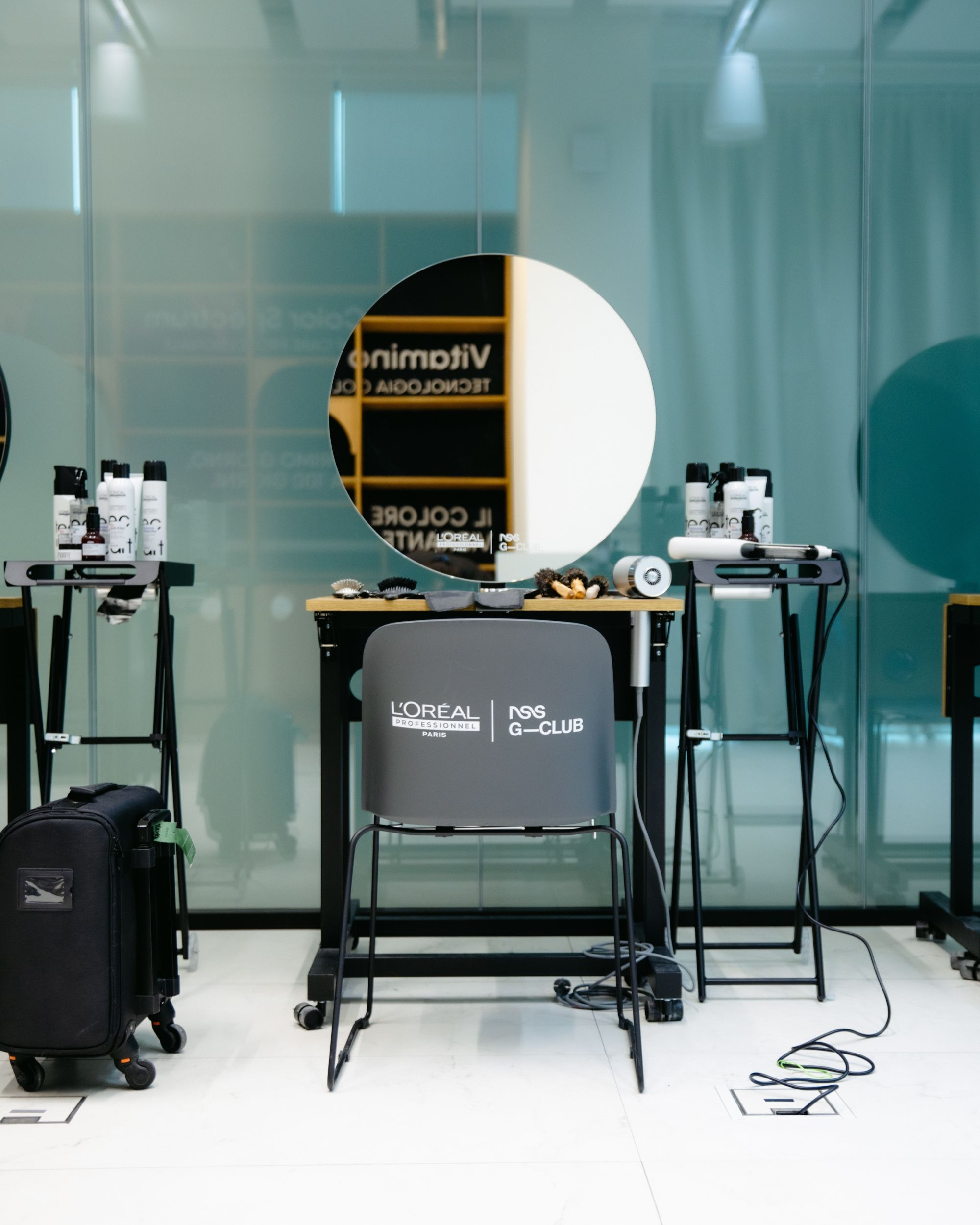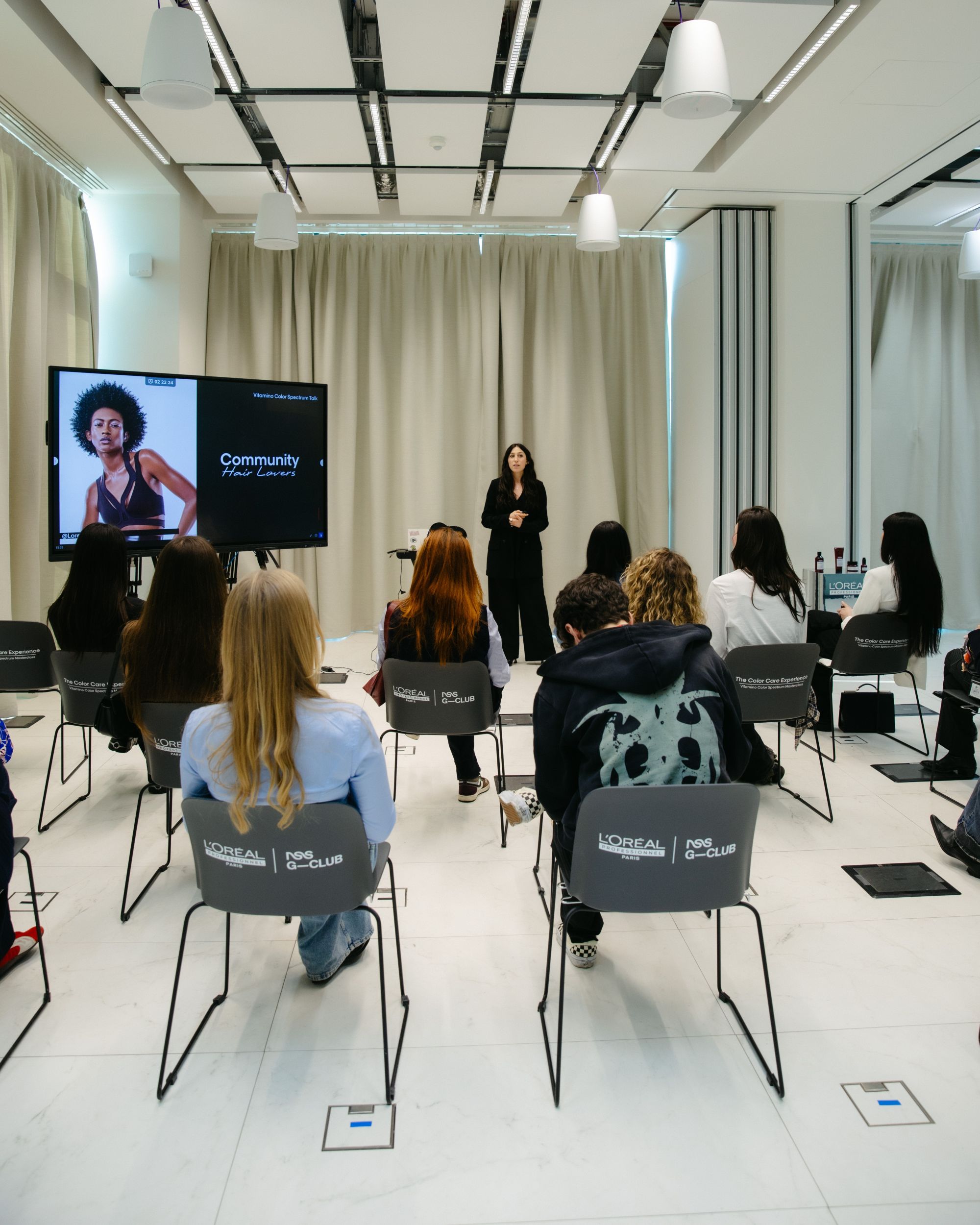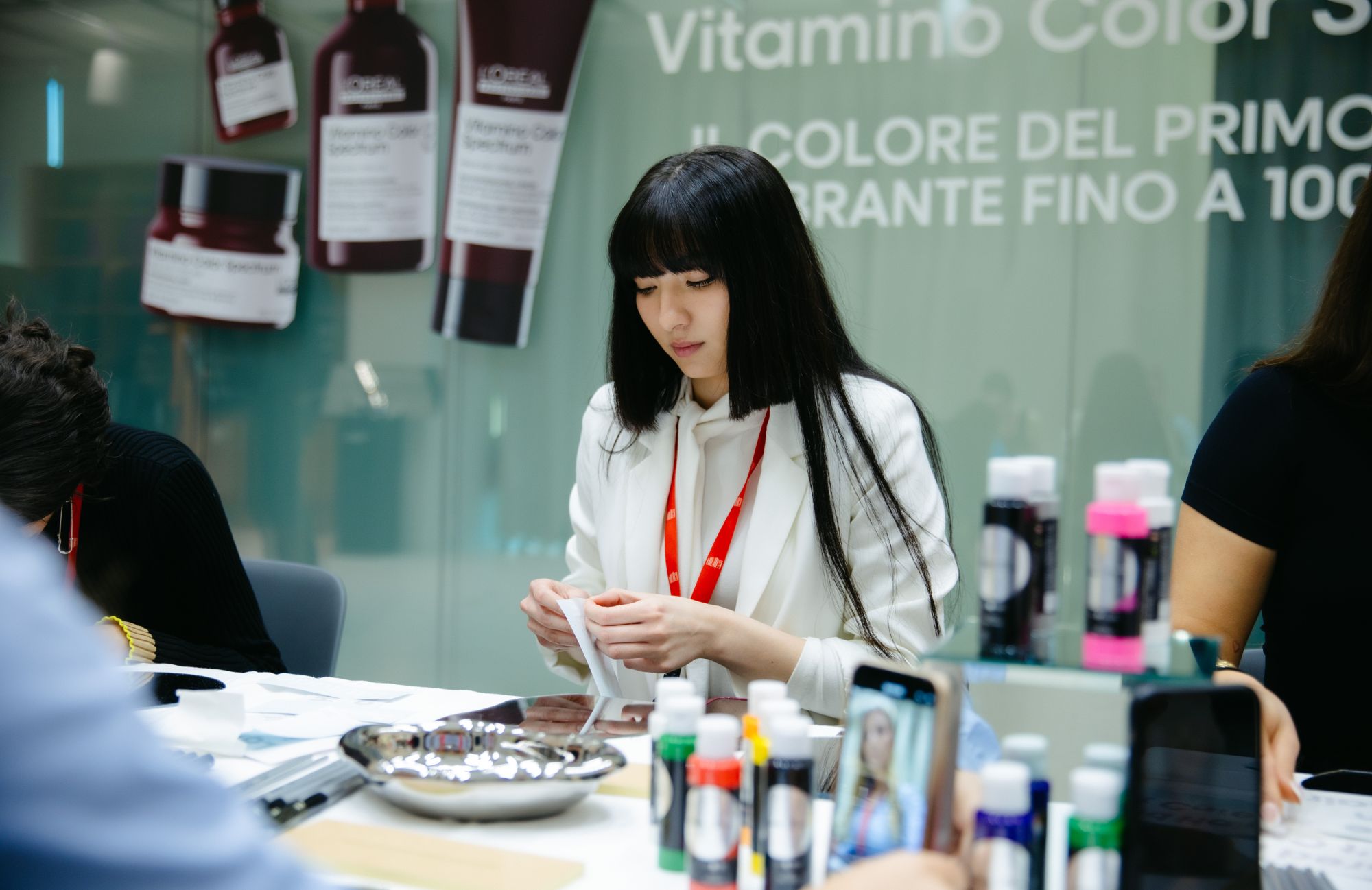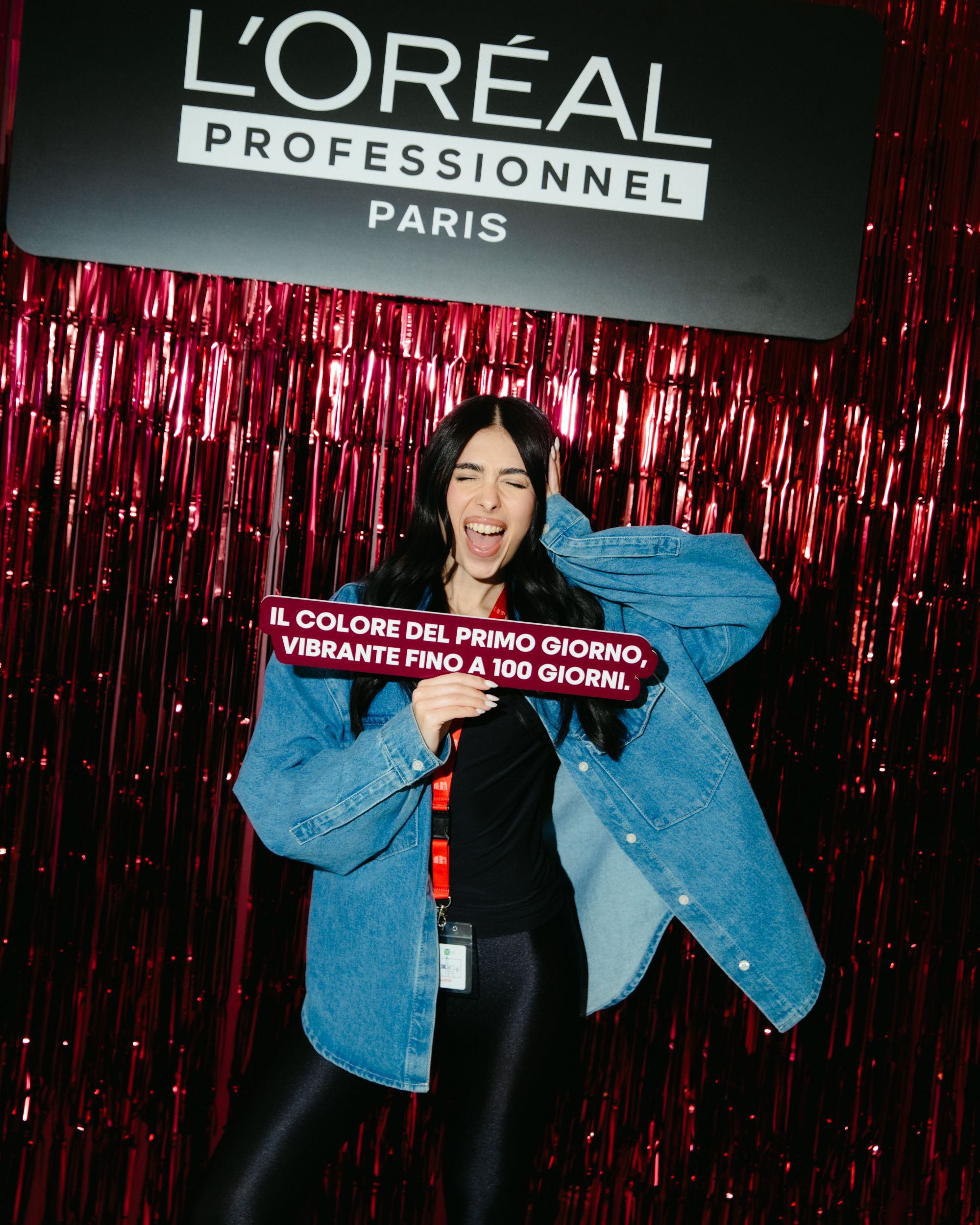 To introduce this new line to its community and make use of its new headquarters, L'Oréal Professionnel organized a masterclass at its Academy, usually dedicated to training. Here, creators had the opportunity not only to discover and experience the range firsthand but also to unleash their creativity by personalizing a mirror with phrases and words related to hair care, self-esteem, and their own vibrant, colorful personalities. Special guests included content creator Carlotta Fiasella alongside her dynamic hairstylist duo, Sergio Castiglia and Graziella Cassanelli. Together, they introduced the features of the Vitamino Color Spectrum range, explaining its benefits for hair and how it can be used by both consumers and professional hairstylists.