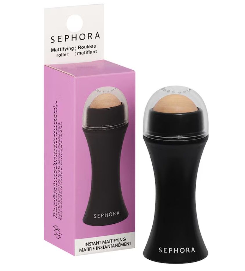 A mattifying roller is always the first step. If you were about to go straight in with a layer of powder, pause for a second: applying it on top of built-up shine will only make things look cakey. Absorb first, then fix. Just roll or blot the shiny areas and, in most cases, you’ll realize you don’t even need to add anything else, it was simply the excess sebum ruining everything.