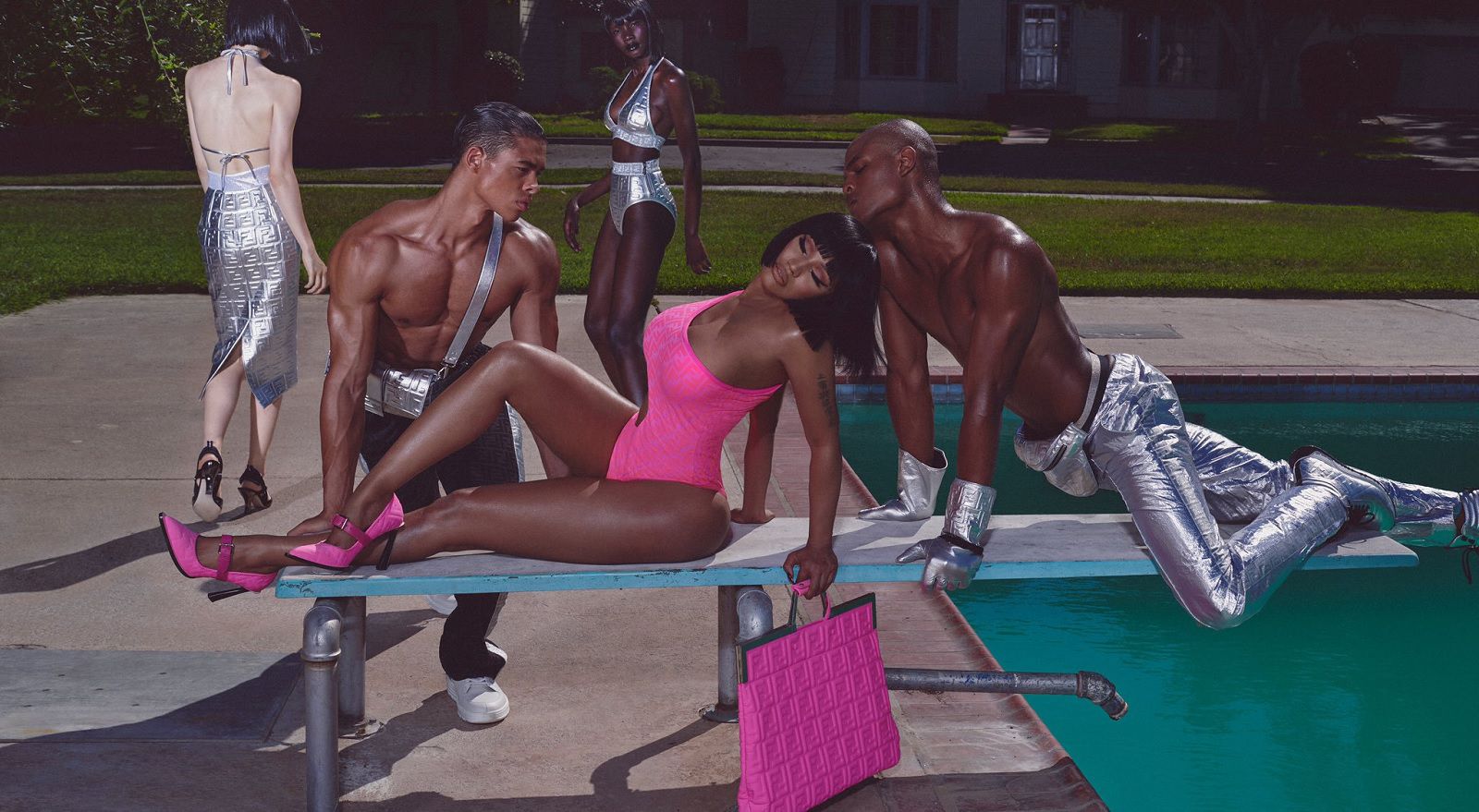The capsule includes reversible oversized puffers and coats, mink bomber jackets, sequined tulle dresses, bodysuits, t-shirts and sweatshirts with captivating graphics, silver tracksuits, but also bodysuits, one-piece swimsuits, and bikinis. All characterized by the FF all lover logo, metallic spatial touches, shocking pink. The same street-glamour and eccentric attitude also invades the accessories: from the iconic Peekaboo and Baguette bags to the new Kan U, from the multi-accessories belt bag to the sunglasses. A combination of shiny silver, fluorescent pink and high-performance materials make special trainers, moonboots and FFrame court shoes.