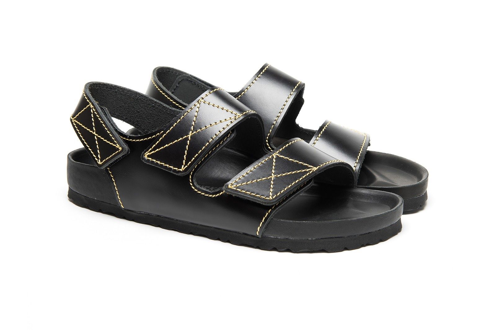 The duo reinvented two iconic German brand models, Arizona and Milan, with a more sporty and practical design. The metal buckles have been replaced by Velcro closures and embellished with thick contrasting stitching, a nod to the visual language of vintage sneakers and combat boots.