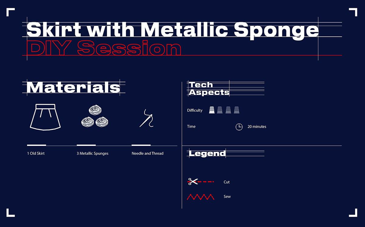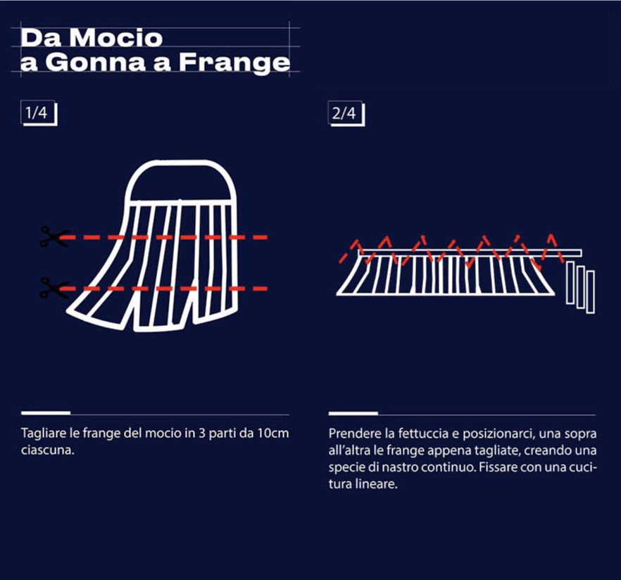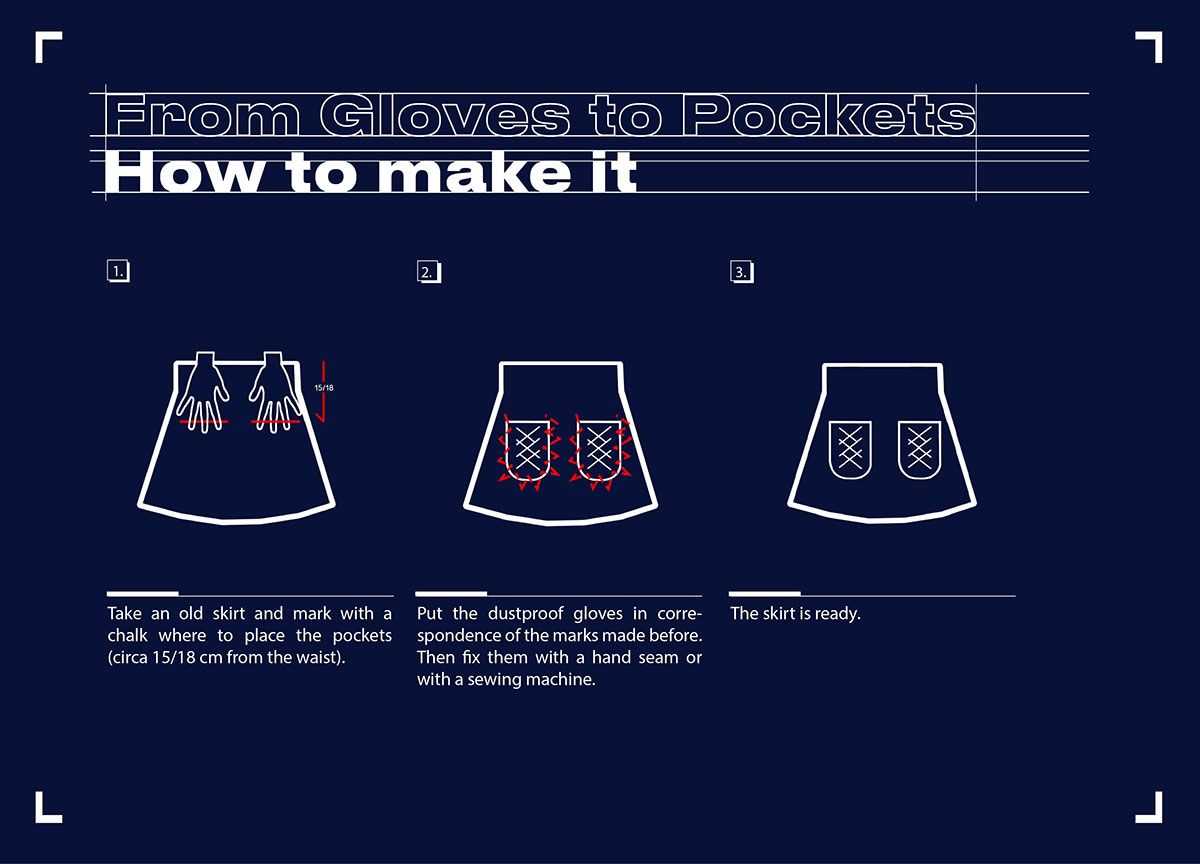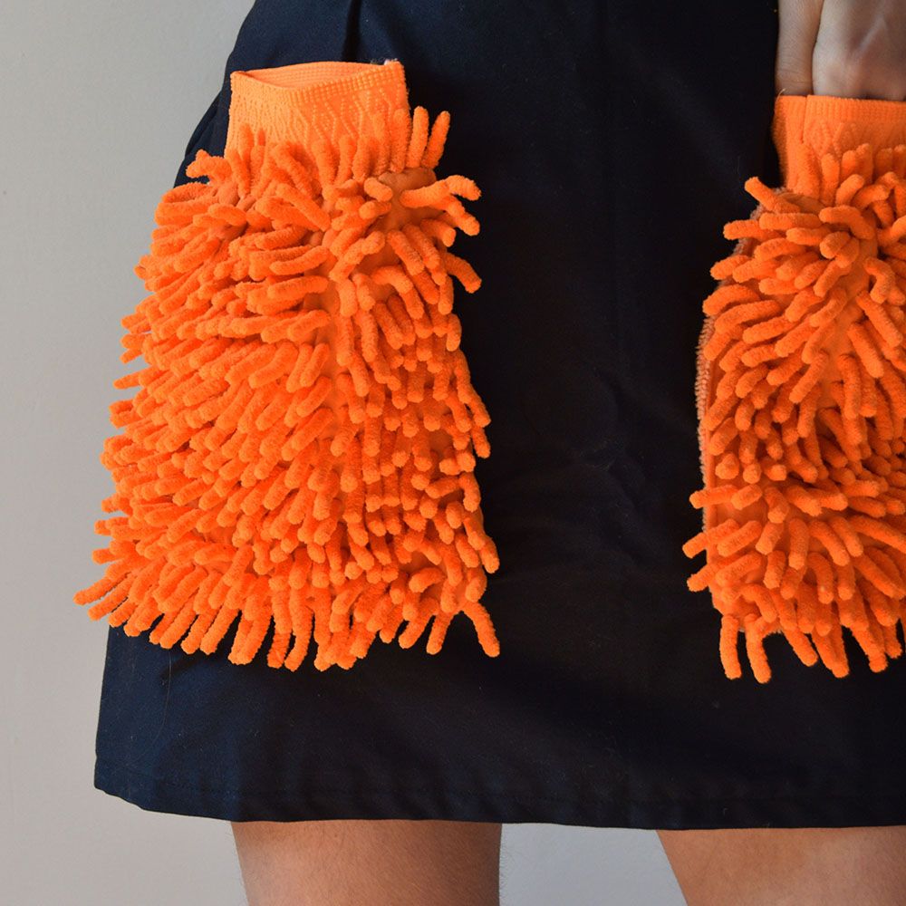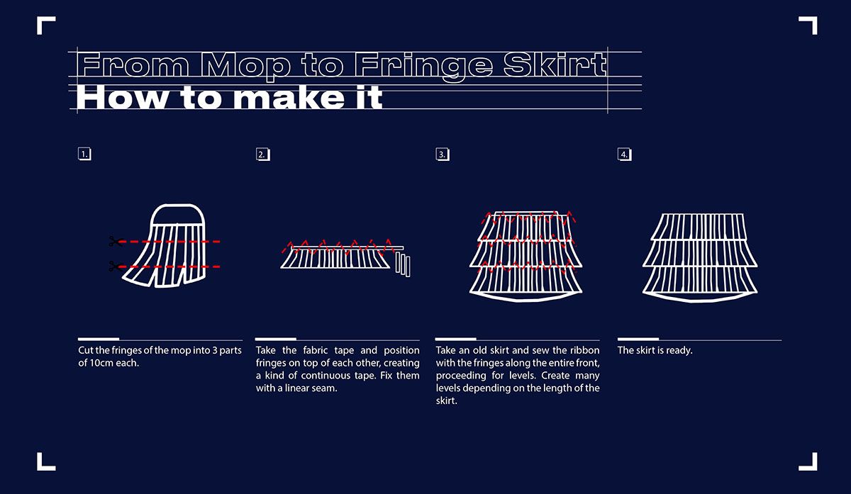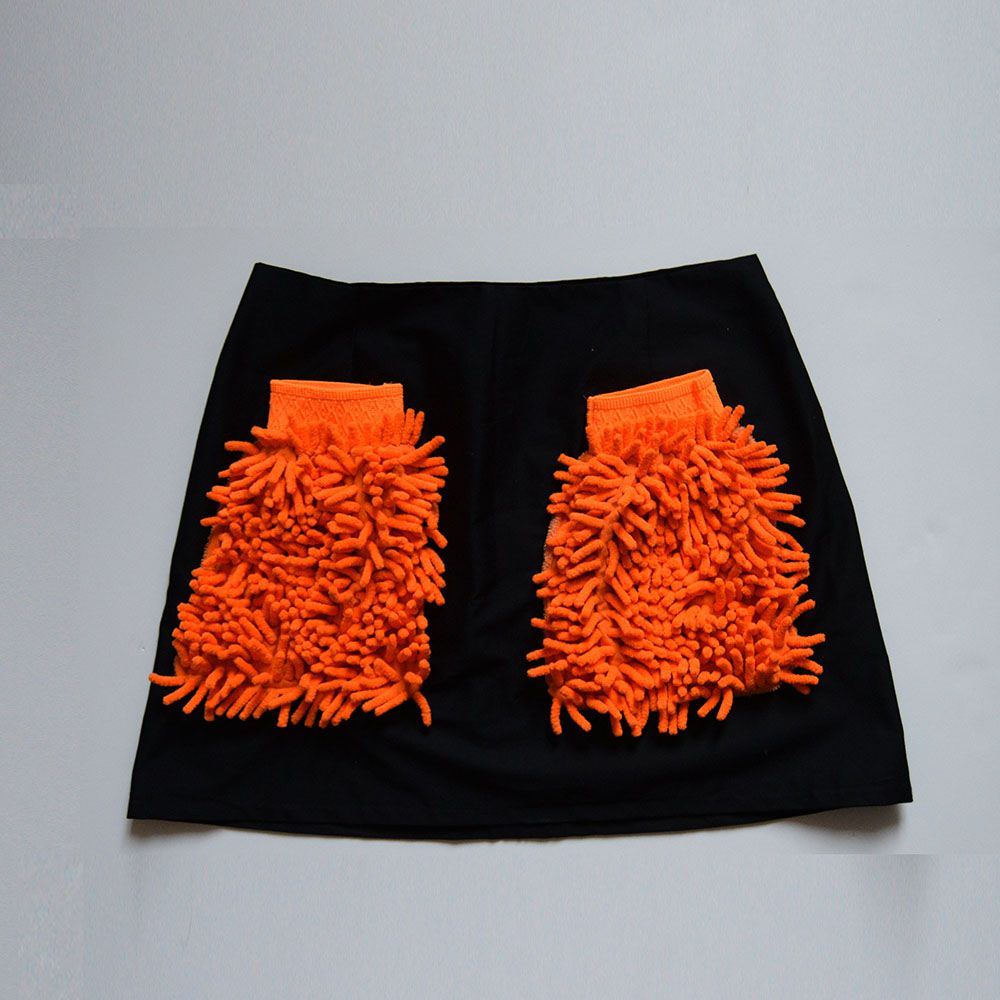 In this experiment the following items were used: metal sponges, which we turned into inserts to be applied by hand on a skirt, to create bright details that look like jewels; a mop, we turned the fringes into a decorative element to be applied directly on the skirt; gloves for dusting, that became colourful and fun pockets. Ready to customize?
