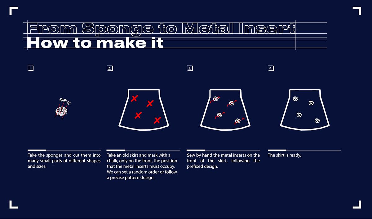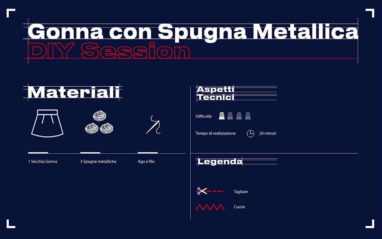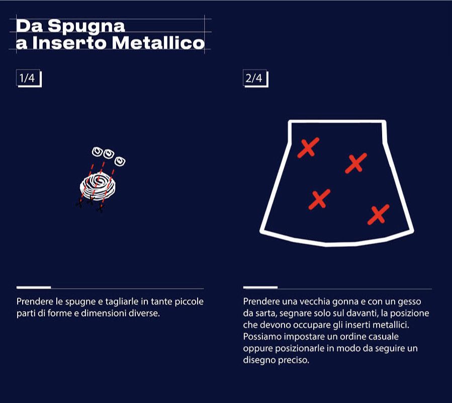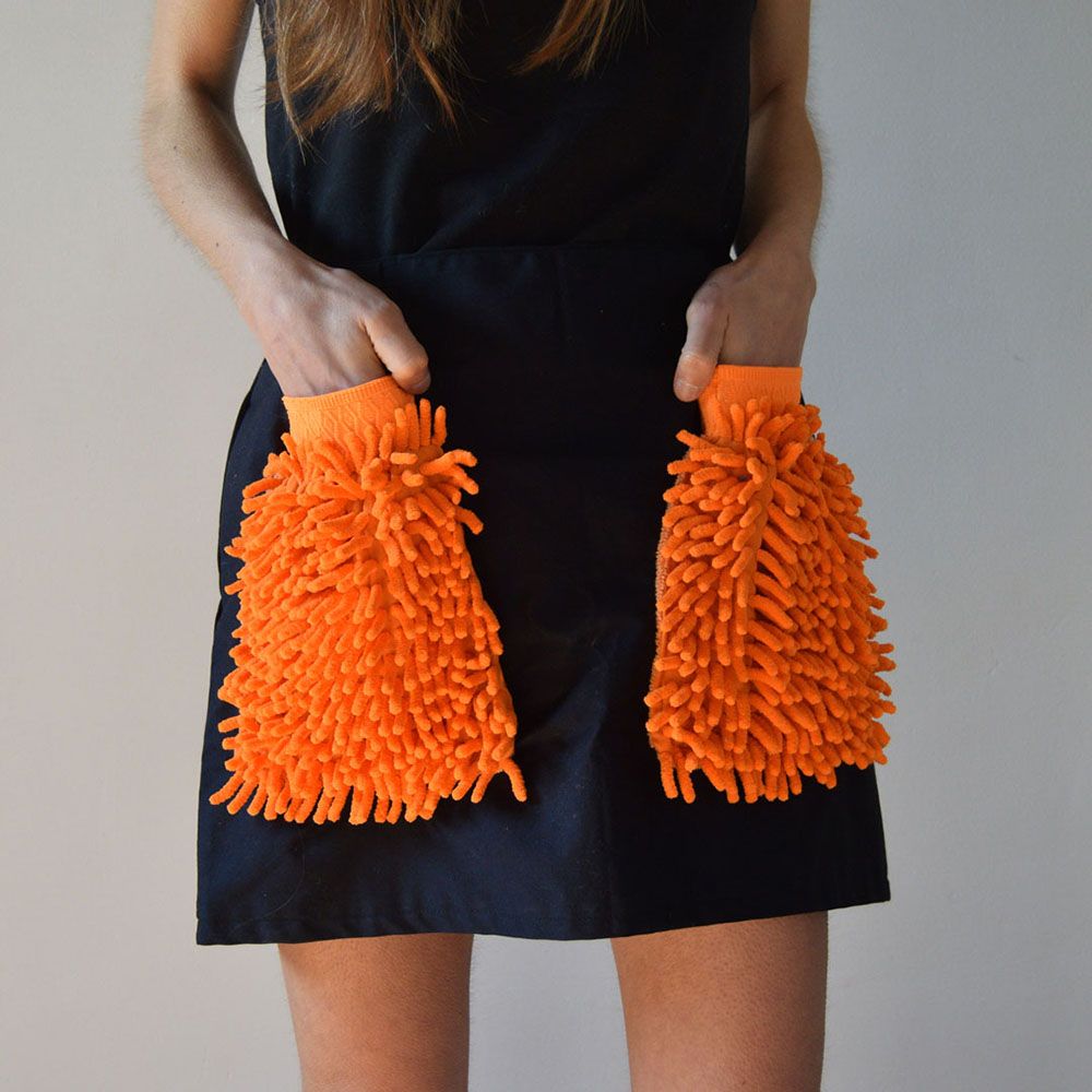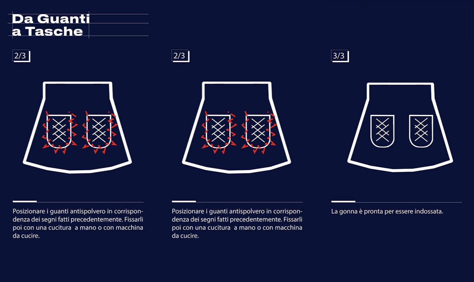 In this experiment the following items were used: metal sponges, which we turned into inserts to be applied by hand on a skirt, to create bright details that look like jewels; a mop, we turned the fringes into a decorative element to be applied directly on the skirt; gloves for dusting, that became colourful and fun pockets. Ready to customize?