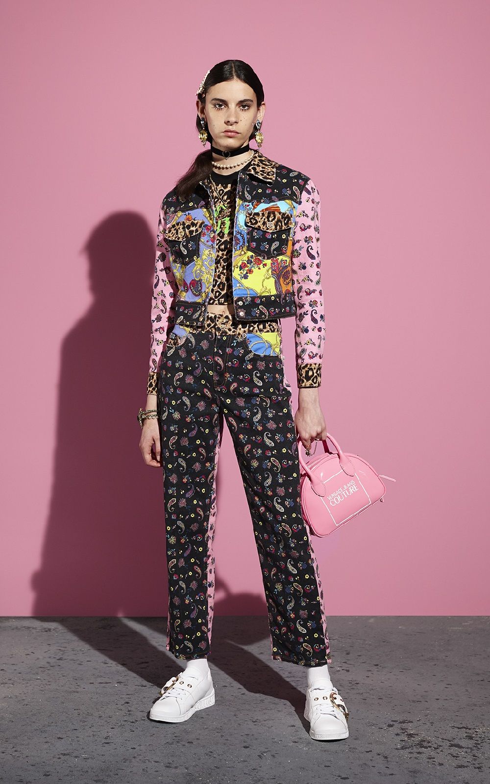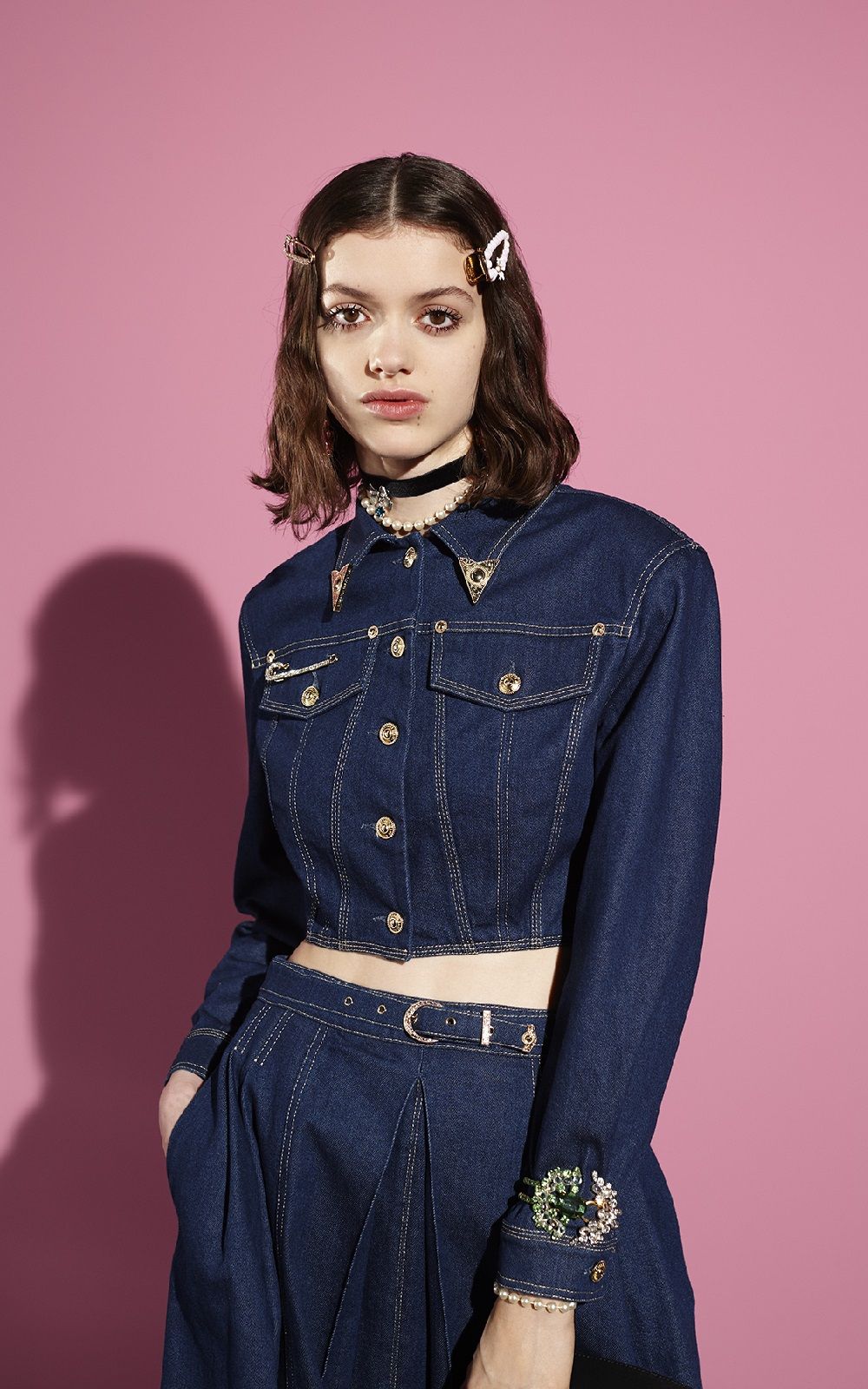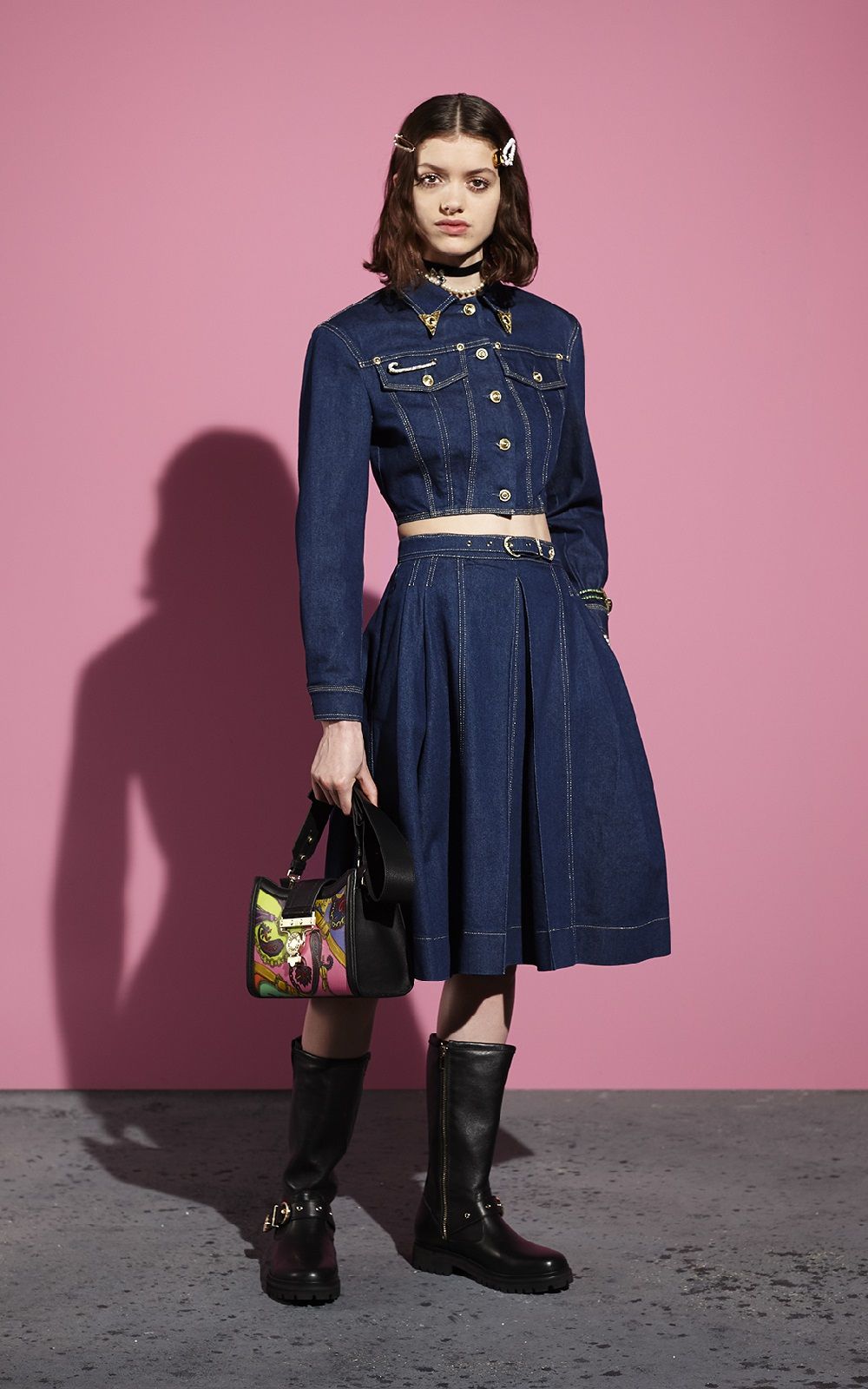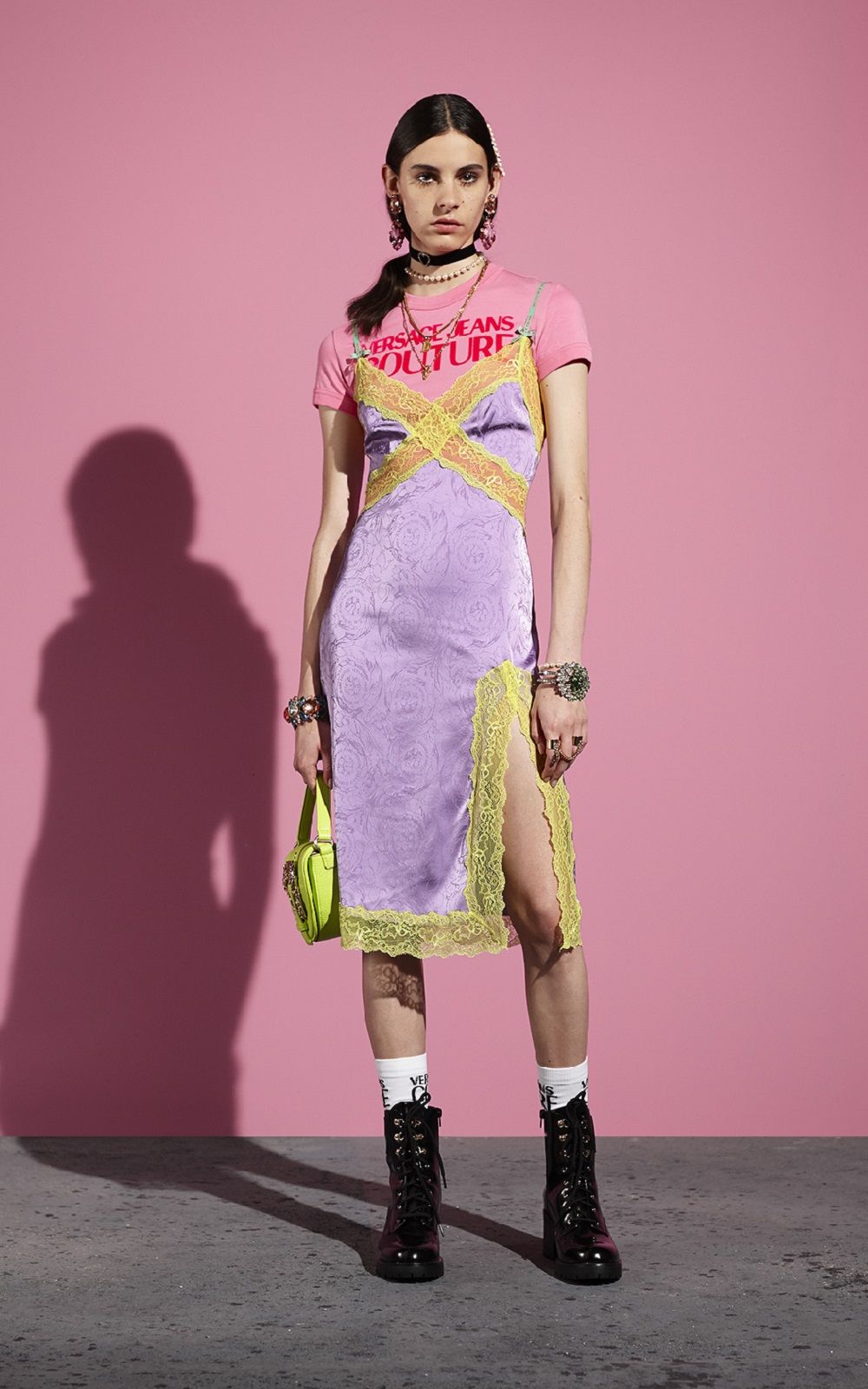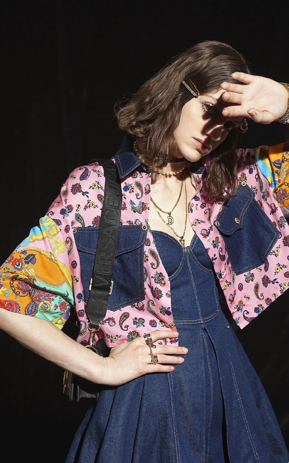The sixties silhouettes meet the girly rebellious mood of the 90s Riot grrrl in Versace Jeans Couture's FW20 collection. Starting with denim, which is a key element of the line, the brand plays with the codes of femininity by inserting unconventional details recalling the decade of grunge, when Courtney Love appeared on stage wearing slip dresses, torn fishnet stockings and biker boots.