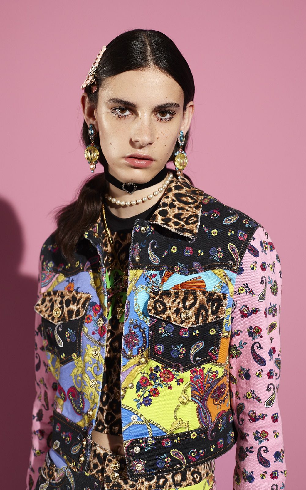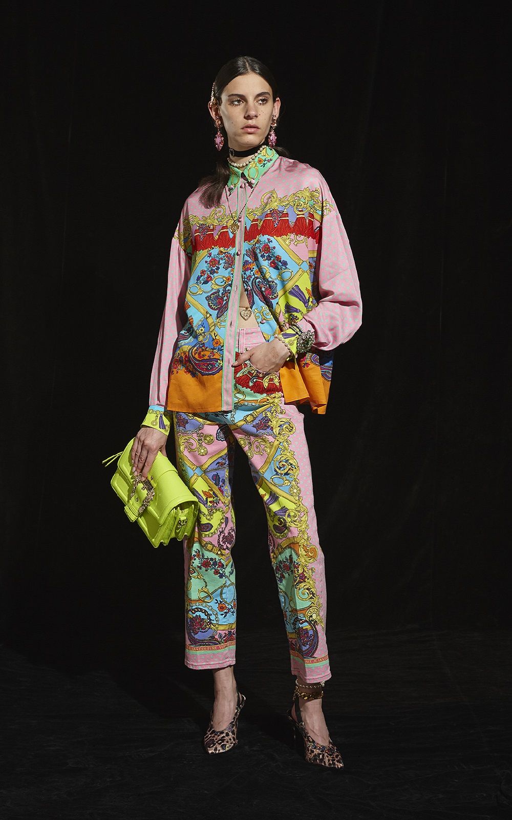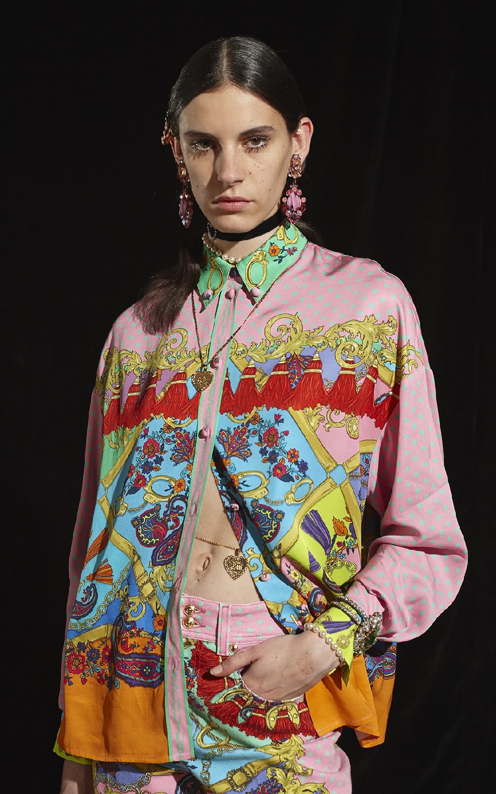Jeans mix with pinstripe tailored pieces, micro cardigans with the oversized shirts, silk and lace baby dolls with leather jackets, pastel colorful prints with metal studs and spikes, flared pants with tweed suits. The scarves with their colorful, baroque, animal prints and paisley are more than just an accessory, they are the feature that gives cohesion and contemporaneity to every item, from shirts to bags.