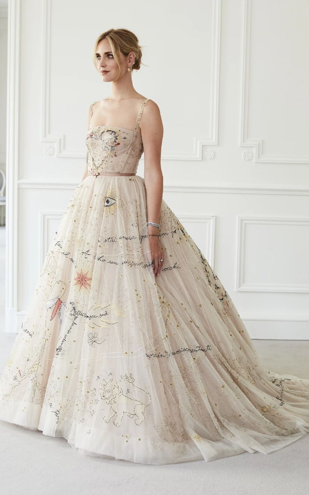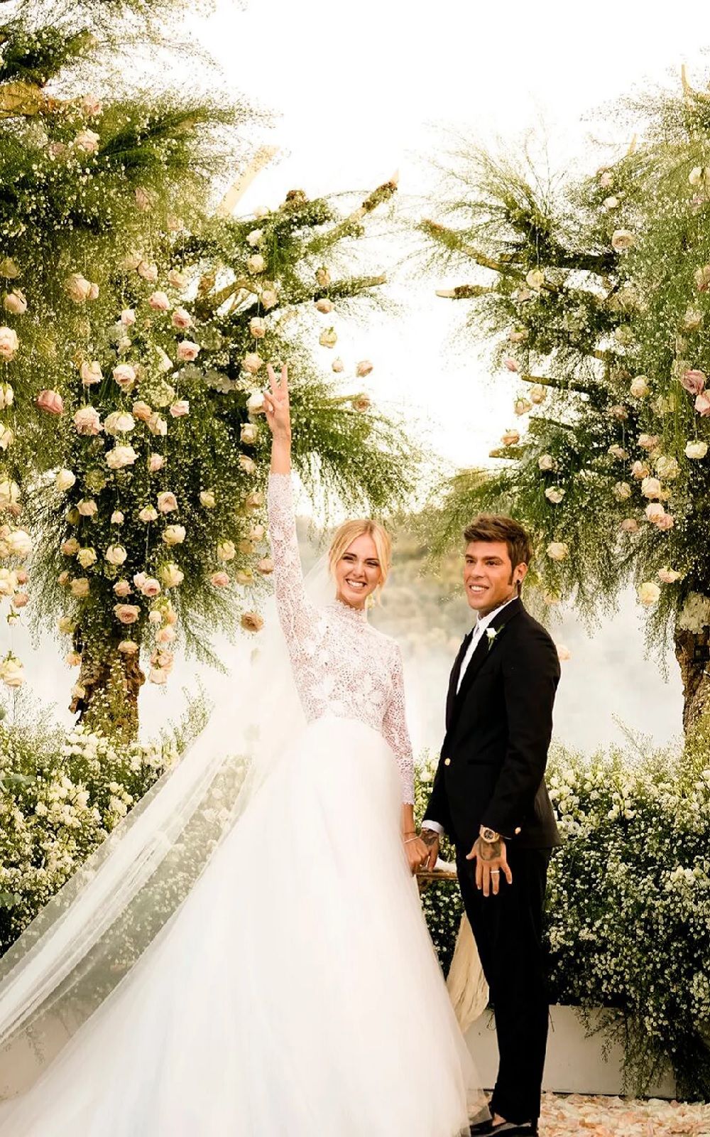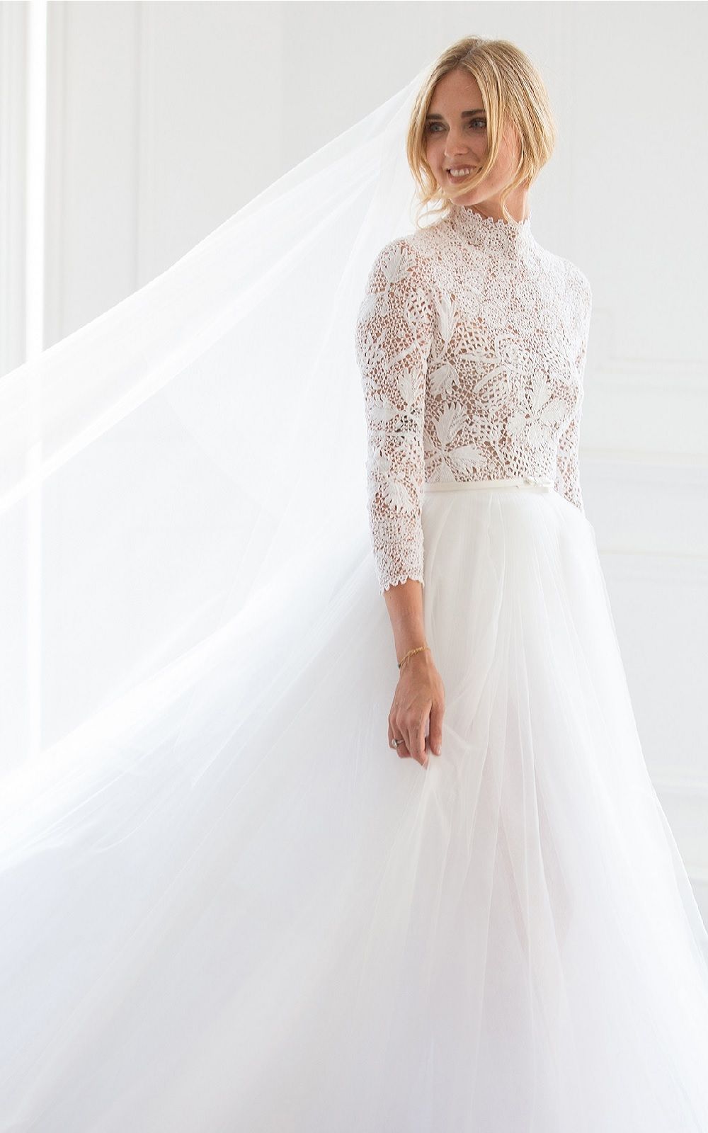 The Ferragnez wedding was one of the viral events of 2018. To celebrate their special day, the couple recreated a carnival in Noto, Sicily. Among gadgets and selfies, the attention was caught by Chiara Ferragni's outfits, all by Maria Grazia Chiuri, creative director of the Maison Dior. The influencer went to the aisle in a white dress featuring a lace bodice, adherent with long sleeves and fluffy tulle skirt. The secret? Detached the skirt, the corset turns out to be a jumpsuit. At the feet Chiara has white slingbacks customized with her name. For the party Ferragni switched her wedding dress with an ivory Haute Couture dress, characterized by the design of a small lion, the silhouettes of the two lovers in gold and multicolored threads and the lines of di Favorisca i sentimenti, the song with Fedez asked for the hand of his future bride at the Arena di Verona.