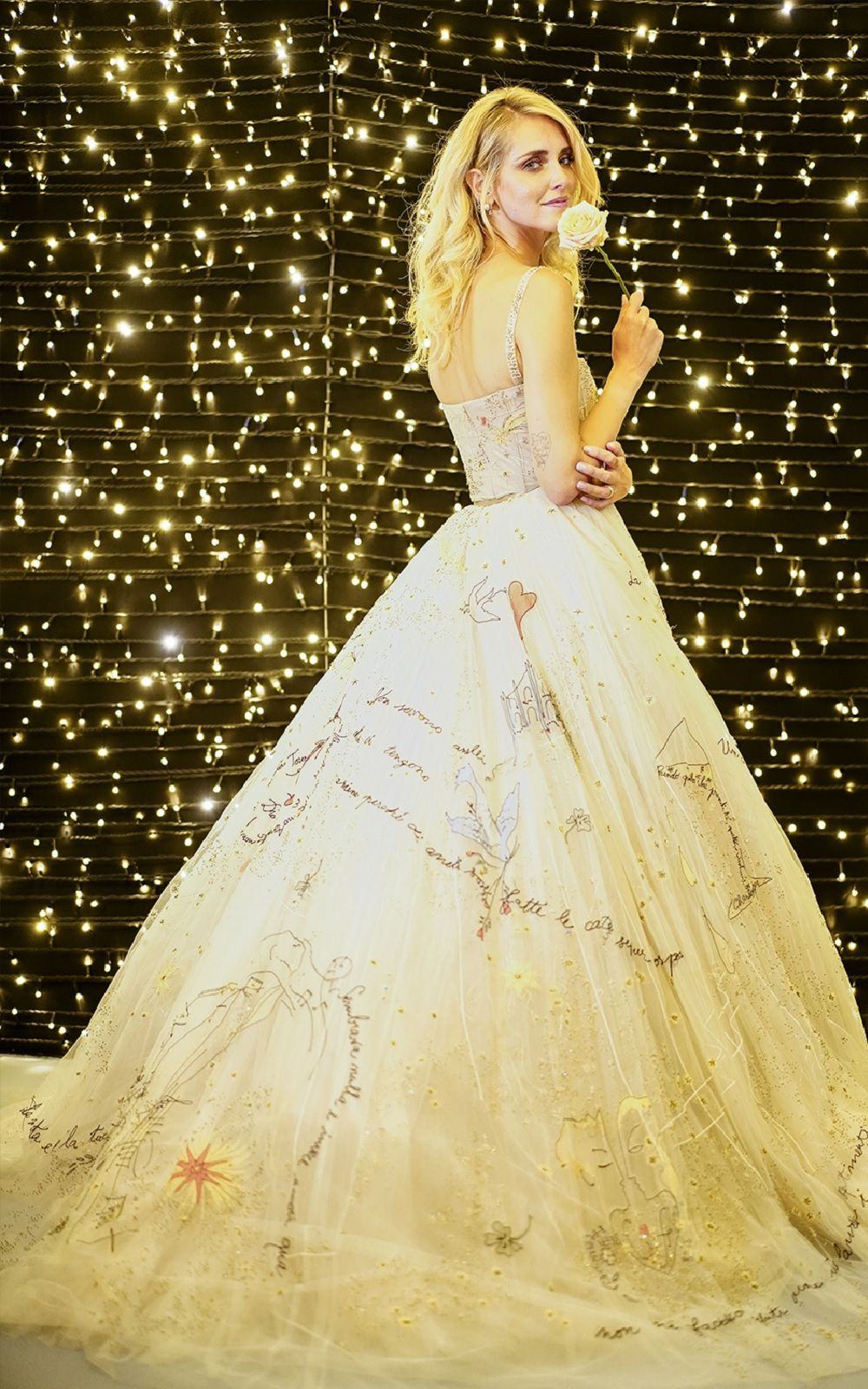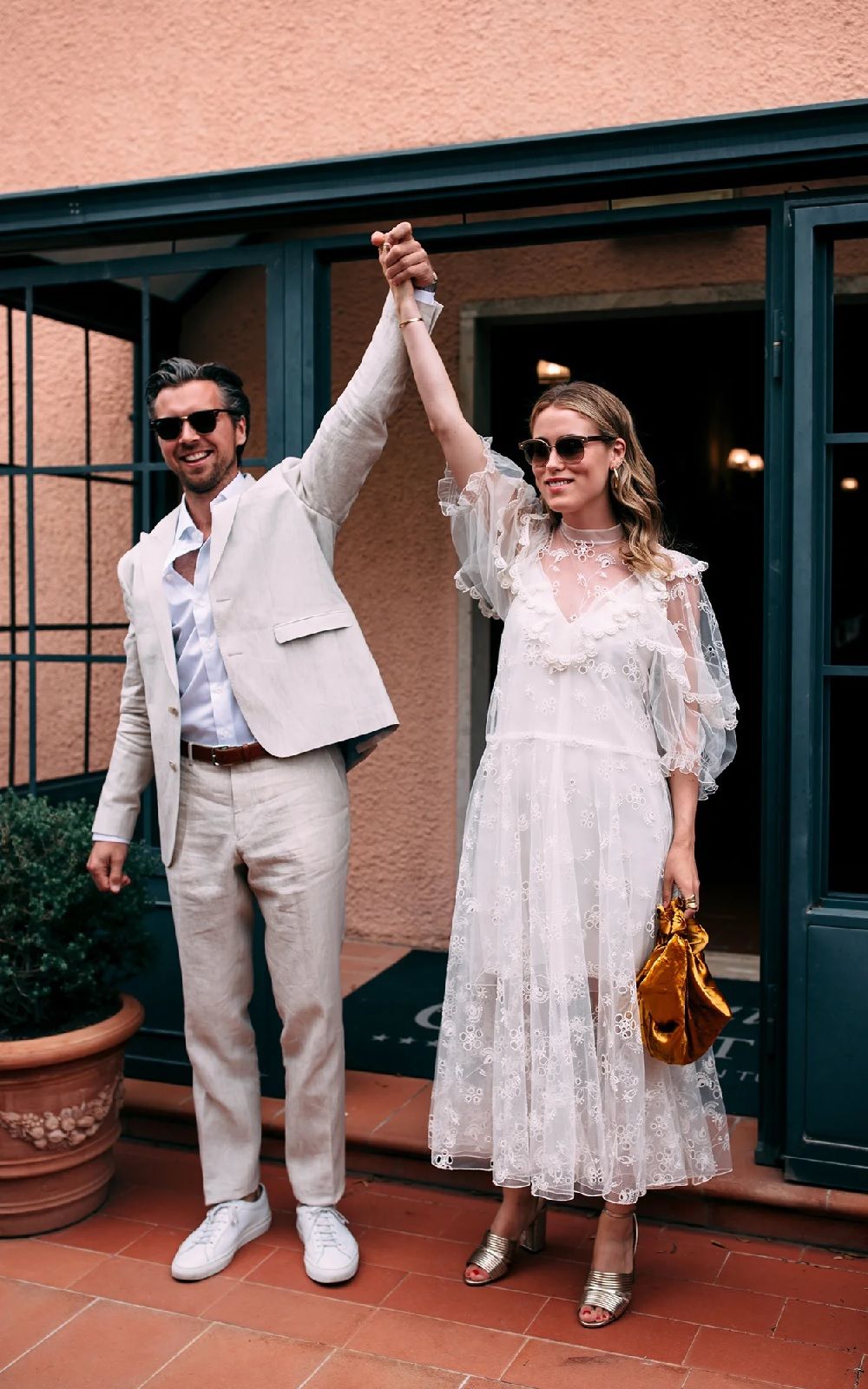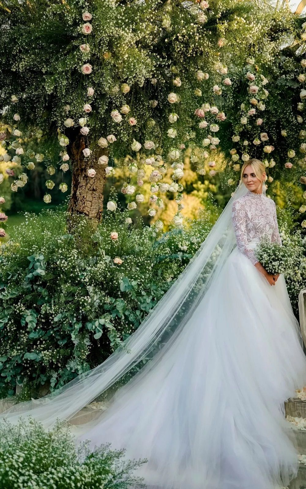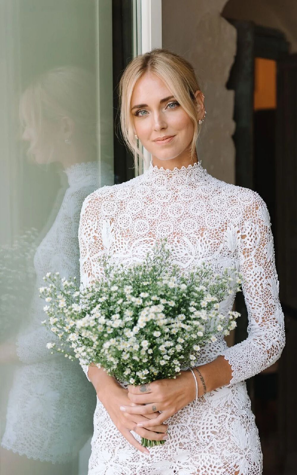 The Ferragnez wedding was one of the viral events of 2018. To celebrate their special day, the couple recreated a carnival in Noto, Sicily. Among gadgets and selfies, the attention was caught by Chiara Ferragni's outfits, all by Maria Grazia Chiuri, creative director of the Maison Dior. The influencer went to the aisle in a white dress featuring a lace bodice, adherent with long sleeves and fluffy tulle skirt. The secret? Detached the skirt, the corset turns out to be a jumpsuit. At the feet Chiara has white slingbacks customized with her name. For the party Ferragni switched her wedding dress with an ivory Haute Couture dress, characterized by the design of a small lion, the silhouettes of the two lovers in gold and multicolored threads and the lines of di Favorisca i sentimenti, the song with Fedez asked for the hand of his future bride at the Arena di Verona.