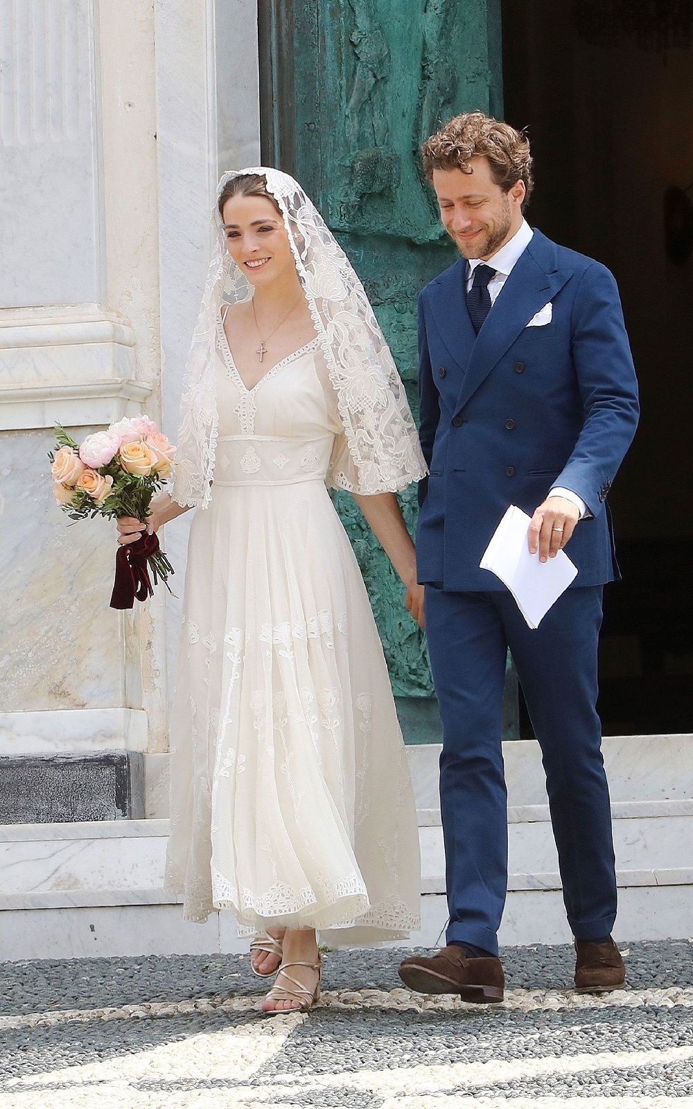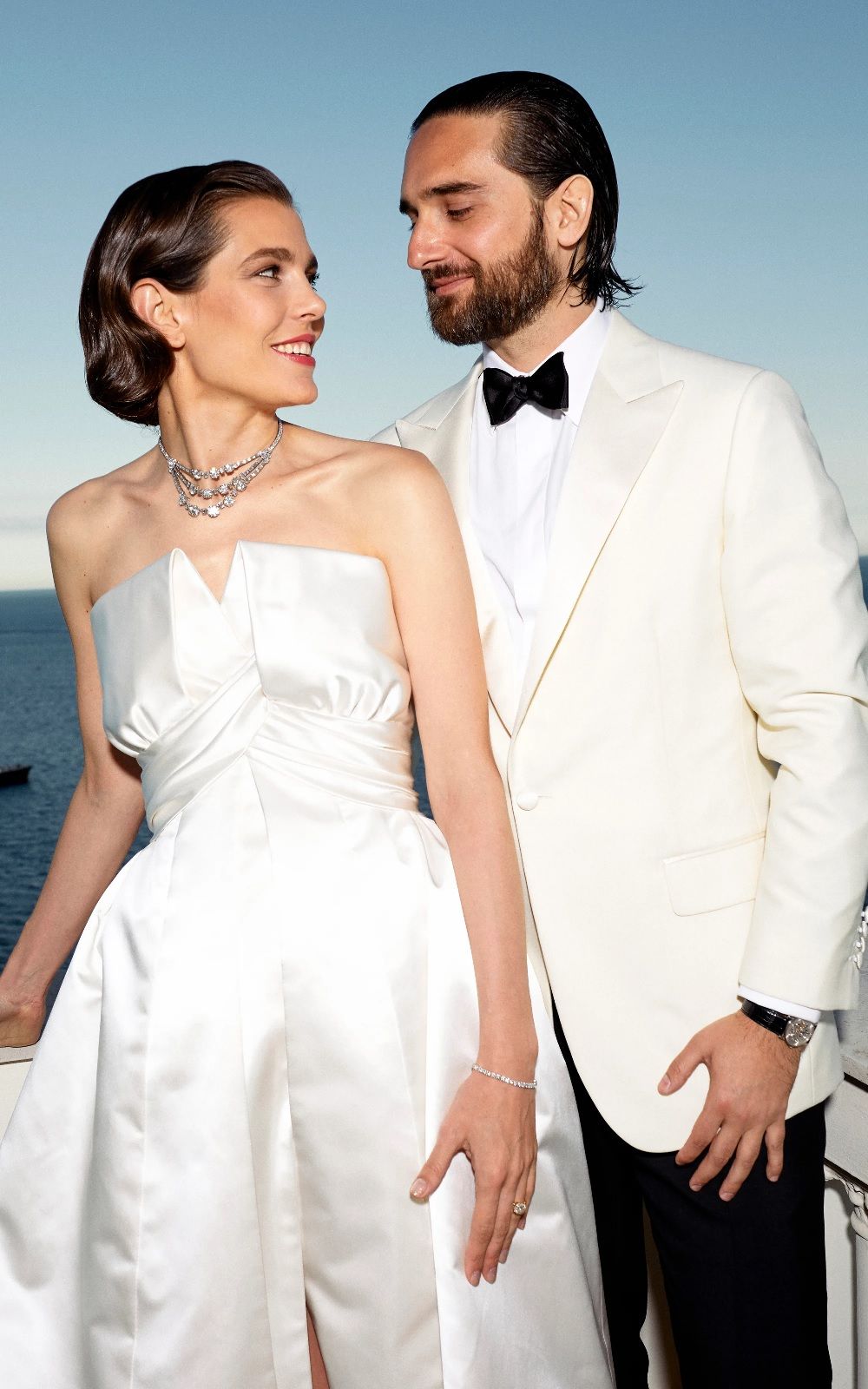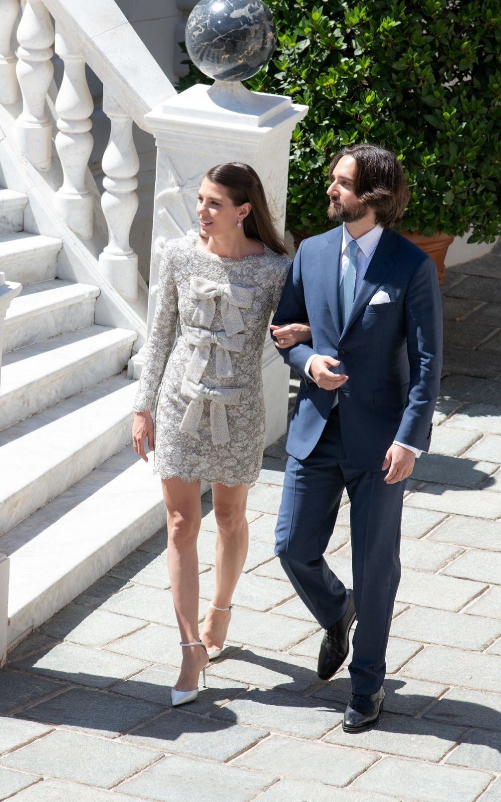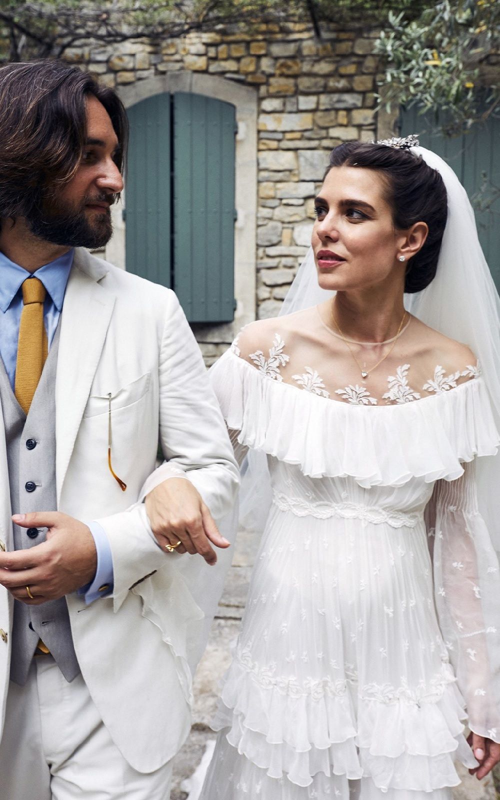 Double wedding for Charlotte Casiraghi and Dimitri Rassam. For the first one the princess wore an embroidered mini dress, with three large bows in front, by Anthony Vaccarello for Saint Laurent and, later, a white Chanel sleeveless dress with sweetheart neckline. During the religious ceremony in Saint Remy de Provance, Charlotte opted for a lace creation by Giambattista Valli that recalled the Dior by Marc Bohan wedding dress worn by her mother Carolina.