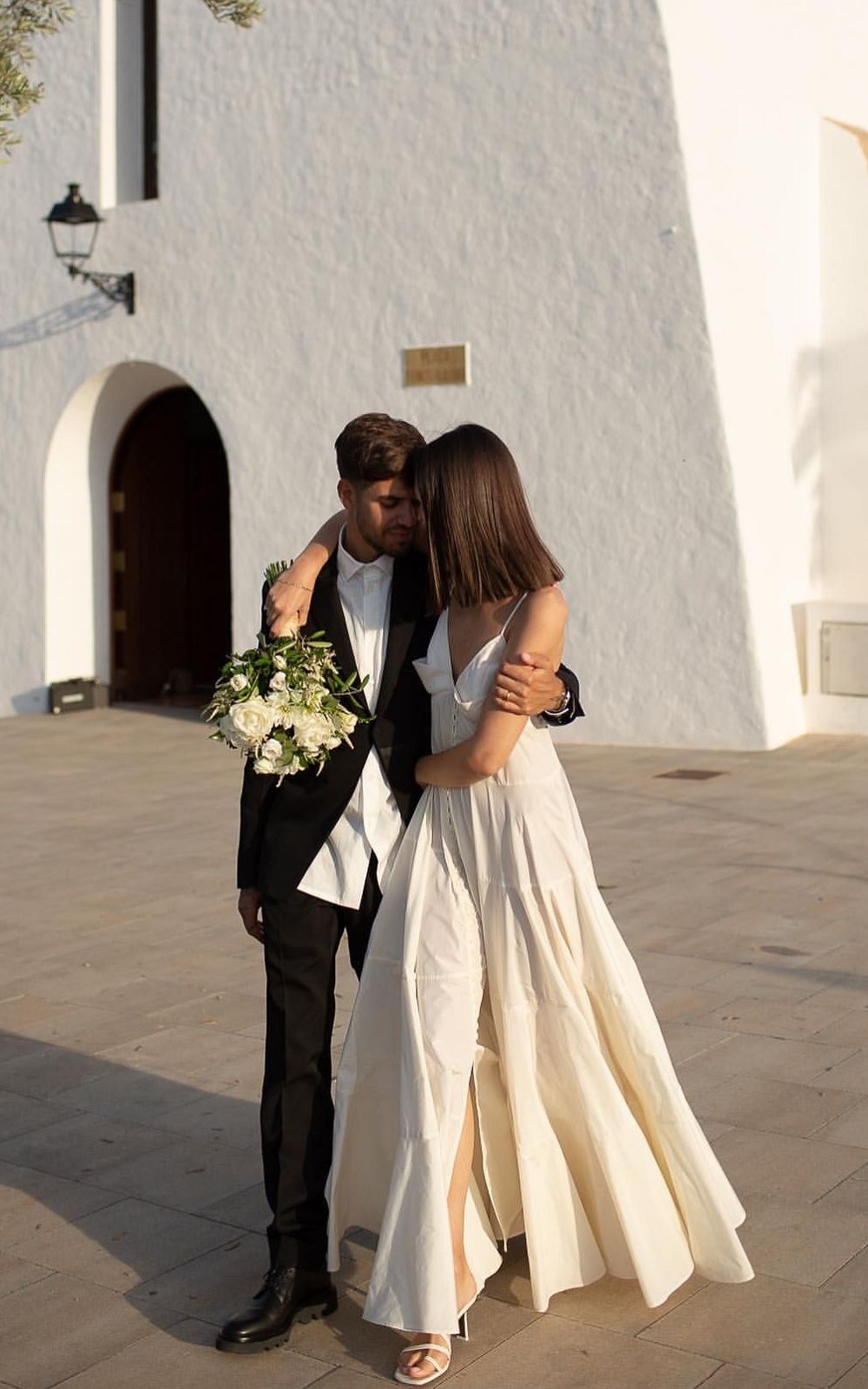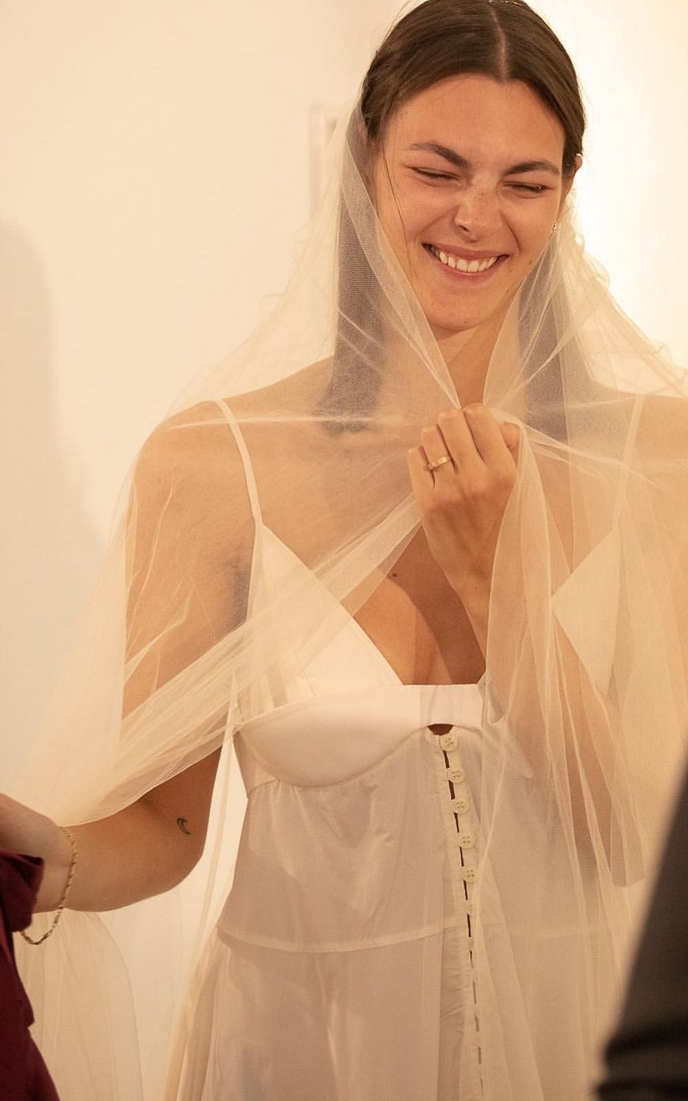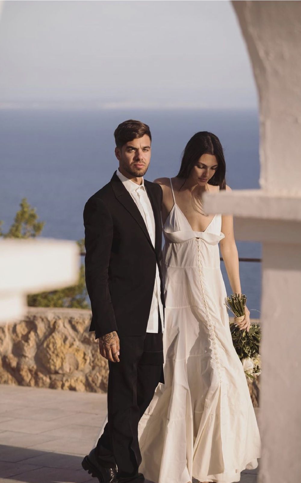 Vittoria Ceretti married DJ Matteo Milleri in Ibiza, in a small church overlooking the sea, in a white dress by Jacquemus. The creation that is part of the SS20 collection featured thin straps, deep V-neckline, soft skirt and a long row of central buttons that slides along the entire dress. To complete the minimal and Mediterranean look there were white sandals, a veil of organza and thin golden jewels.