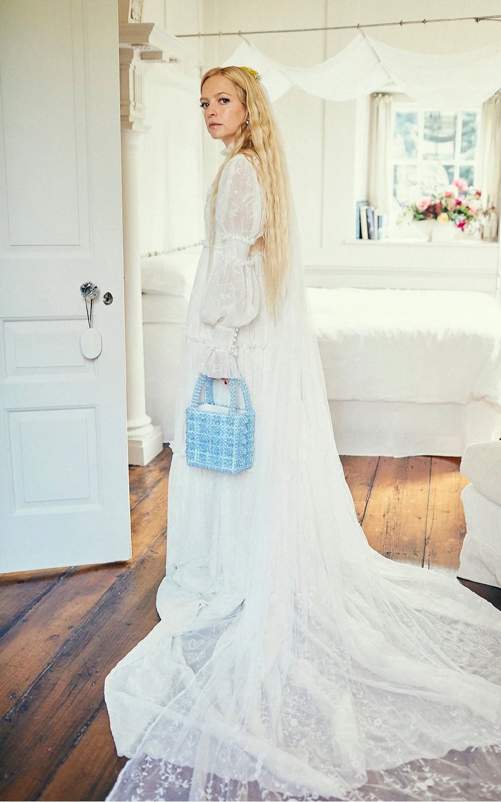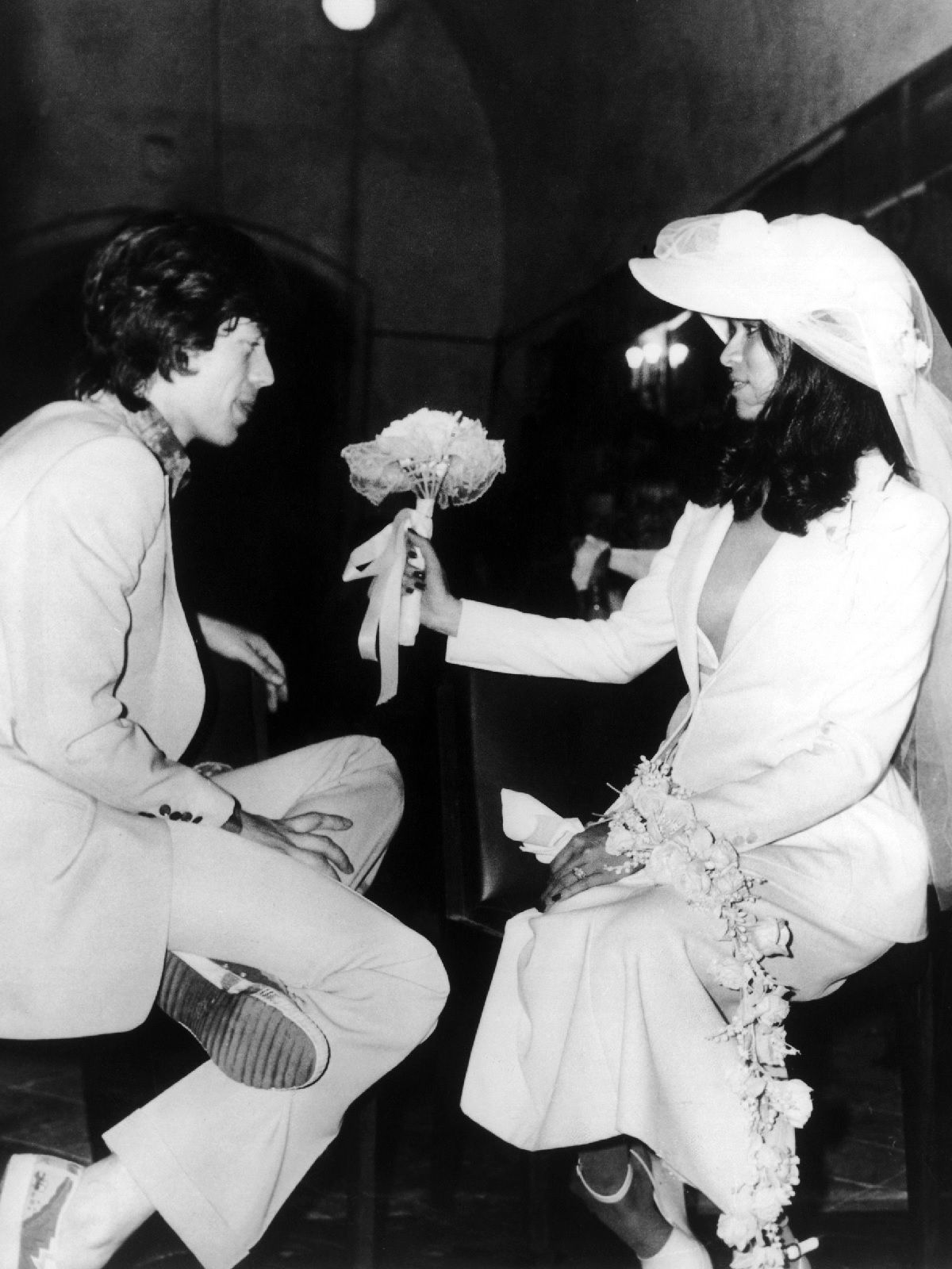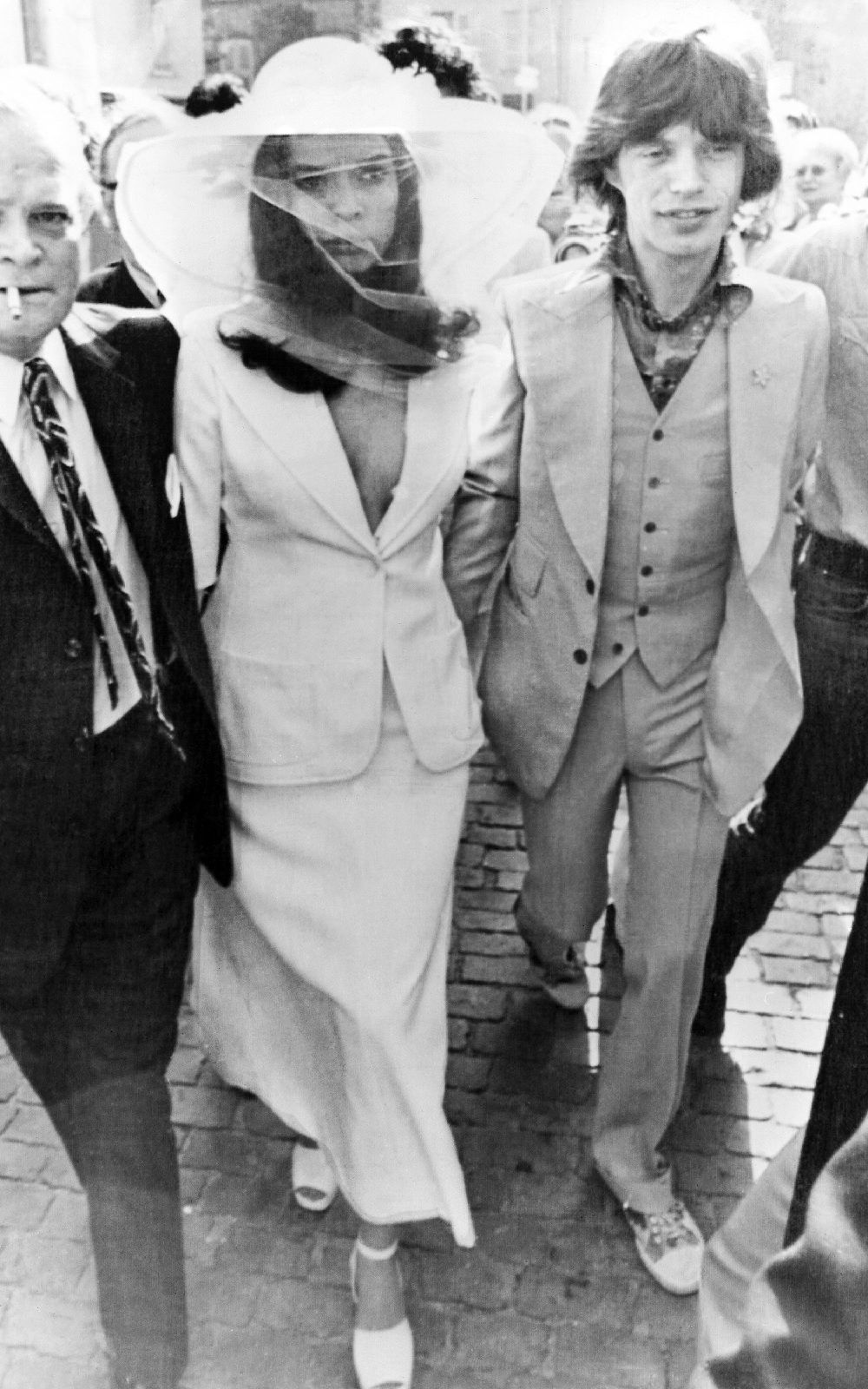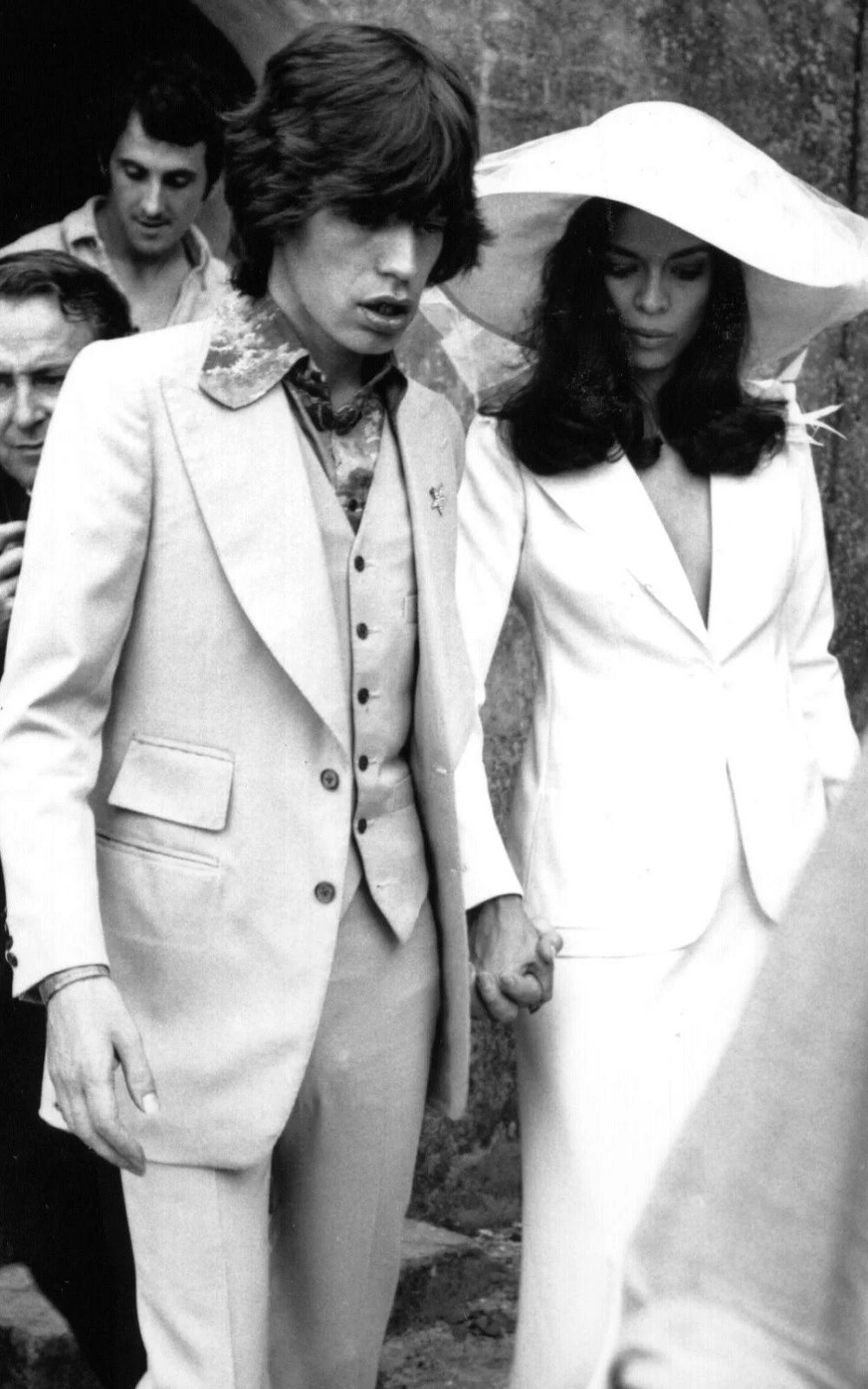 Despite this statement, Bianca Pérez-Mora Macias remains one of the most iconic brides ever. In 1971, already pregnant with her daughter Jade, she married Mick Jagger in St.Tropez wearing a white maxi skirt and a jacket by Yves Saint Laurent. She decided to ditch the blouse she’d intended to wear which, at four months pregnant, it no longer fitted. The only accessory was a wide brim hat with roses of fabric and a little tulle veil.