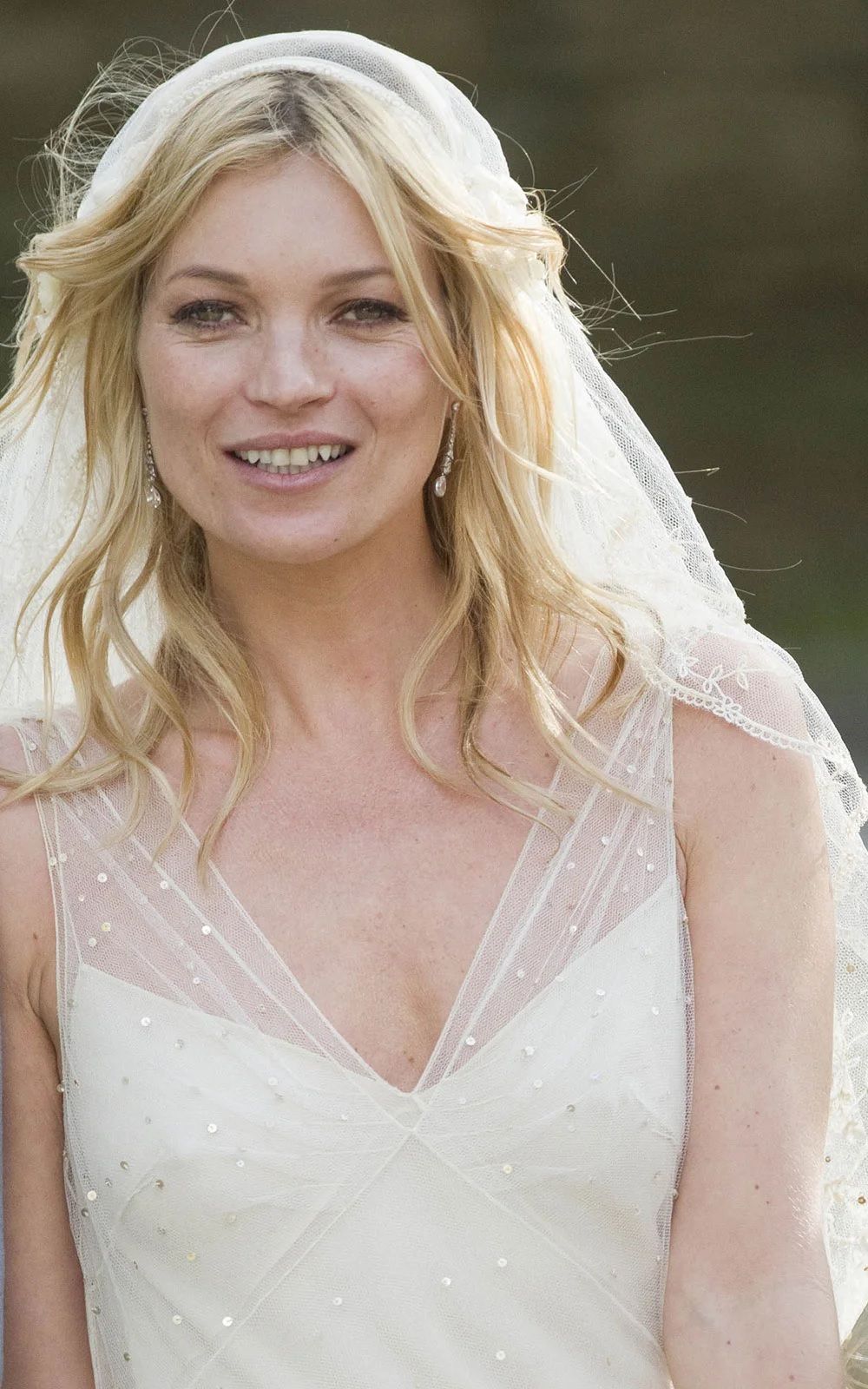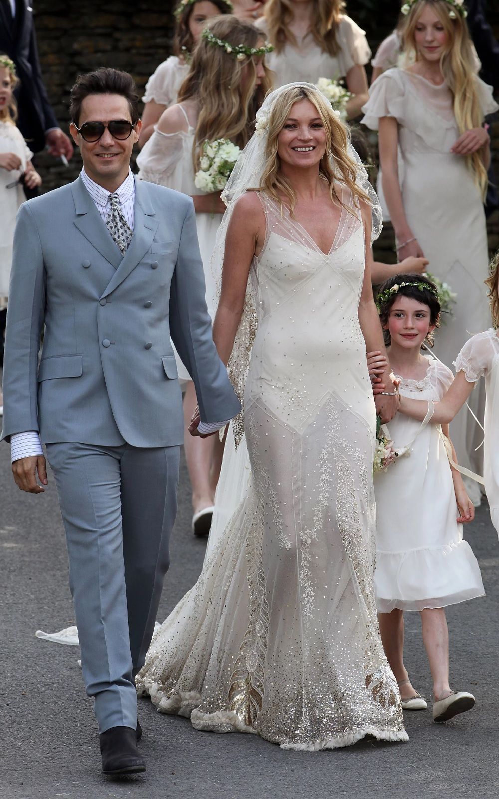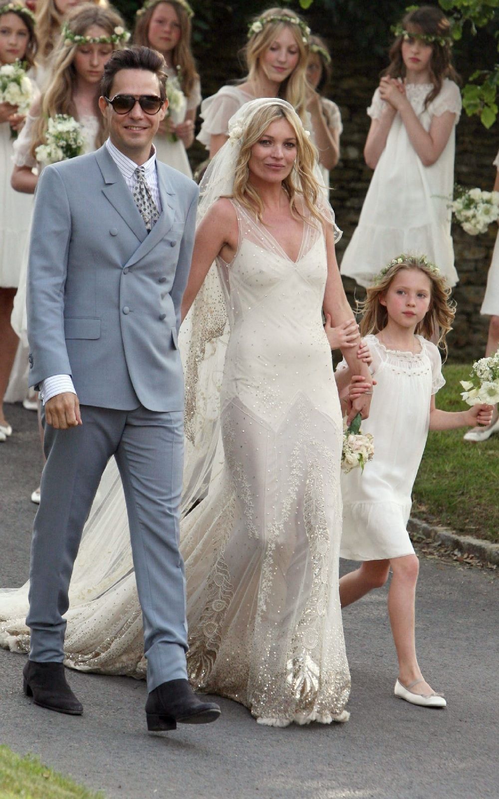 The marriage to Jamie Hince from The Kills didn't last long, but Kate Moss's dress has become one of the most popular ever. For the look of the boho ceremony in a Cotswolds village, the model called John Galliano. The designer, who was recently fired from the Maison Dior following his arrest under the influence of alcohol for violent behaviour and anti-Semitic insults, returned to work just for his friend and created a veiled slip dress inspired by the 1920s, with rhombus cuts and precious embroidery in rhinestones, beads and sequins adding a play of light. Kate's shoes were made by Manolo Blahnik.