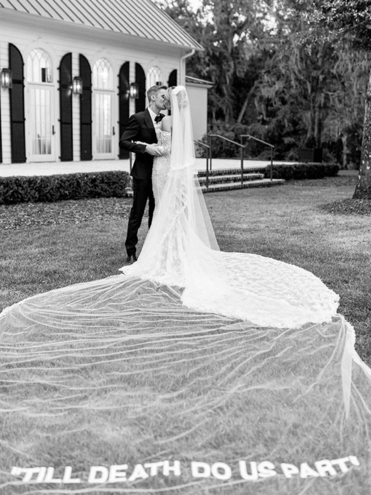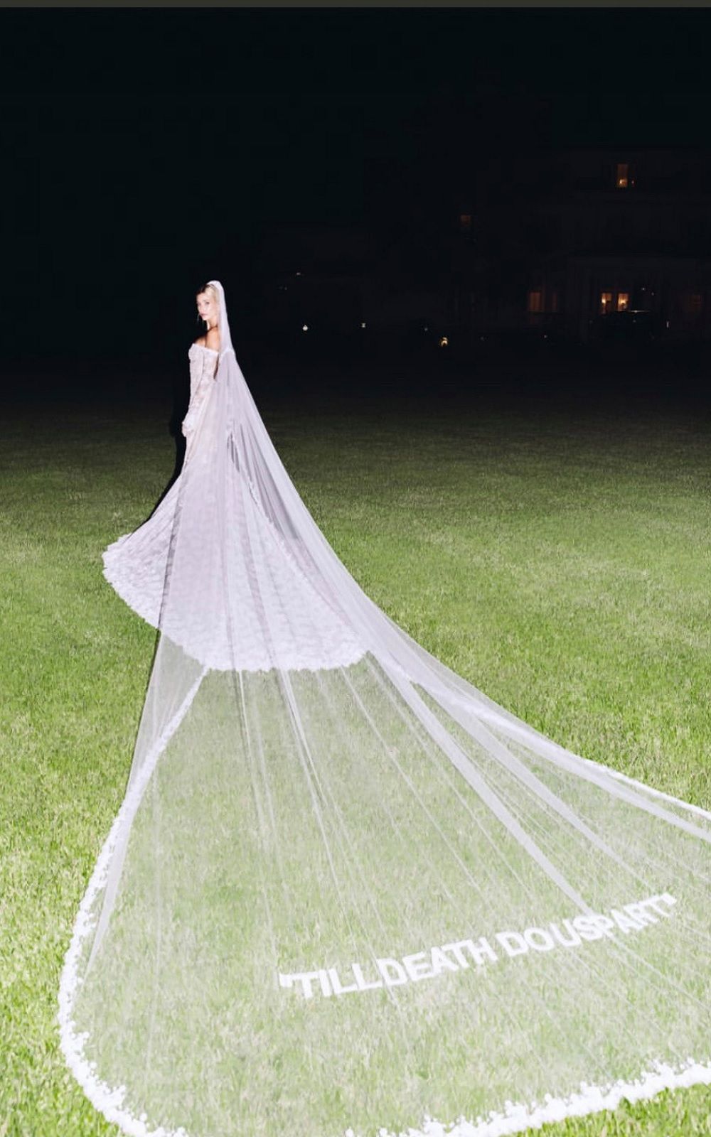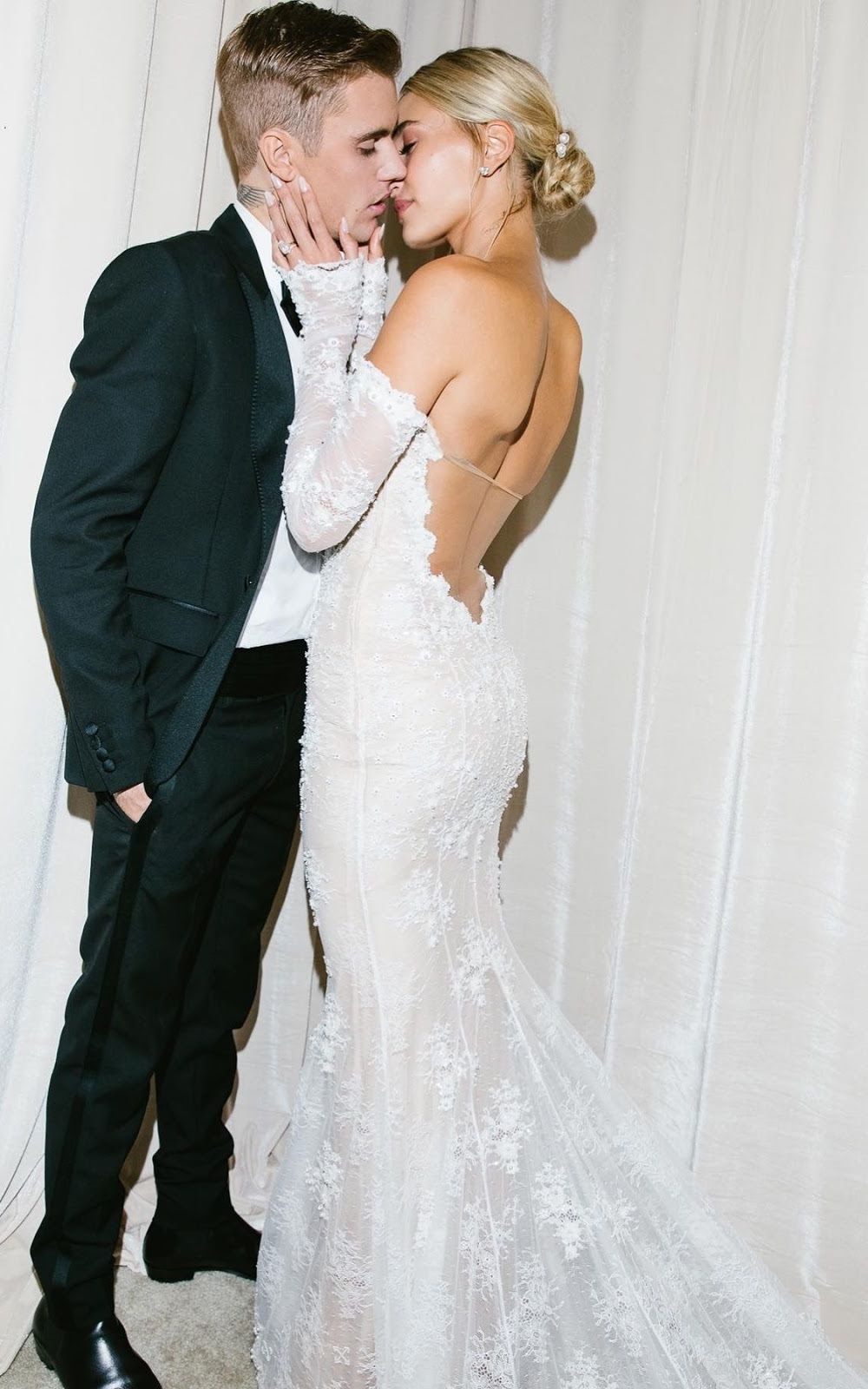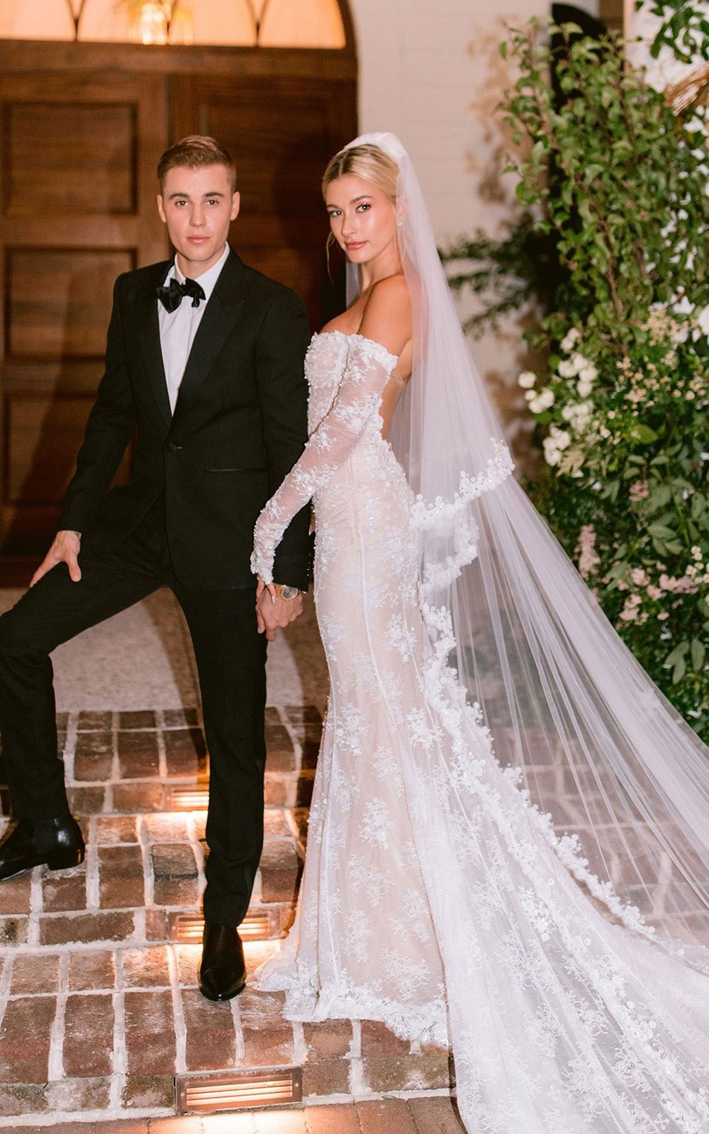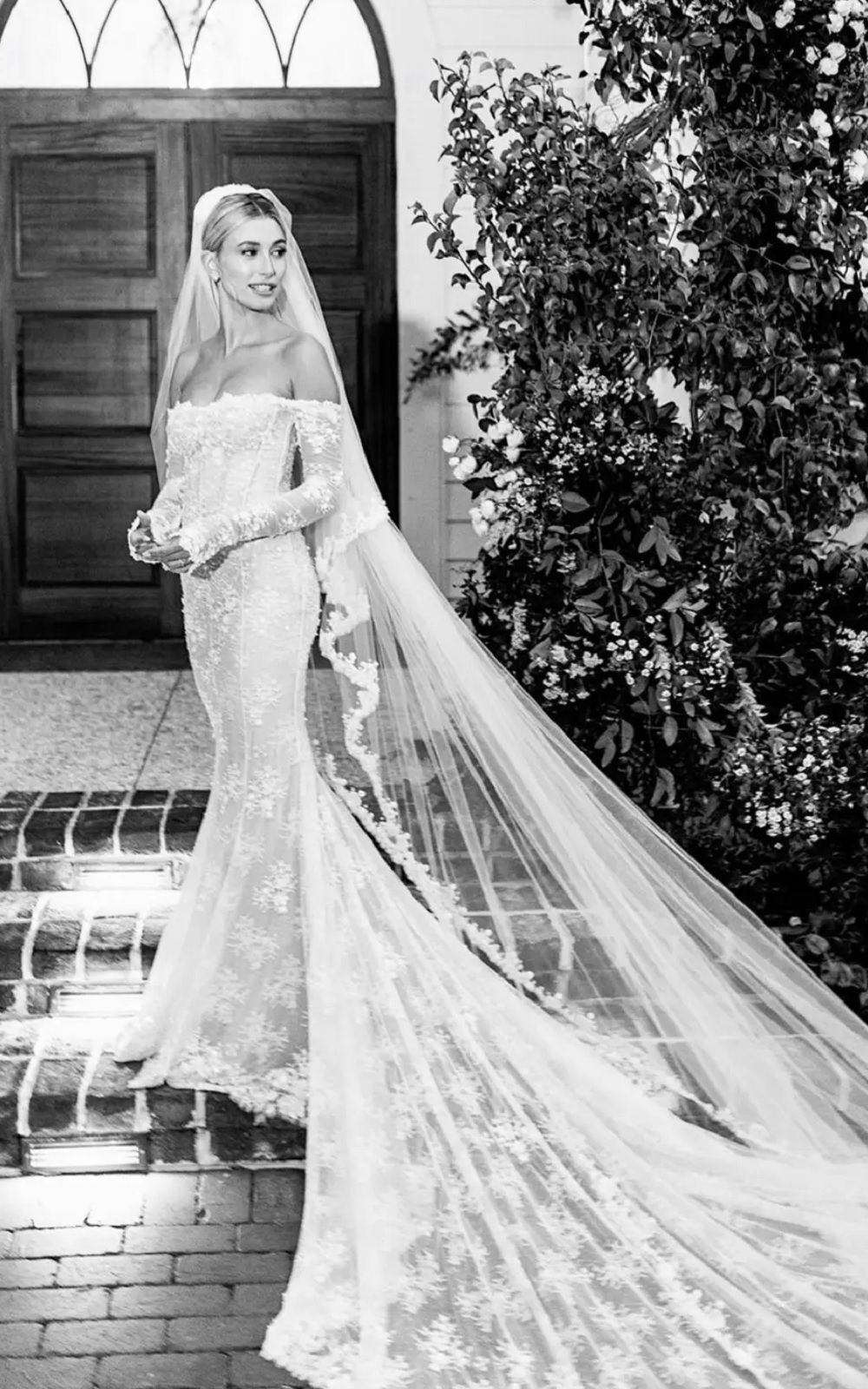 One year after the private ceremony in New York City Hall, Hailey Baldwin and Justin Bieber married in the Somerset Chapel of the Montage Palmetto Bluff Hotel, in South Carolina, in front of 154 guests, friends like Kendall, Kylie and Kris Jenner, Jaden Smith, Joan Smalls and Ed Sheeran. The bride's look was a lace mermaid gown by Virgil Abloh with bare shoulders and back, completed by a long veil featuring, embroidered at the end, the words "Till death do us part". The Off-White designer also created two other outfits for her friend: one silk model similar to the one Carolyn Bessette wore when she married John F. Kennedy Jr. in 1996; while the other recalled the dress designed by Stella McCartney for Meghan Markle's wedding party at Frogmore Cottage. For his tuxedo, Justin, instead, chose Celine.