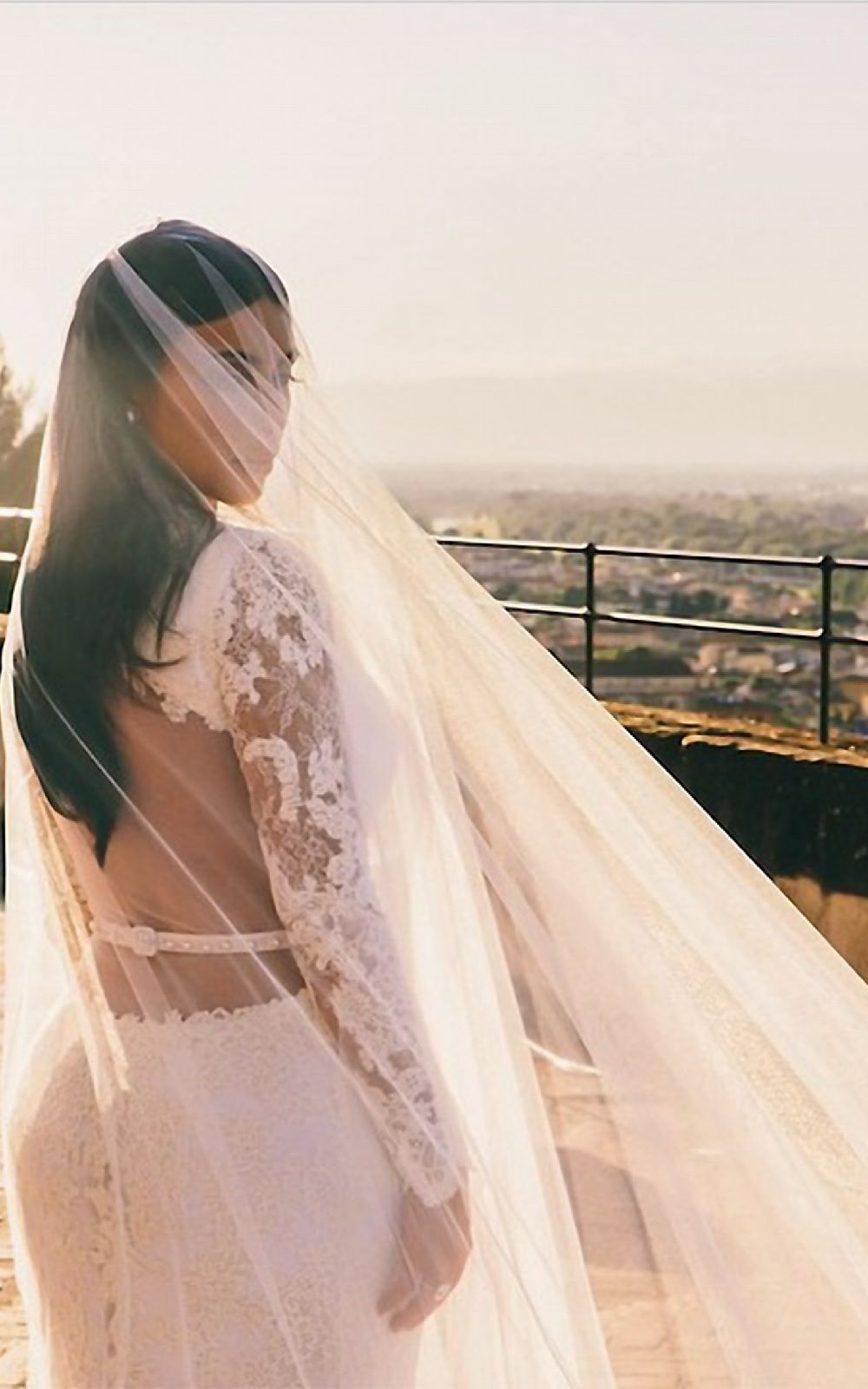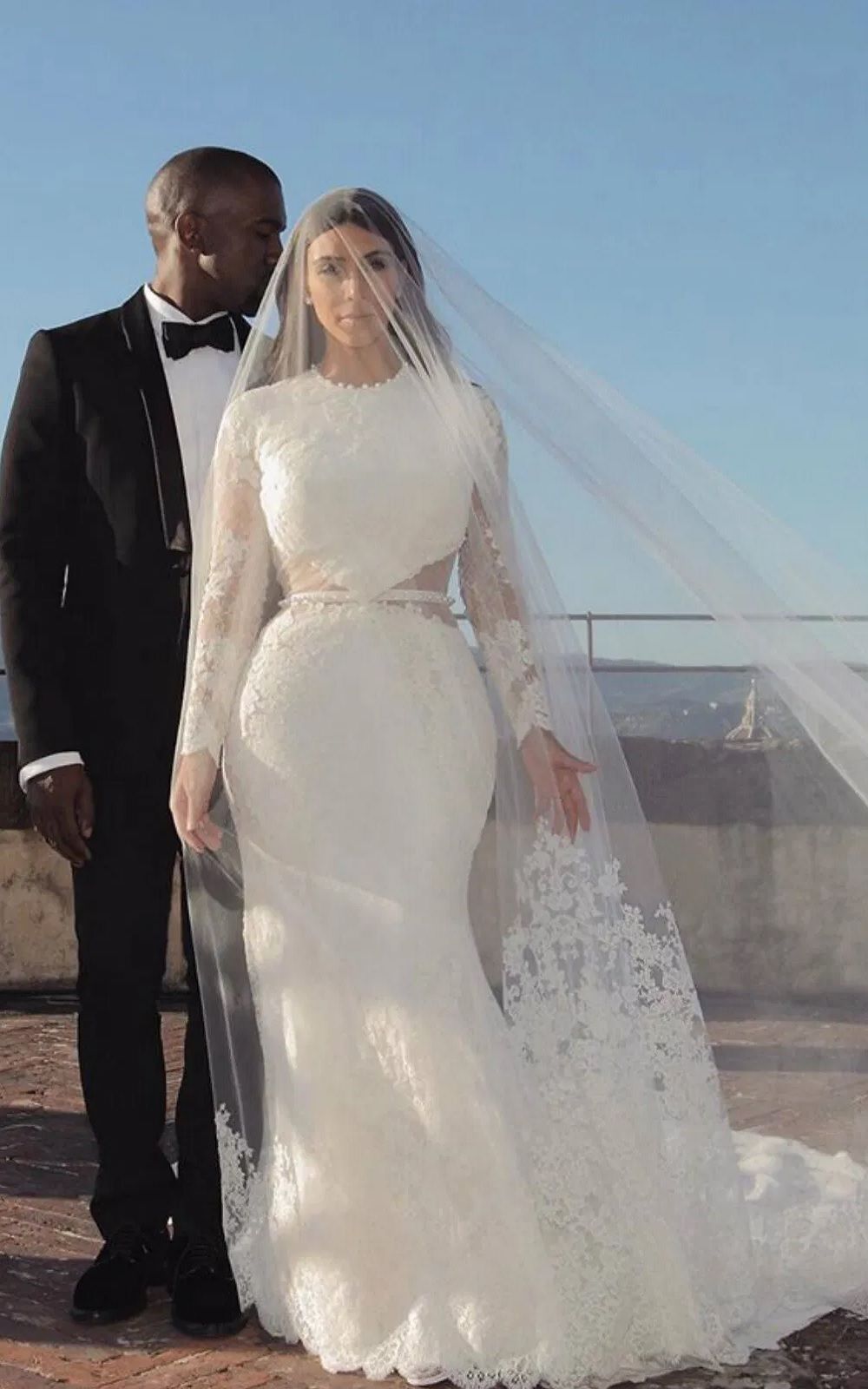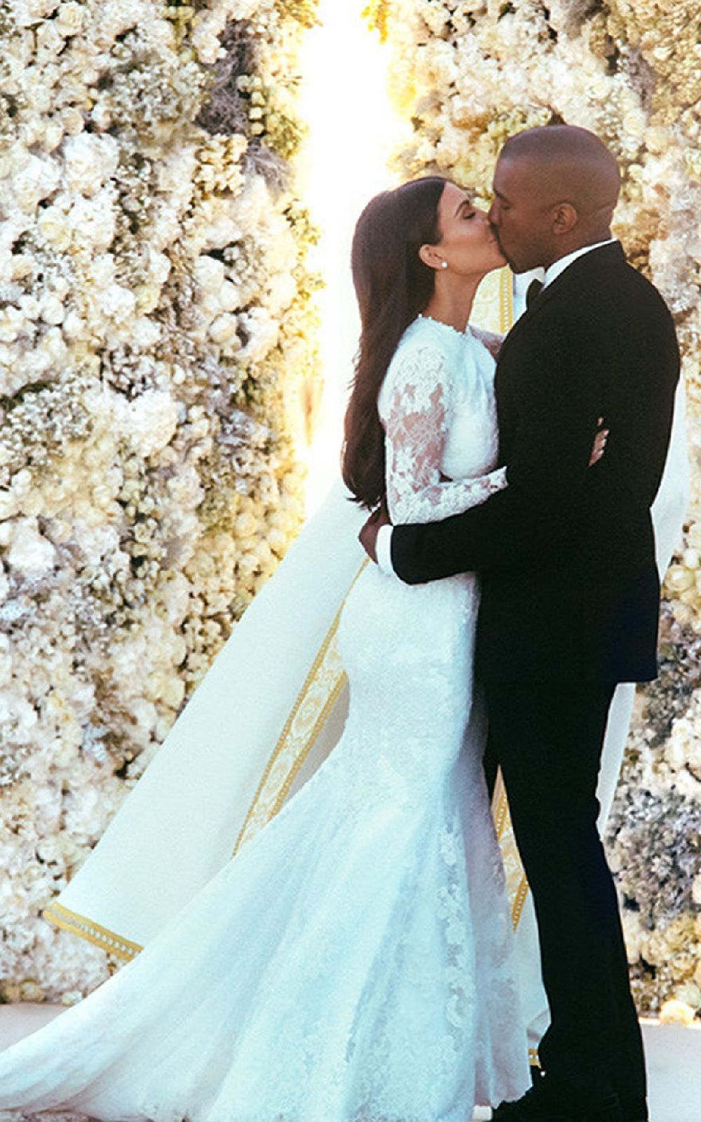 Following a bachelorette party and a pre-wedding dinner party in Paris, Kim Kardashian and Kanye West flew to Florence. On May 24th Kim walked down the aisle of the majestic Forte Belvedere with the voice of Andrea Bocelli and dressed in a white Givenchy lace mermaid gown by Riccardo Tisci. The designer also created the groom's tuxedo and the dress for North.