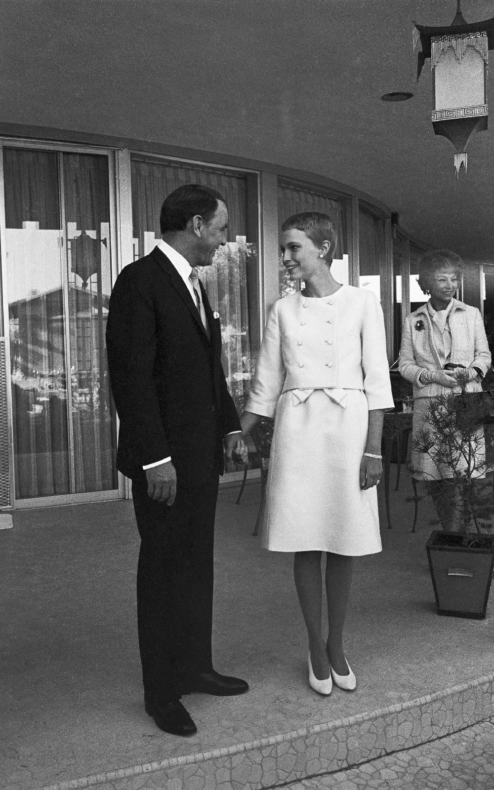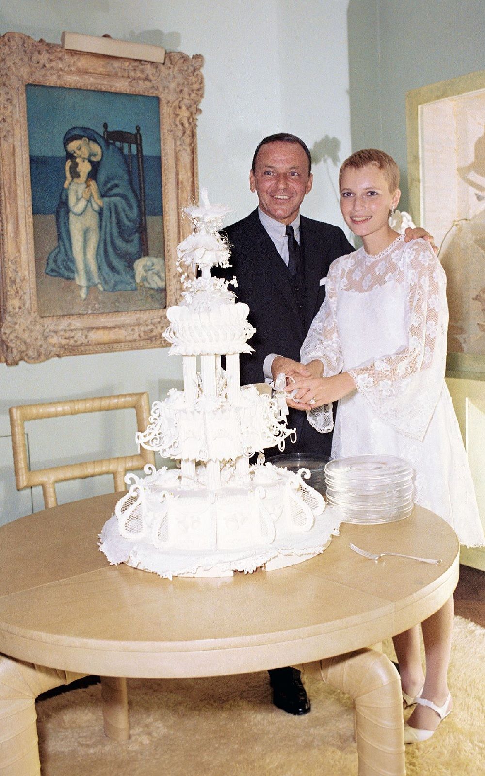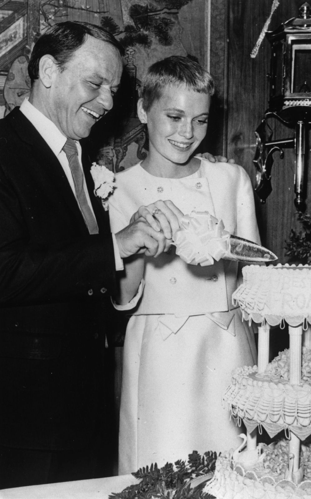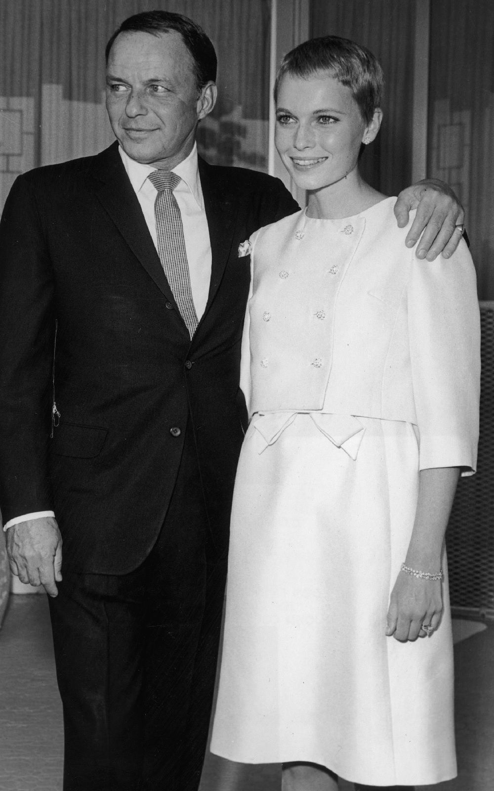 Mia Farrow Mia Farrow married Frank Sinatra on July 19, 1966. The couple, who had met two years earlier on the set of the film Express, caused a scandal: he was 49 and on his third marriage and she was only 21. For the ceremony in Las Vegas, the actress wore the iconic Rosemary's Baby pixie cut and a simple white tailored outfit consisting of a skirt fitted at the waist with a bow belt and a double-breasted cropped jacket.