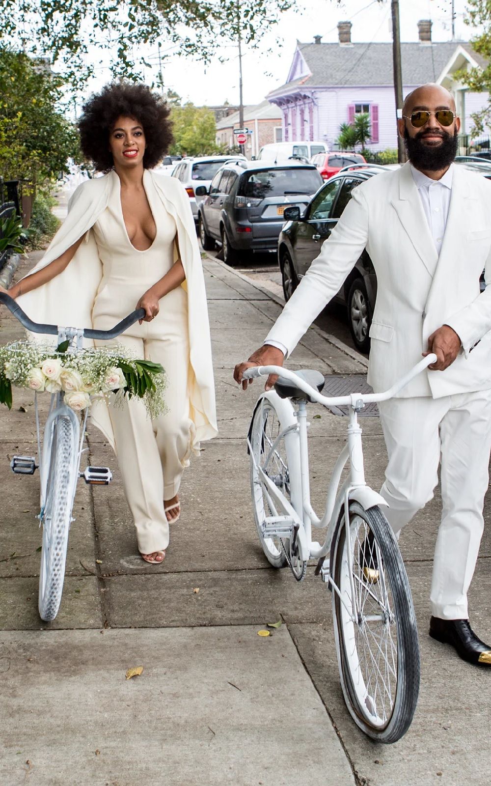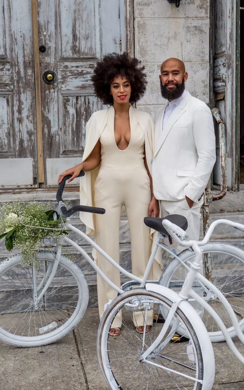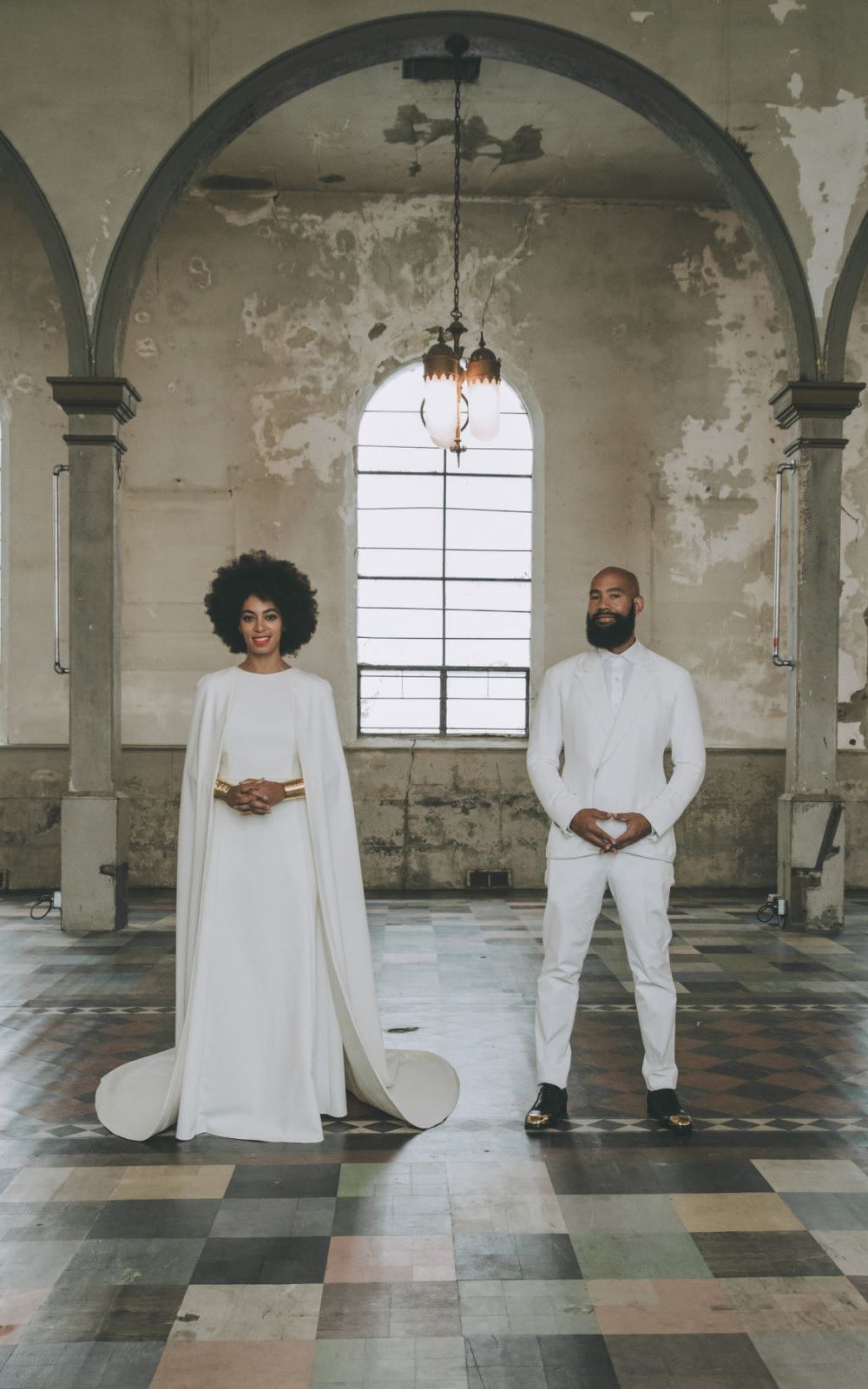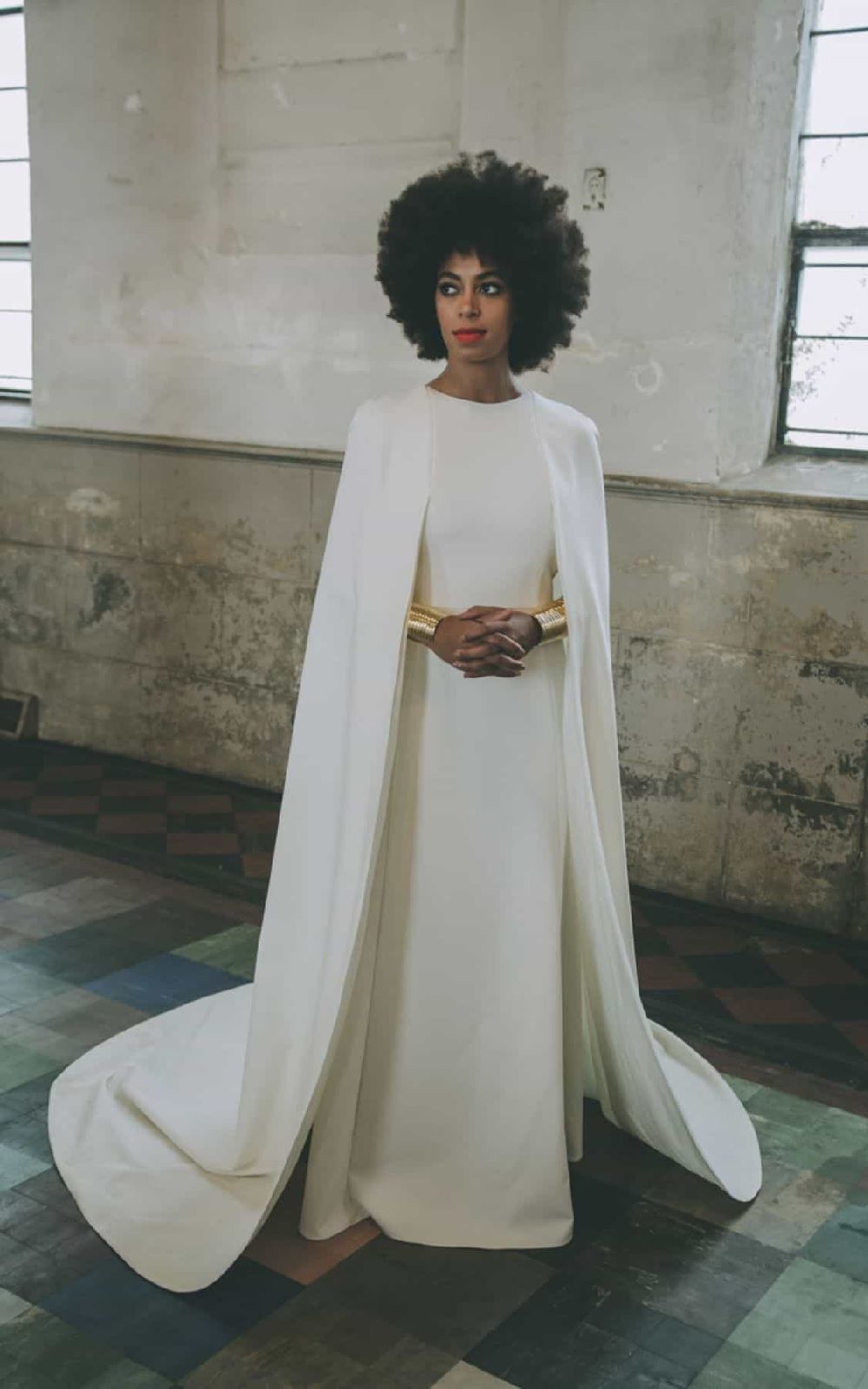 Solange Knowles proves to be it-girl also on her wedding day. The artist arrived Holy Trinity Church of New Orleans on a bicycle wearing a cream-colored jumpsuit by Stephane Rolland featuring a deep V-neckline and a cape. The cape was also the focus of the outfit chosen by Solange for the ceremony: a dress created by Humberto Leon for Kenzo, golden cuff bracelets by Jill for Lady Grey and orange-red lipstick.