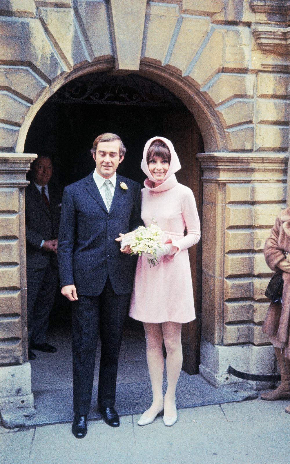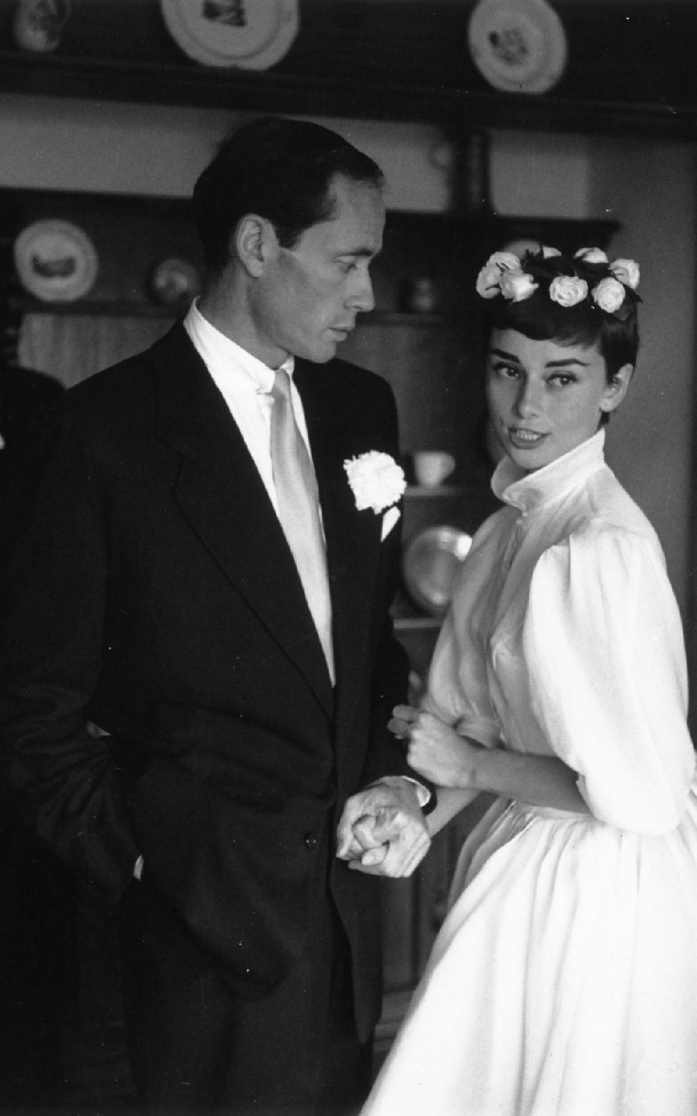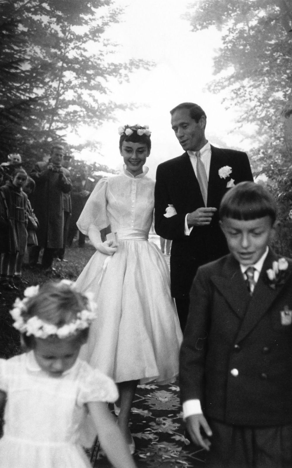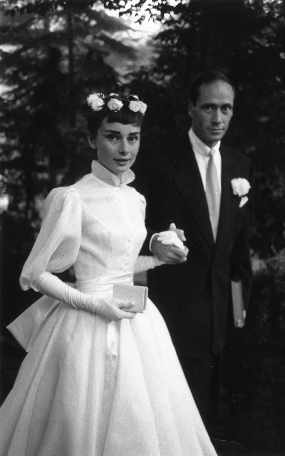 Audrey Hepburn cancels her wedding with James Hanson (she already had a Sorelle Fontana gown ready) to marry the actor Mel Ferrer she met at a Gregory Peck's party. During the ceremony, in Switzerland, she opts for a simple and refined creation by Pierre Balmain with puffy sleeves and a very narrow waist, embellished with a crown of white roses in her hair.In 1969, the star expressed her love to her second husband, the Italian psychiatrist Andrea Dotti, wearing a pink mini dress by Hubert de Givenchy matched with headscarves, gloves, white stockings and flats.