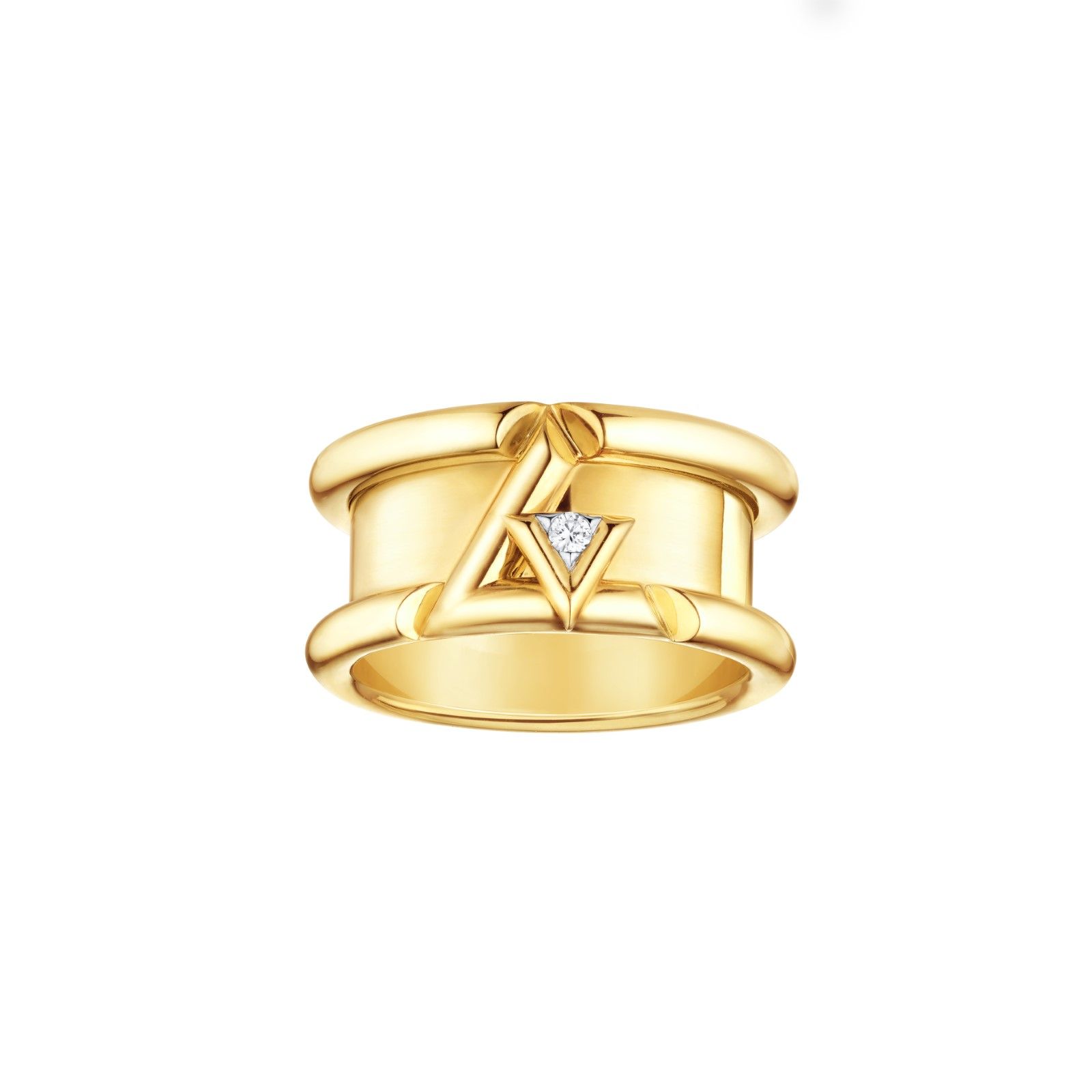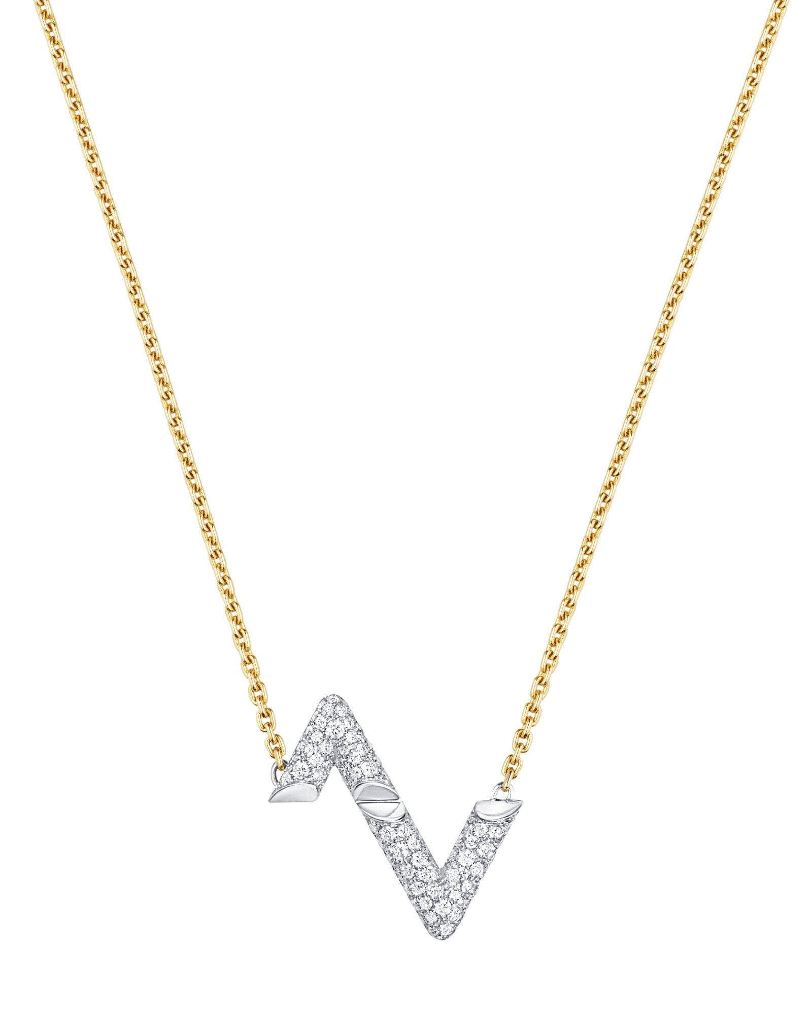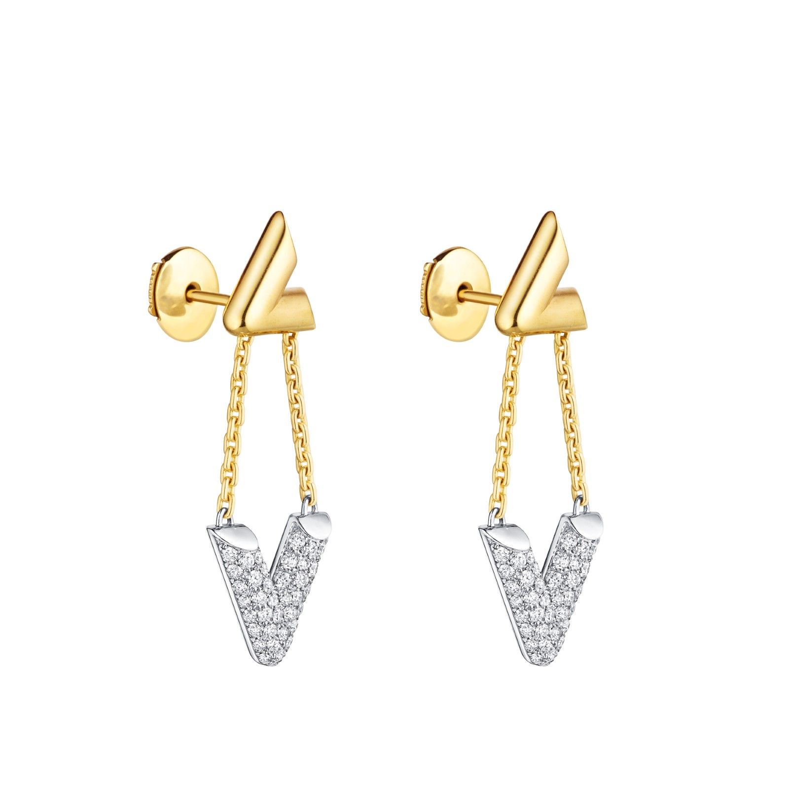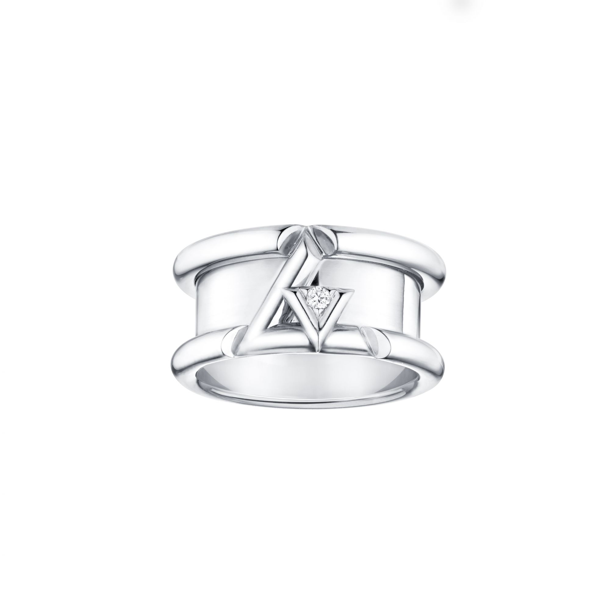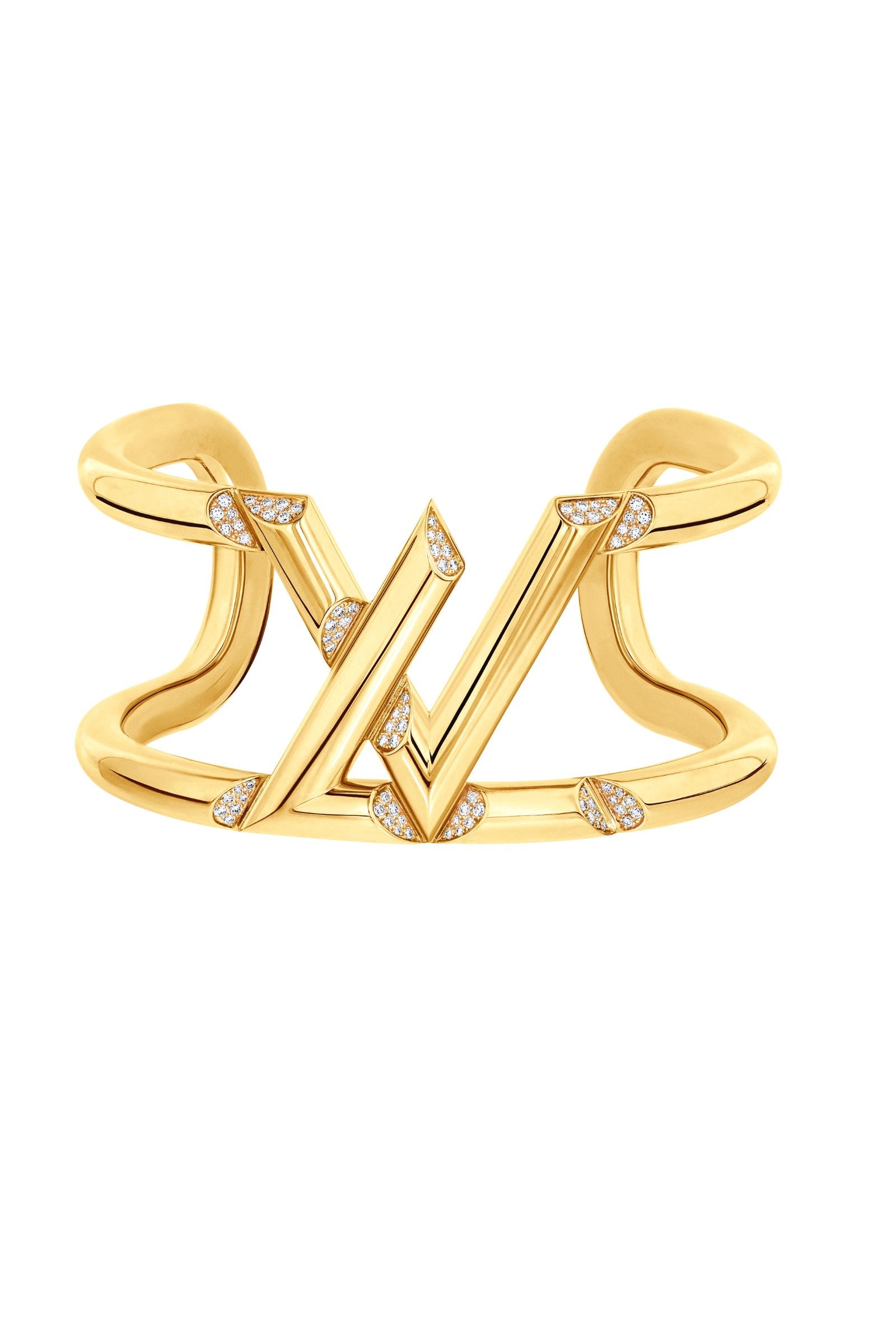 In the first chapter, L and V show themselves in their purest form. The lines cut through space, creating angles and conformations built through the use of gold and diamonds, following the symbolism of lightning and electricity. For the second part of the collection, however, L and V become chain links, volumes and finishes. The initials materialize one series after another, emerging multiplied as in a prism or tubular structures.